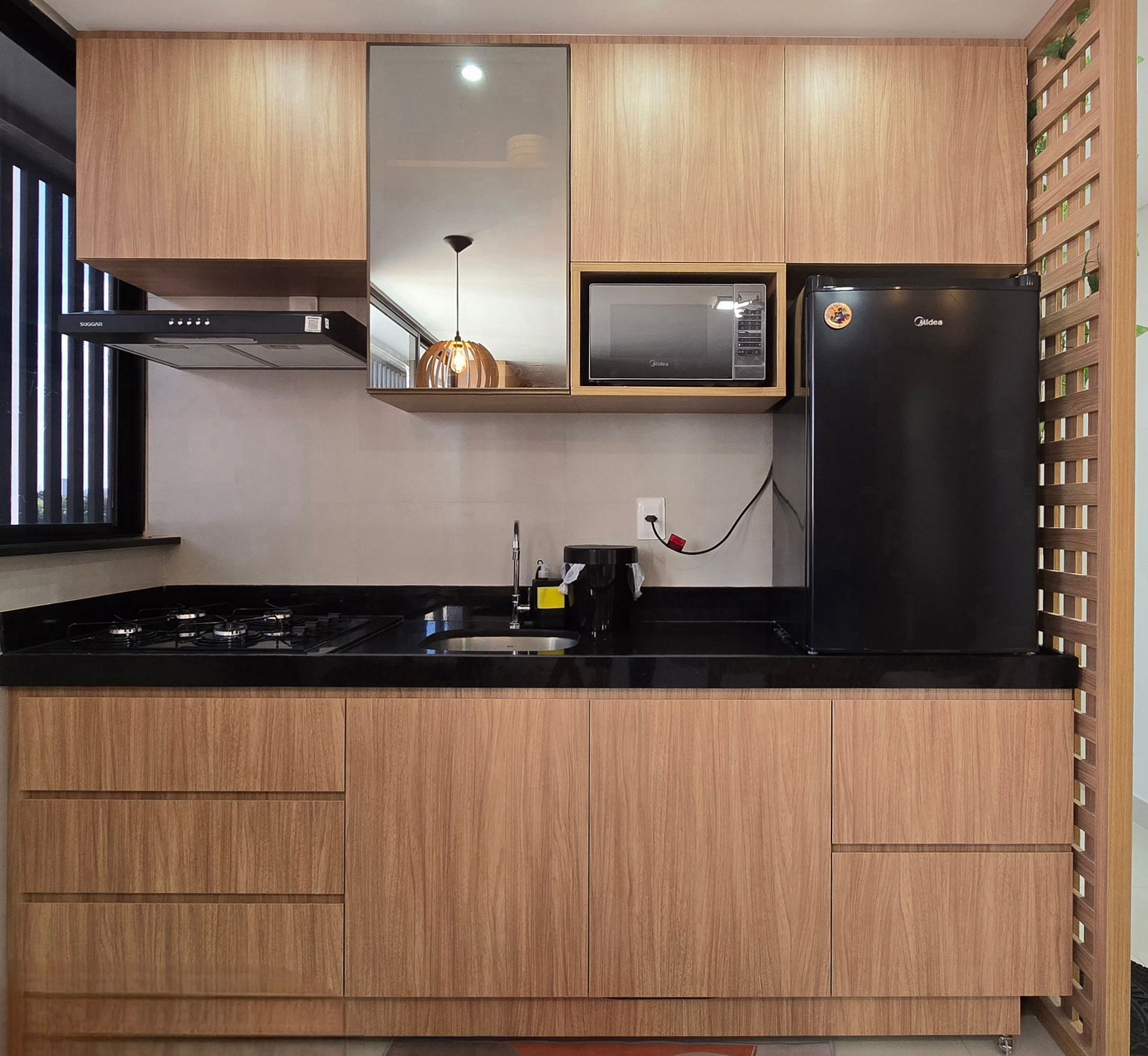 Com espaço para até três pessoas, o ambiente traz a sensação de estar em casa: cama de casal aconchegante, sofá-cama para mais um hóspede e cozinha equipada com frigobar, micro-ondas, fogão, panelas e utensílios. A estrutura é pensada para receber desde quem vem a trabalho até quem busca lazer na cidade.