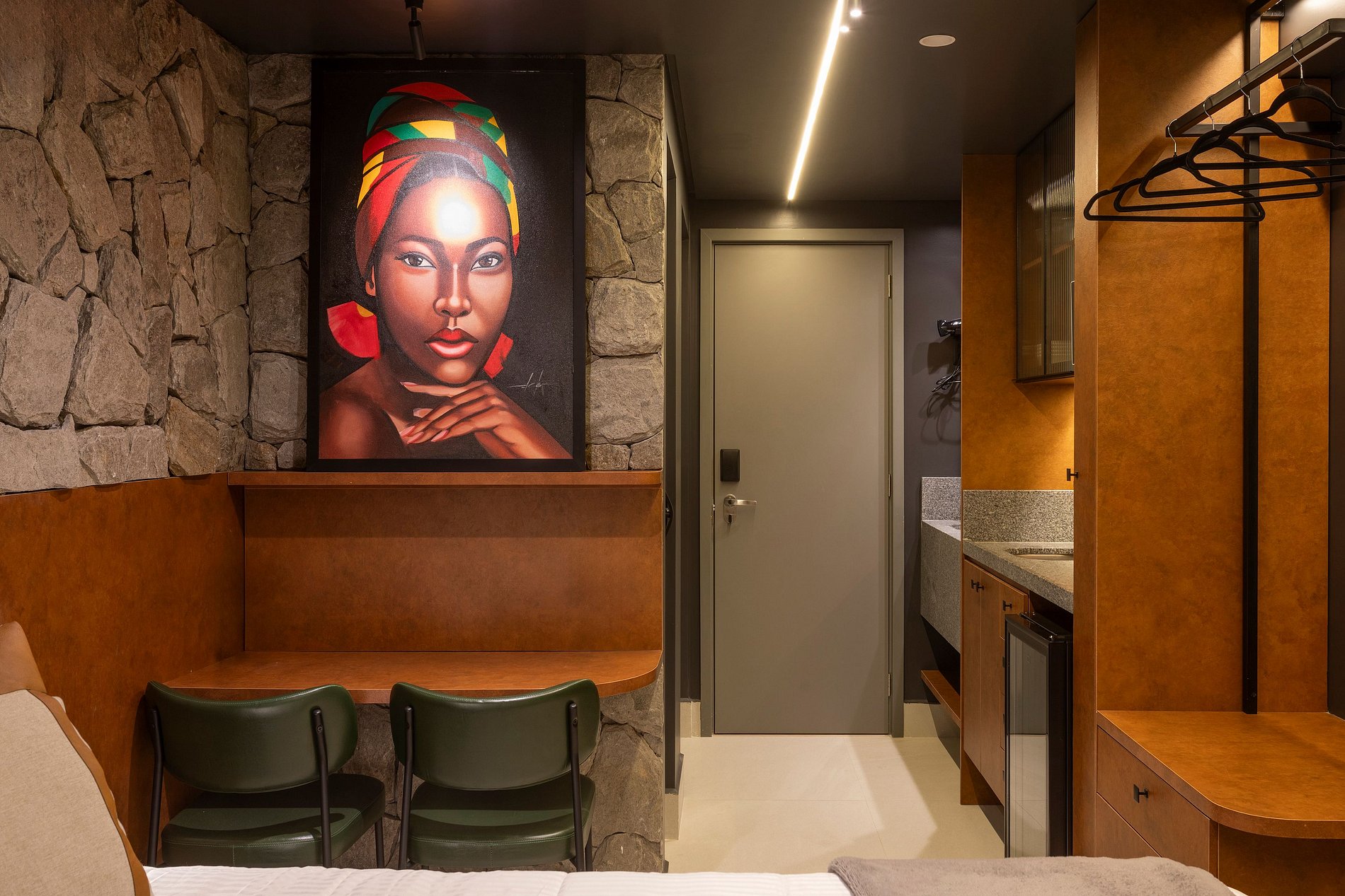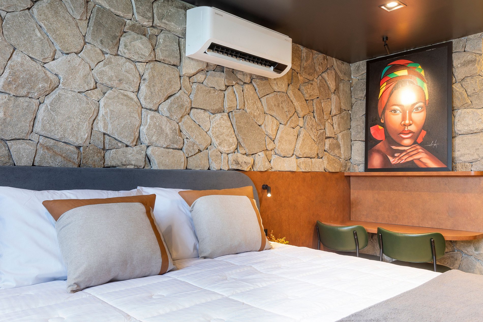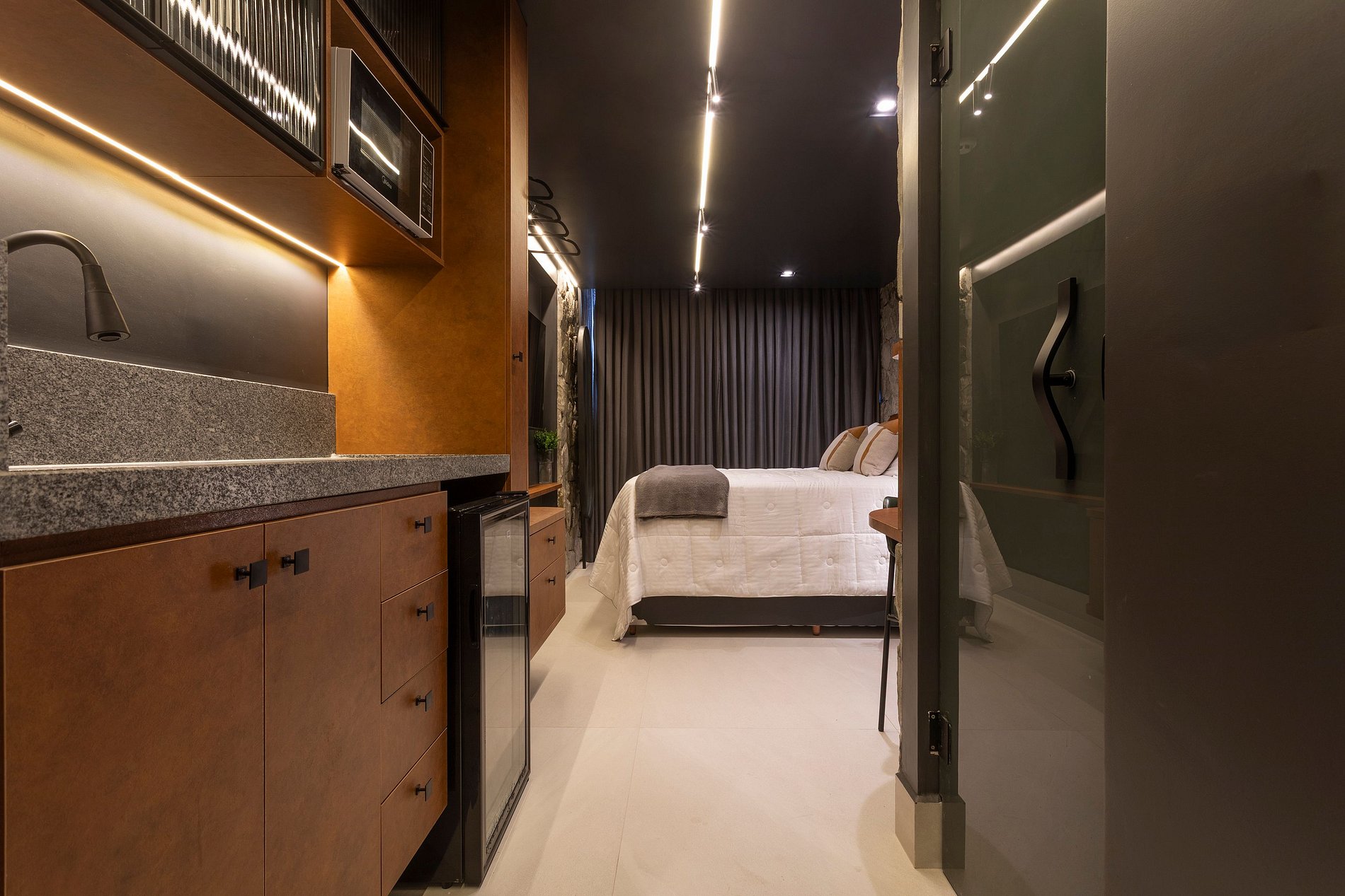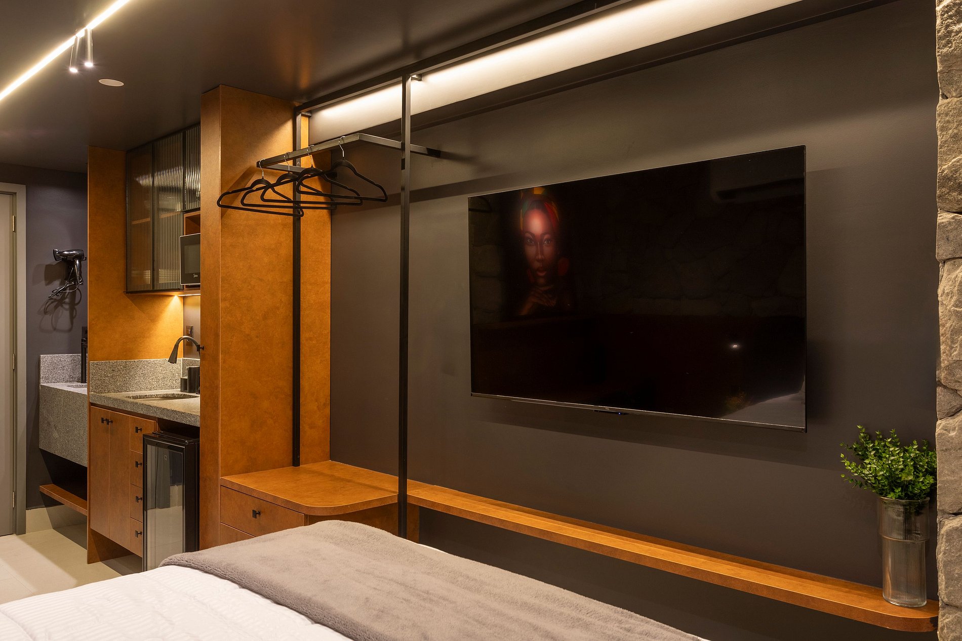 O flat tipo studio une design moderno e aconchego em um ambiente ideal para duas pessoas. A cama Queen (com cama auxiliar) garante noites de descanso profundo, enquanto a cozinha — equipada com frigobar, fogão de indução, micro-ondas, cafeteira, airfryer, liquidificador, sanduicheira, panelas e utensílios — oferece a liberdade de preparar desde cafés rápidos até jantares especiais. Secador de cabelo e móveis planejados completam os detalhes que fazem a diferença na rotina.