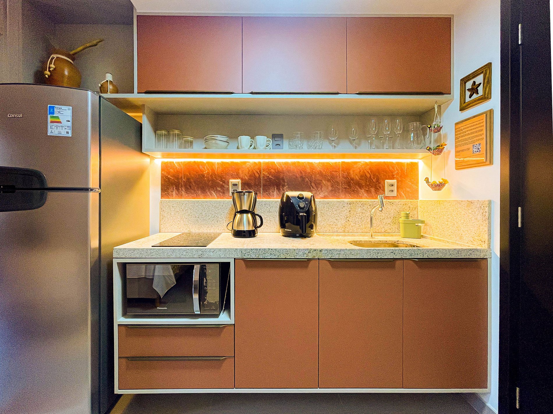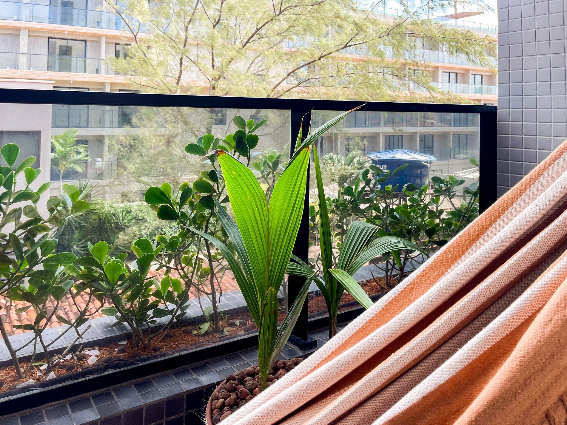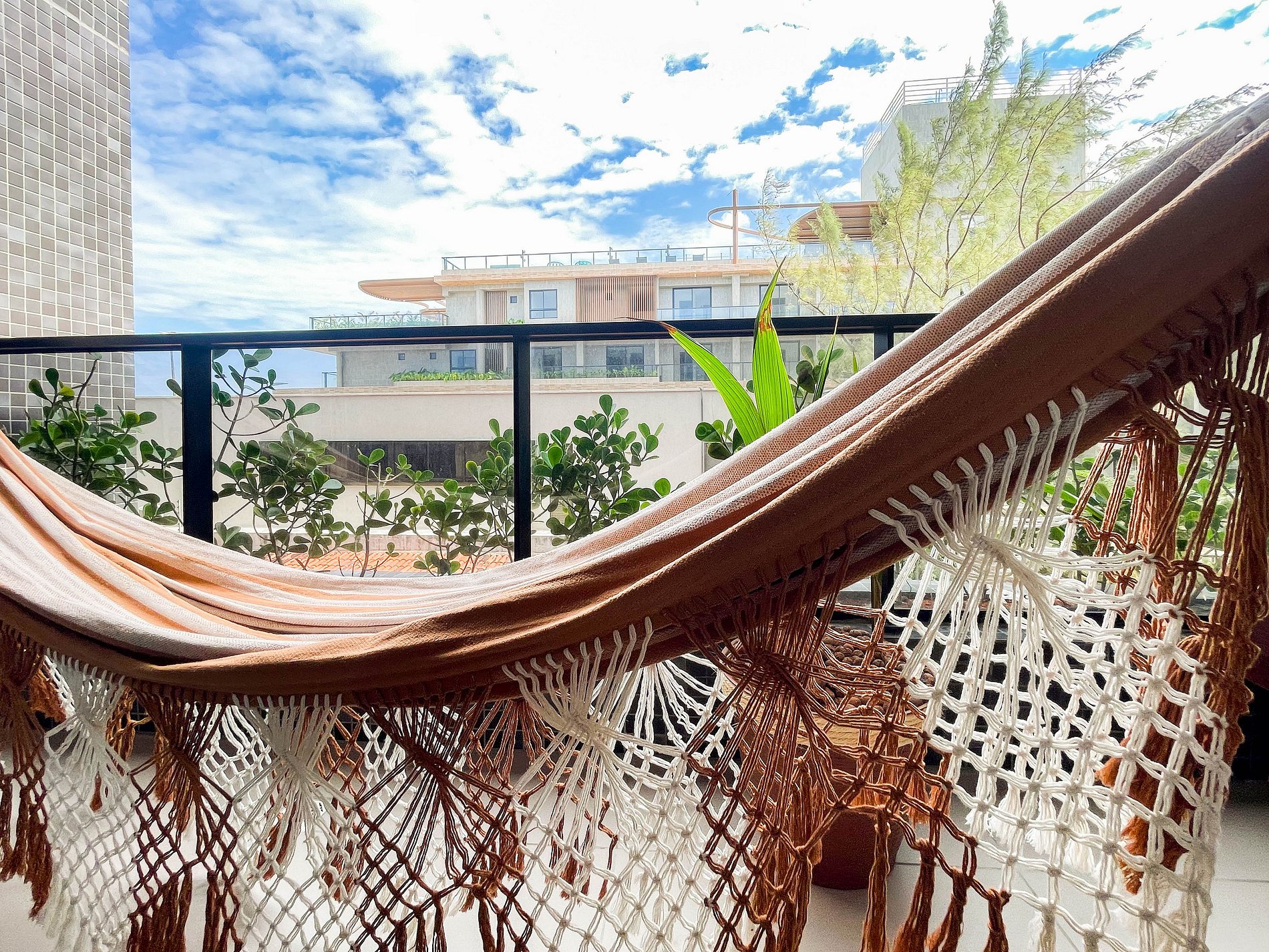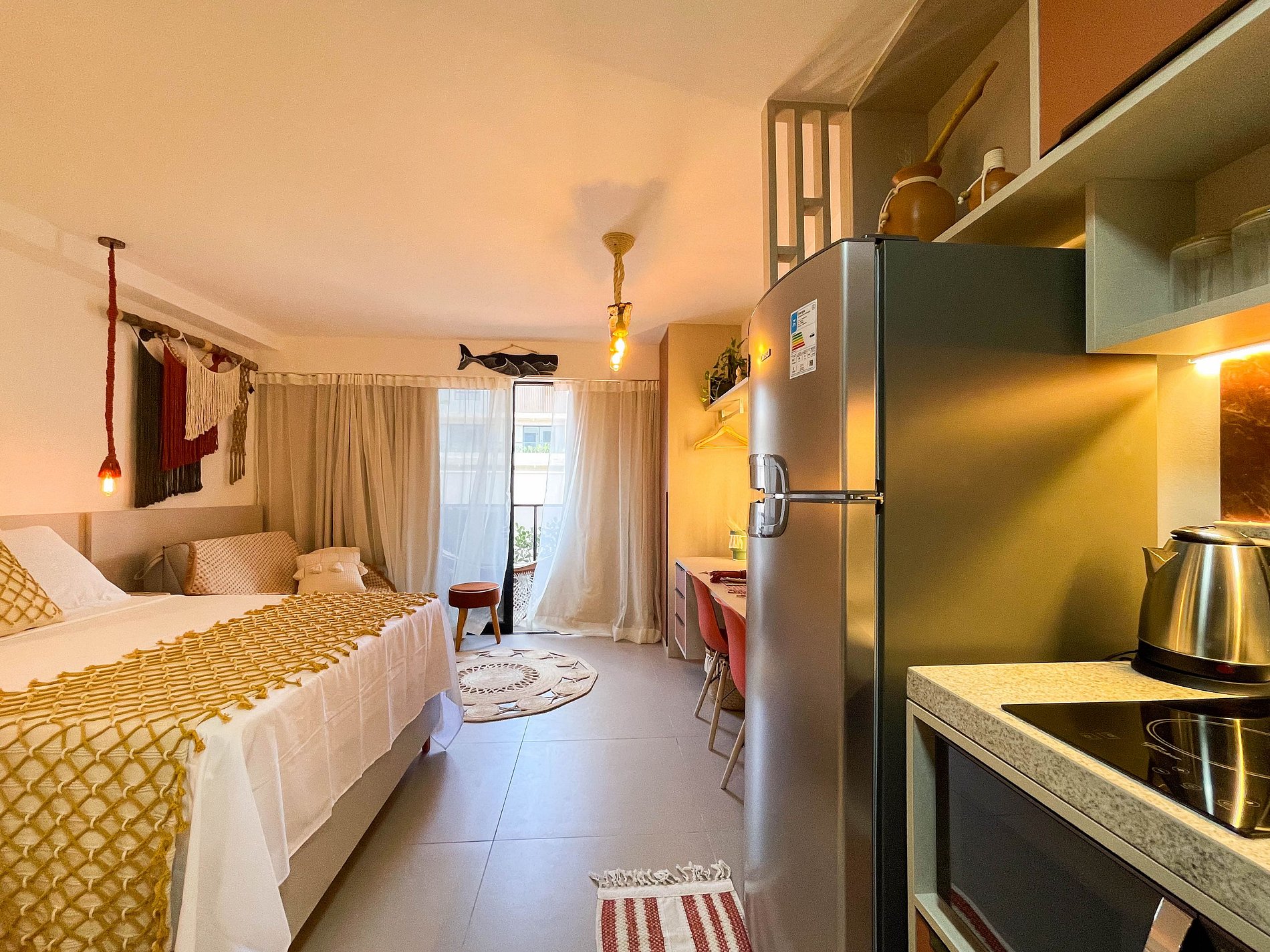 A varanda com rede é o convite diário para desacelerar, sentir a brisa e apreciar a vista lateral para o mar. No interior, o ambiente foi projetado para transmitir acolhimento — móveis planejados em tom terracota, iluminação suave e decoração funcional criam uma atmosfera tranquila e sofisticada.