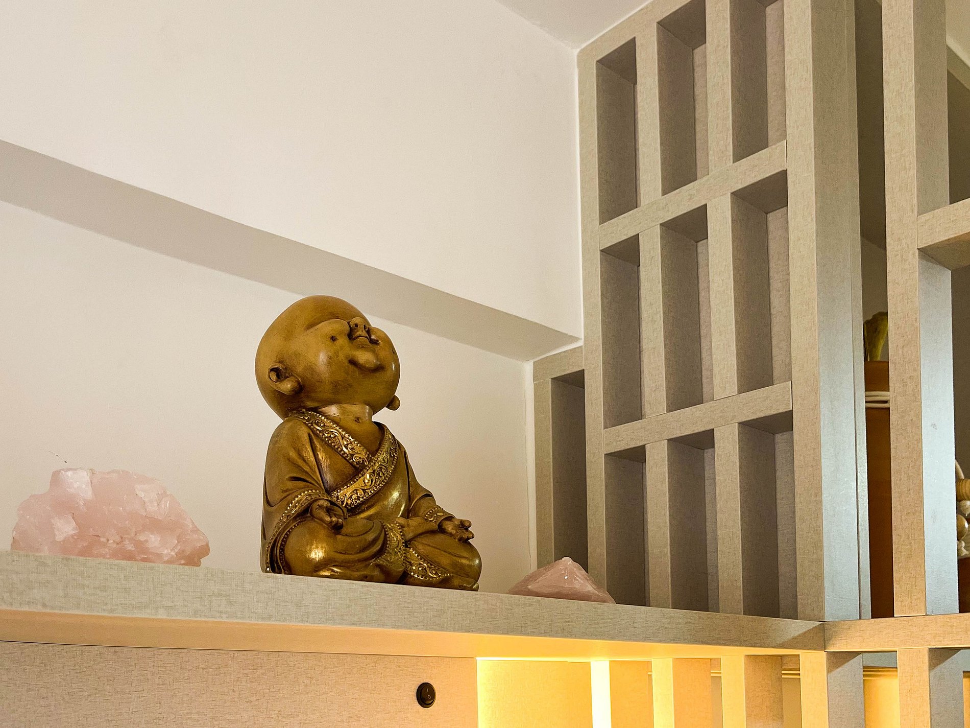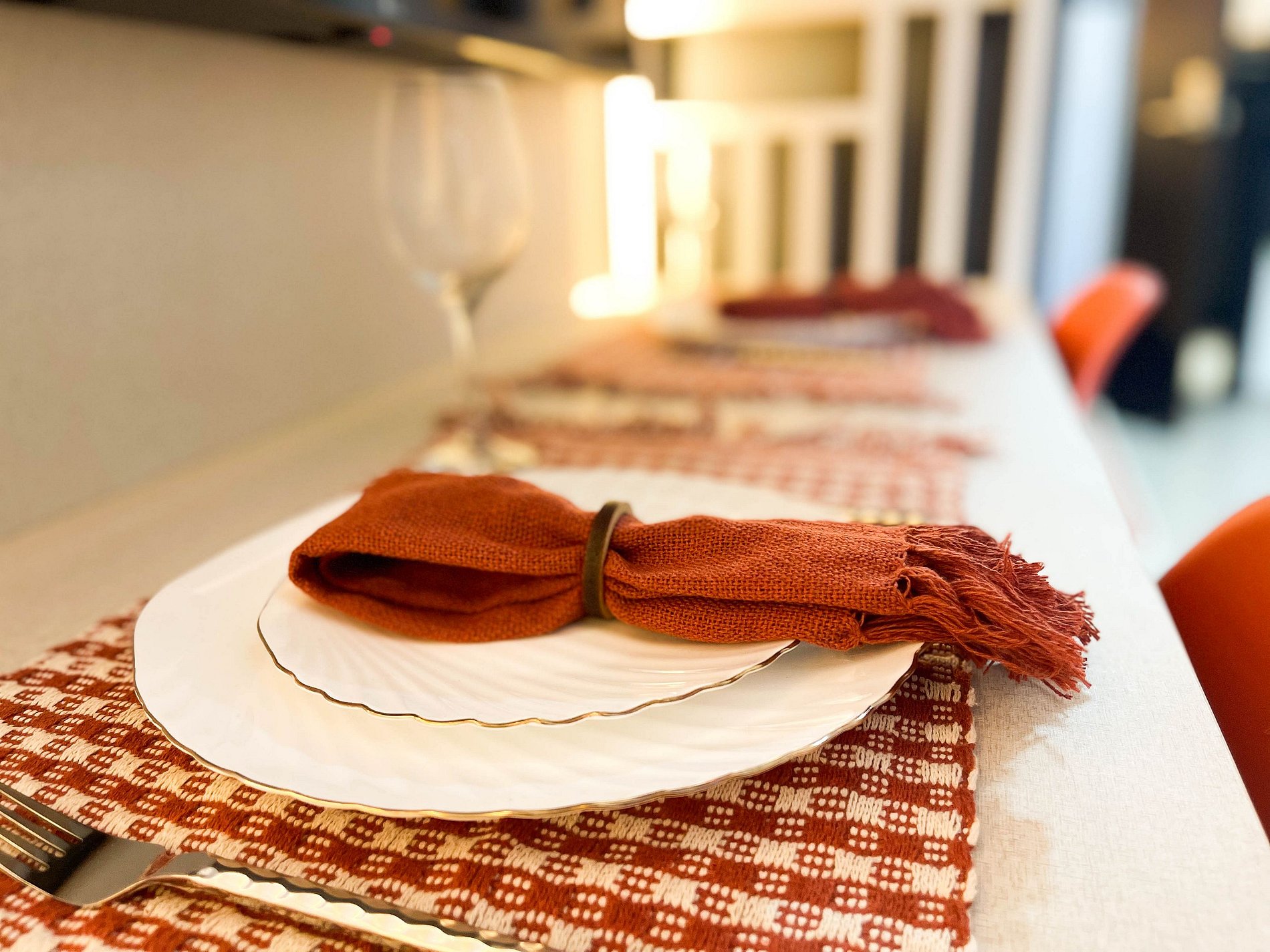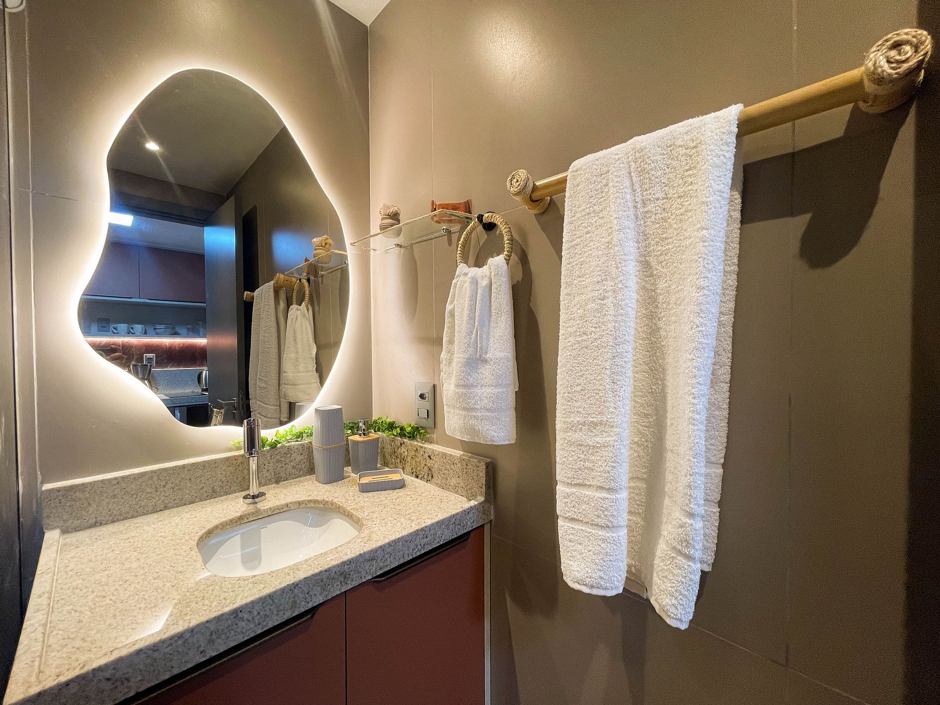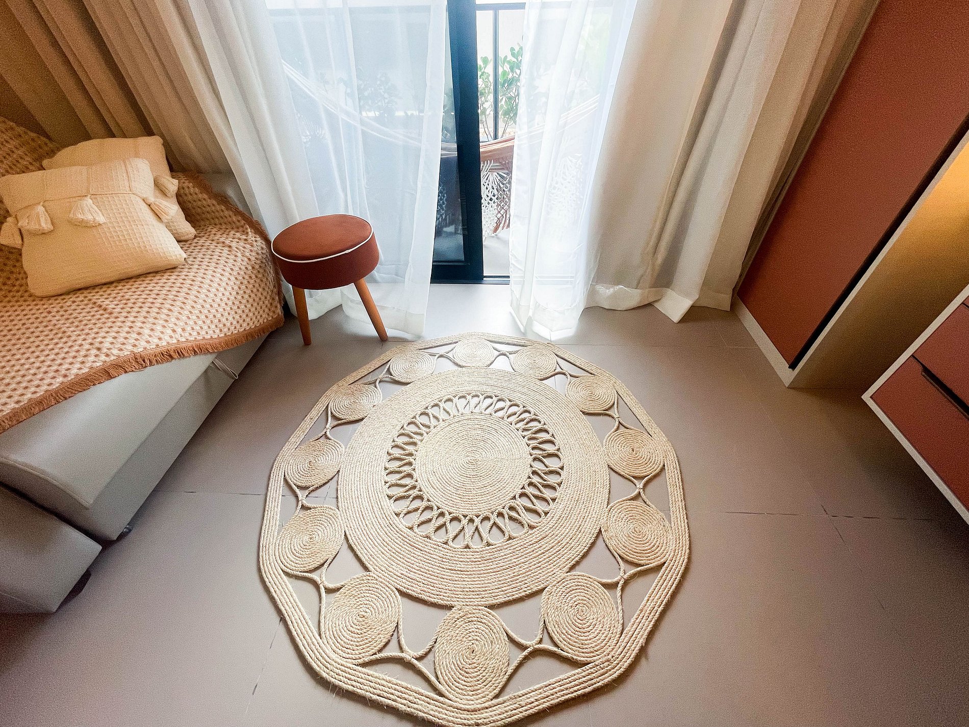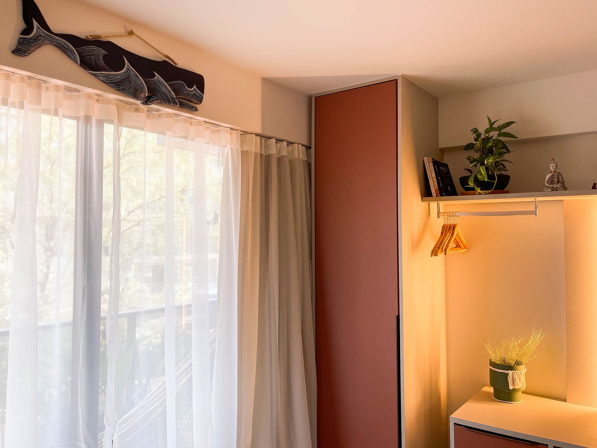 A varanda com rede é o convite diário para desacelerar, sentir a brisa e apreciar a vista lateral para o mar. No interior, o ambiente foi projetado para transmitir acolhimento — móveis planejados em tom terracota, iluminação suave e decoração funcional criam uma atmosfera tranquila e sofisticada.
