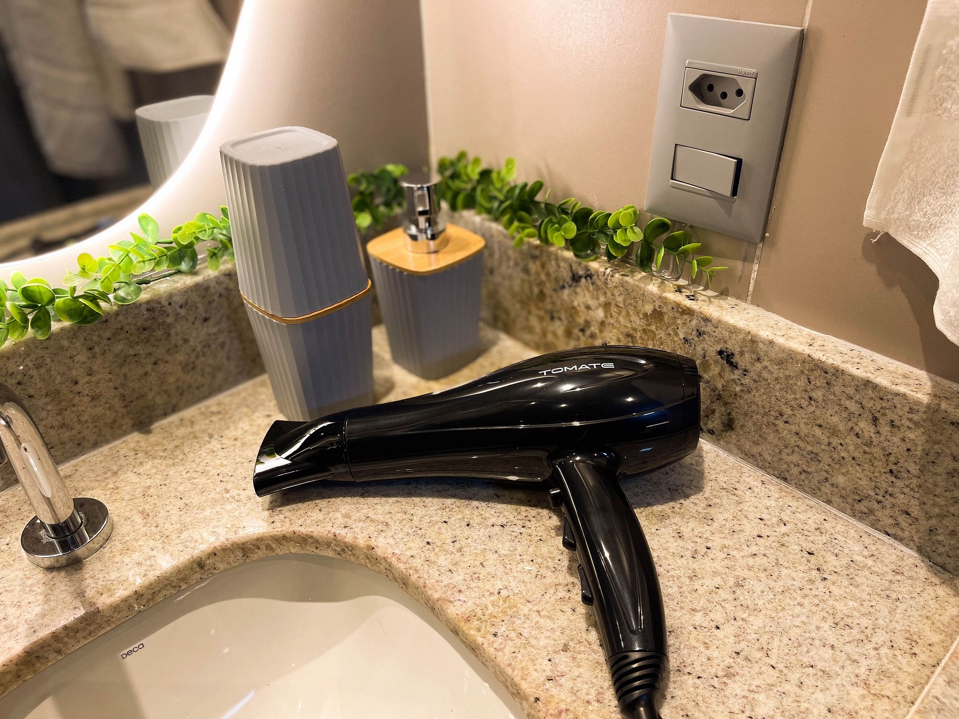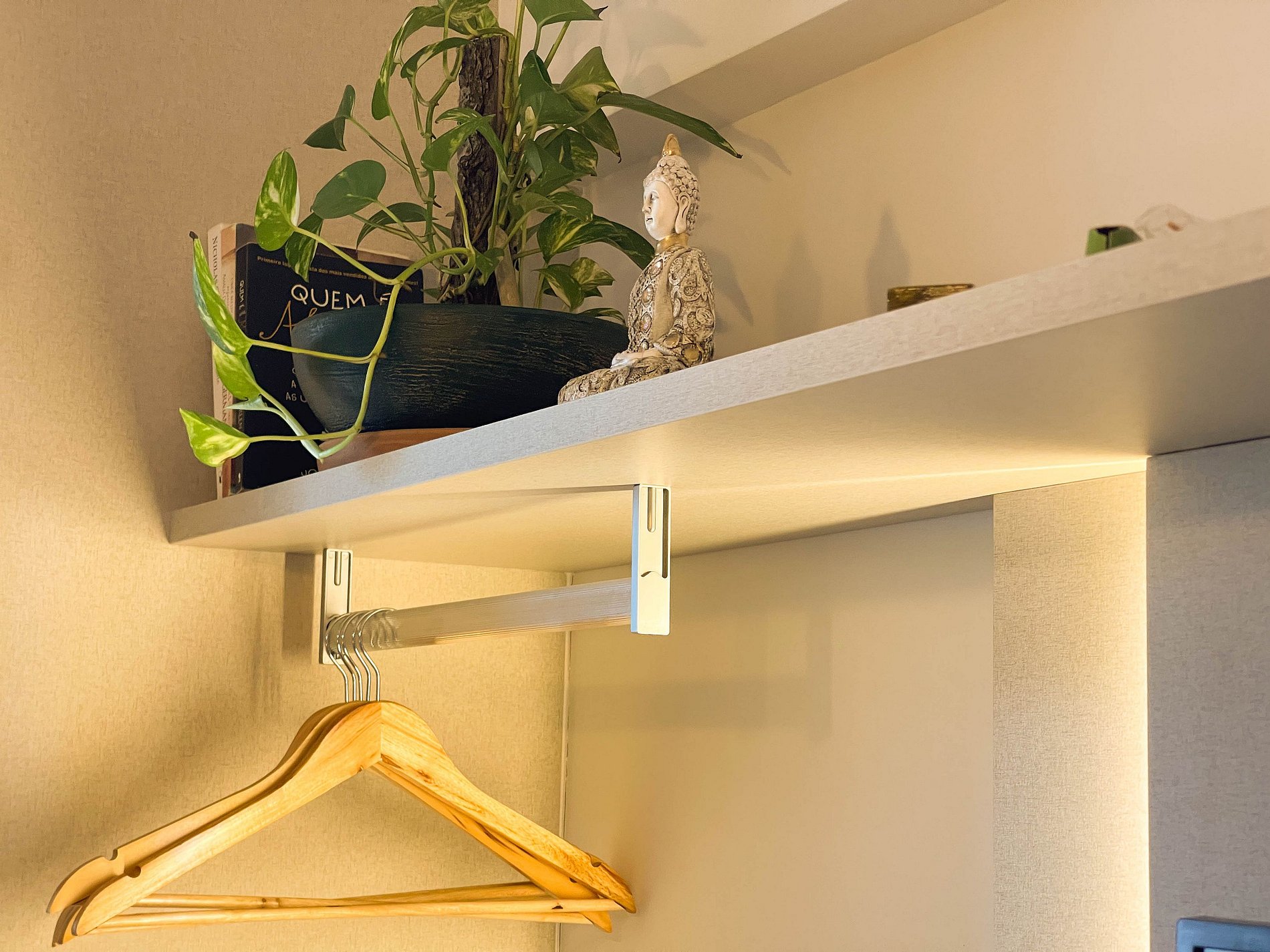 O ar-condicionado Midea de 12.000 BTUs mantém o ambiente agradável, e a cortina blackout garante descanso total. Há ainda ferro de passar, secador de cabelo e cabides para maior praticidade.