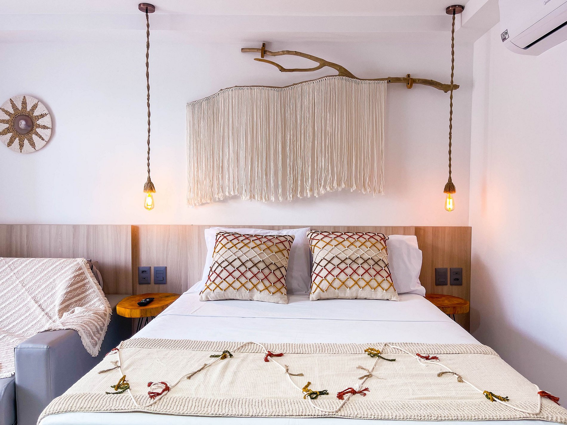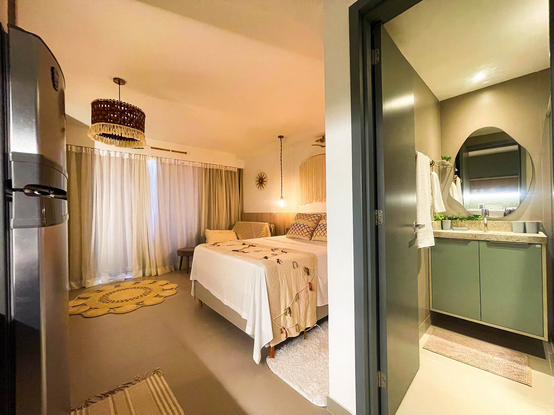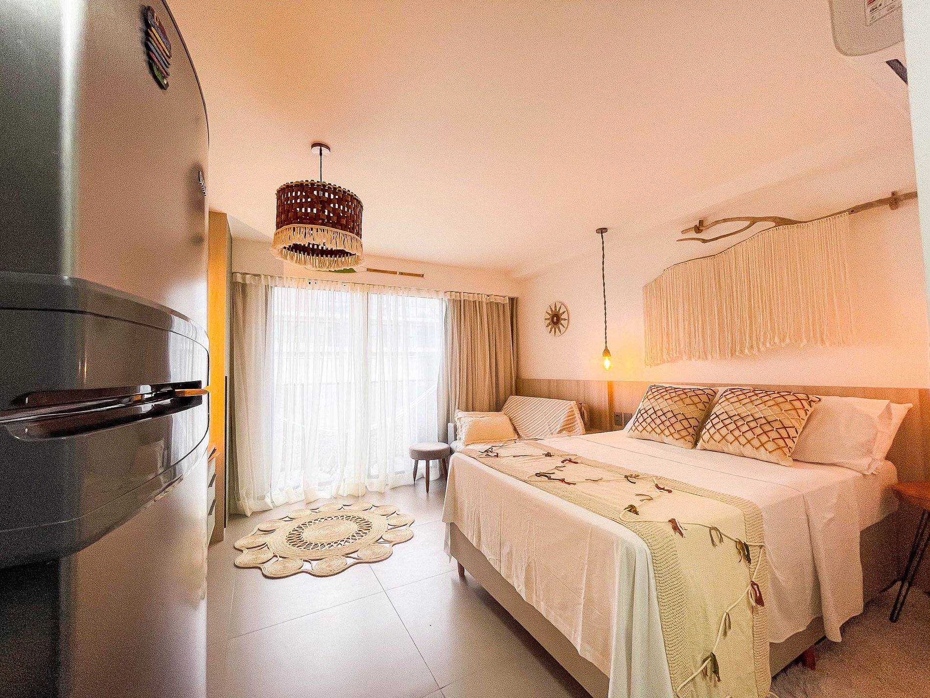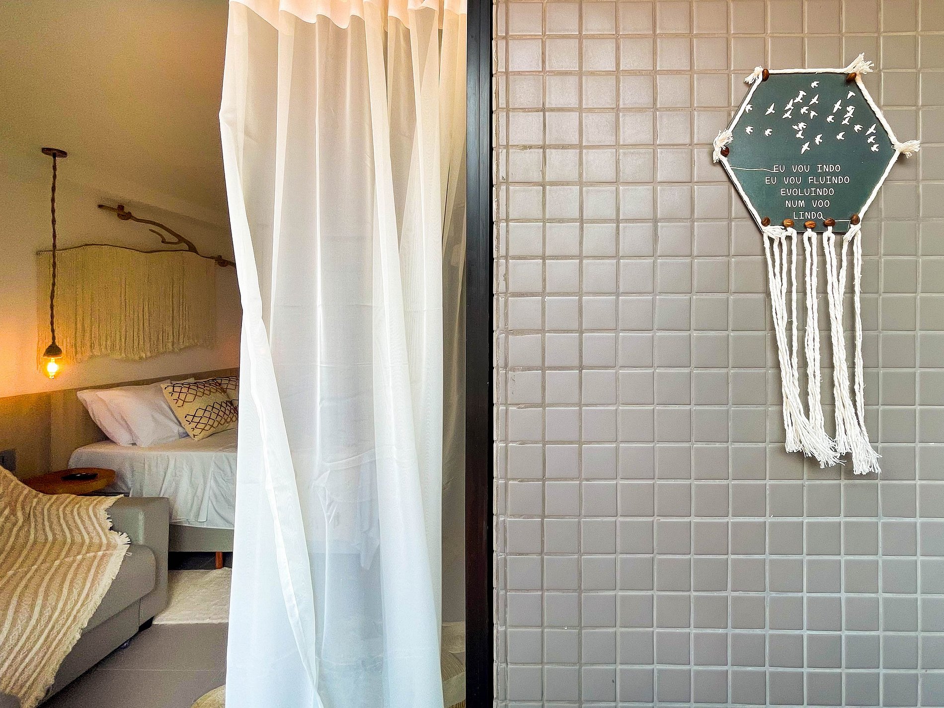 O ambiente de descanso conta com uma cama aconchegante, cortina blackout e ar-condicionado potente, garantindo noites tranquilas e dias leves. Há ainda ferro de passar, secador de cabelo e taças de vinho, para brindar a vista da varanda — onde uma rede te espera para desacelerar e aproveitar o som do mar.