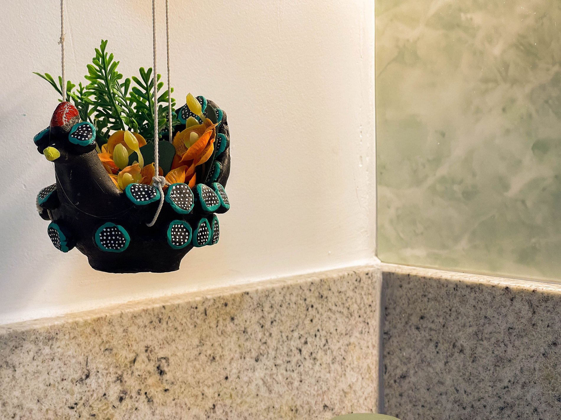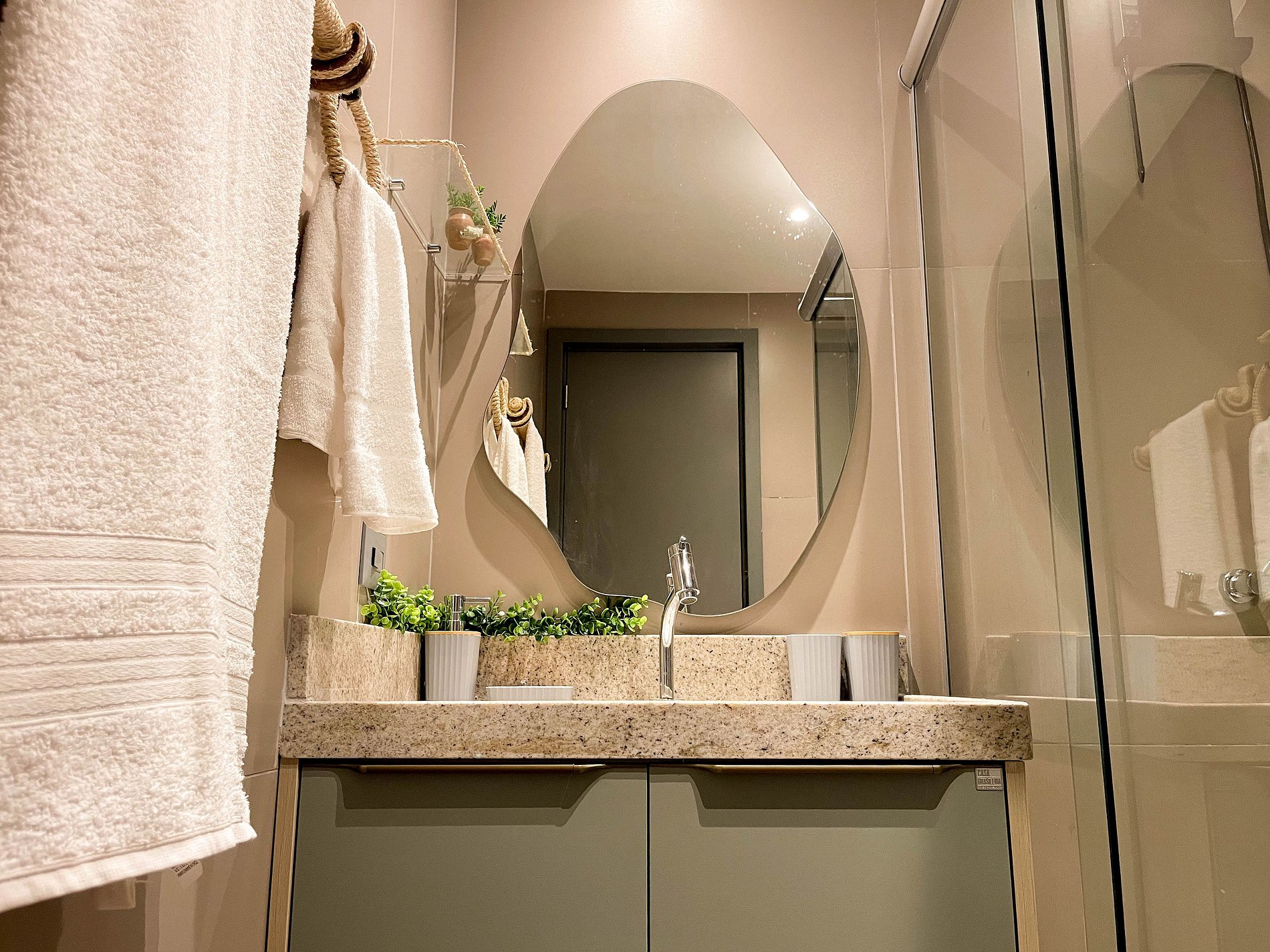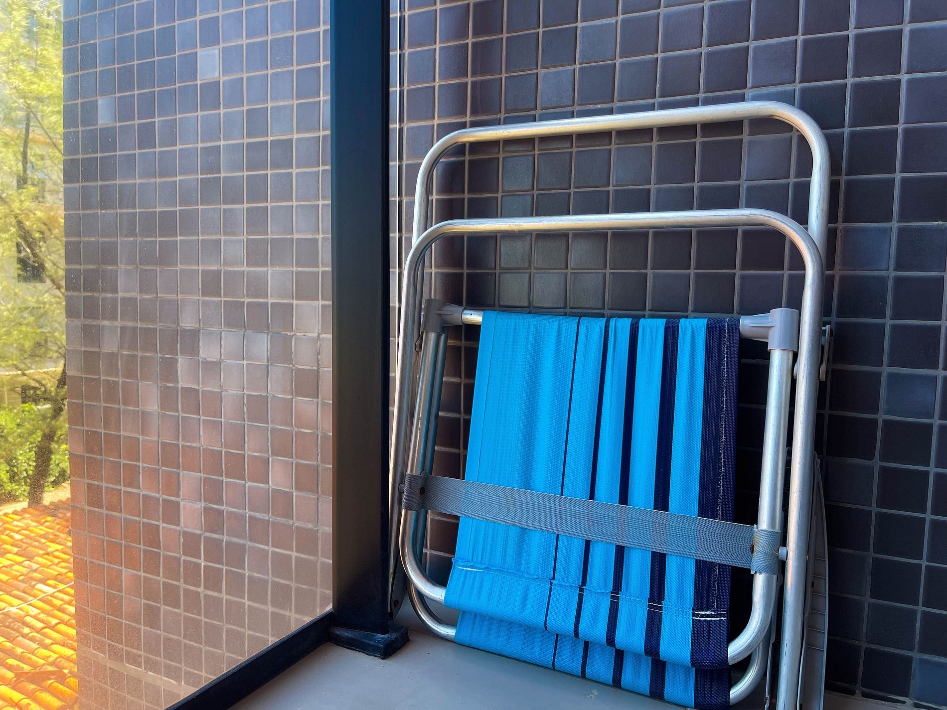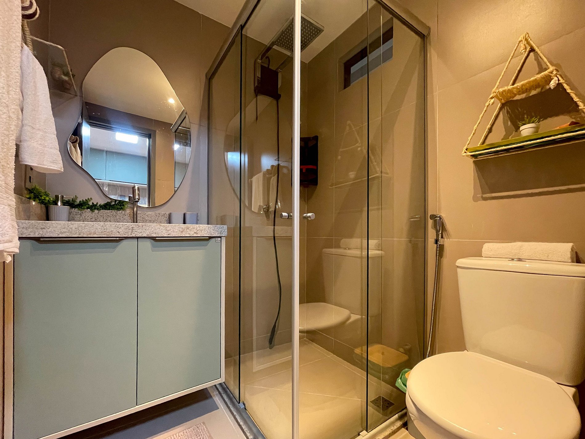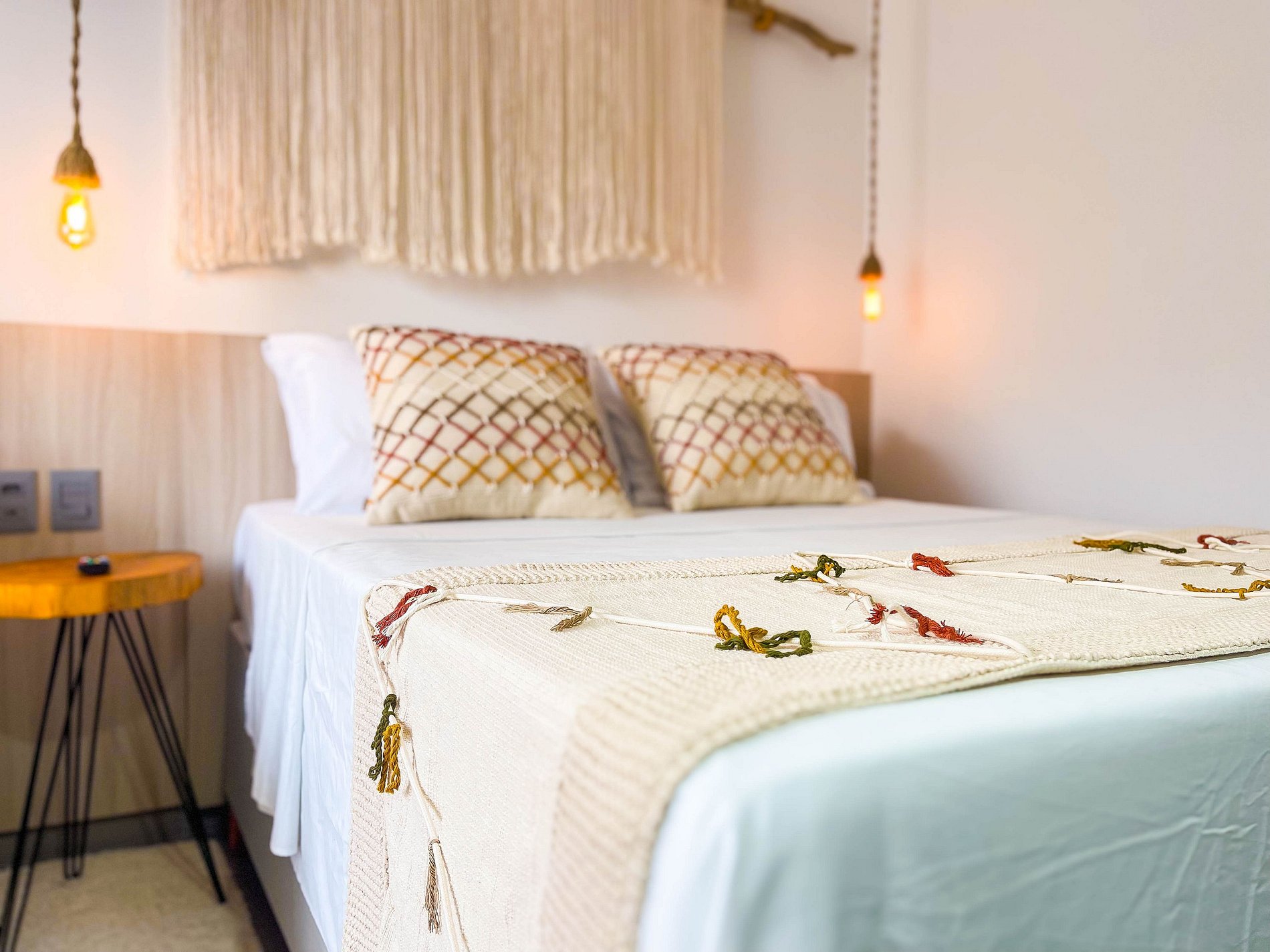 O ambiente de descanso conta com uma cama aconchegante, cortina blackout e ar-condicionado potente, garantindo noites tranquilas e dias leves. Há ainda ferro de passar, secador de cabelo e taças de vinho, para brindar a vista da varanda — onde uma rede te espera para desacelerar e aproveitar o som do mar.
