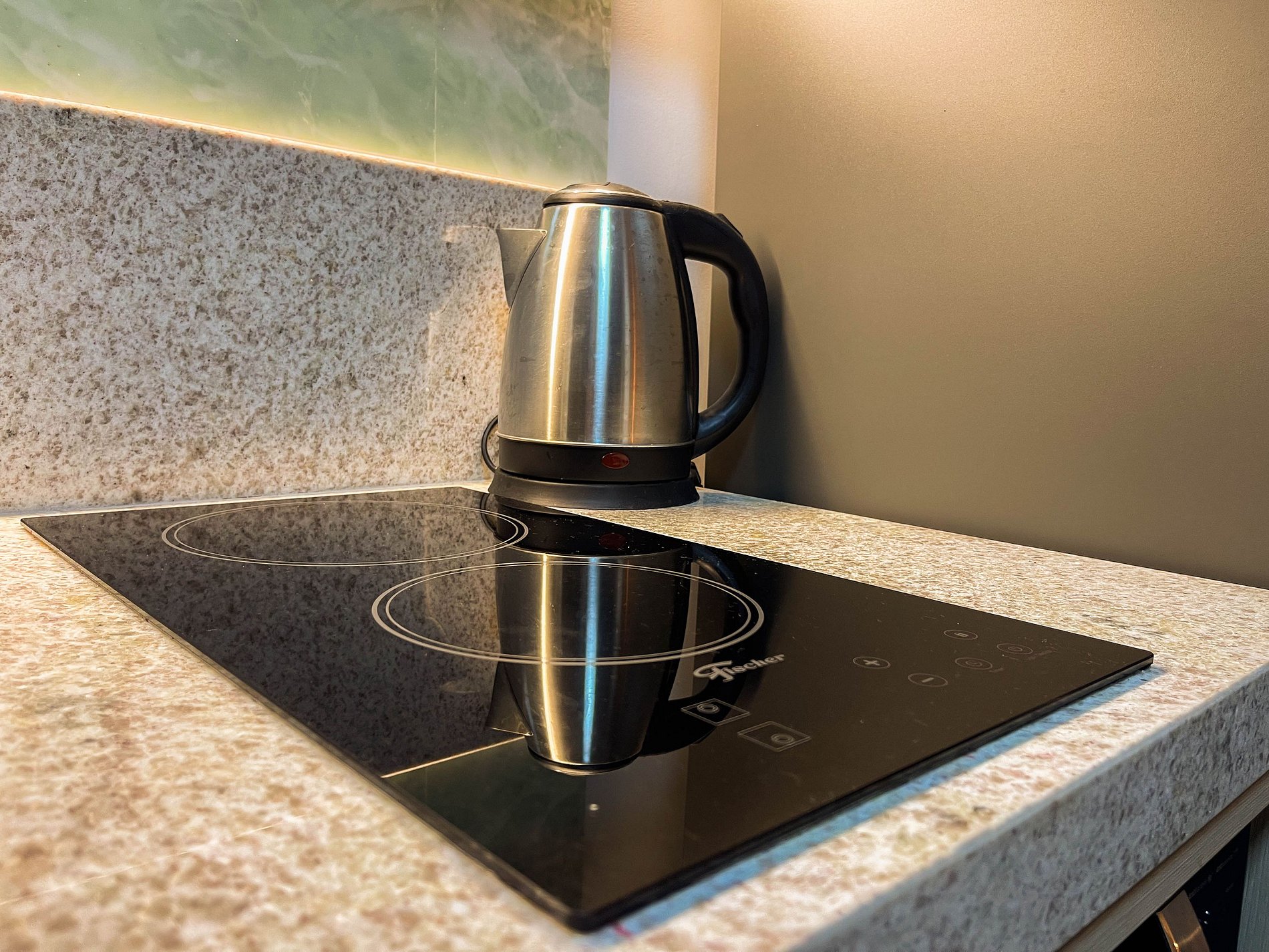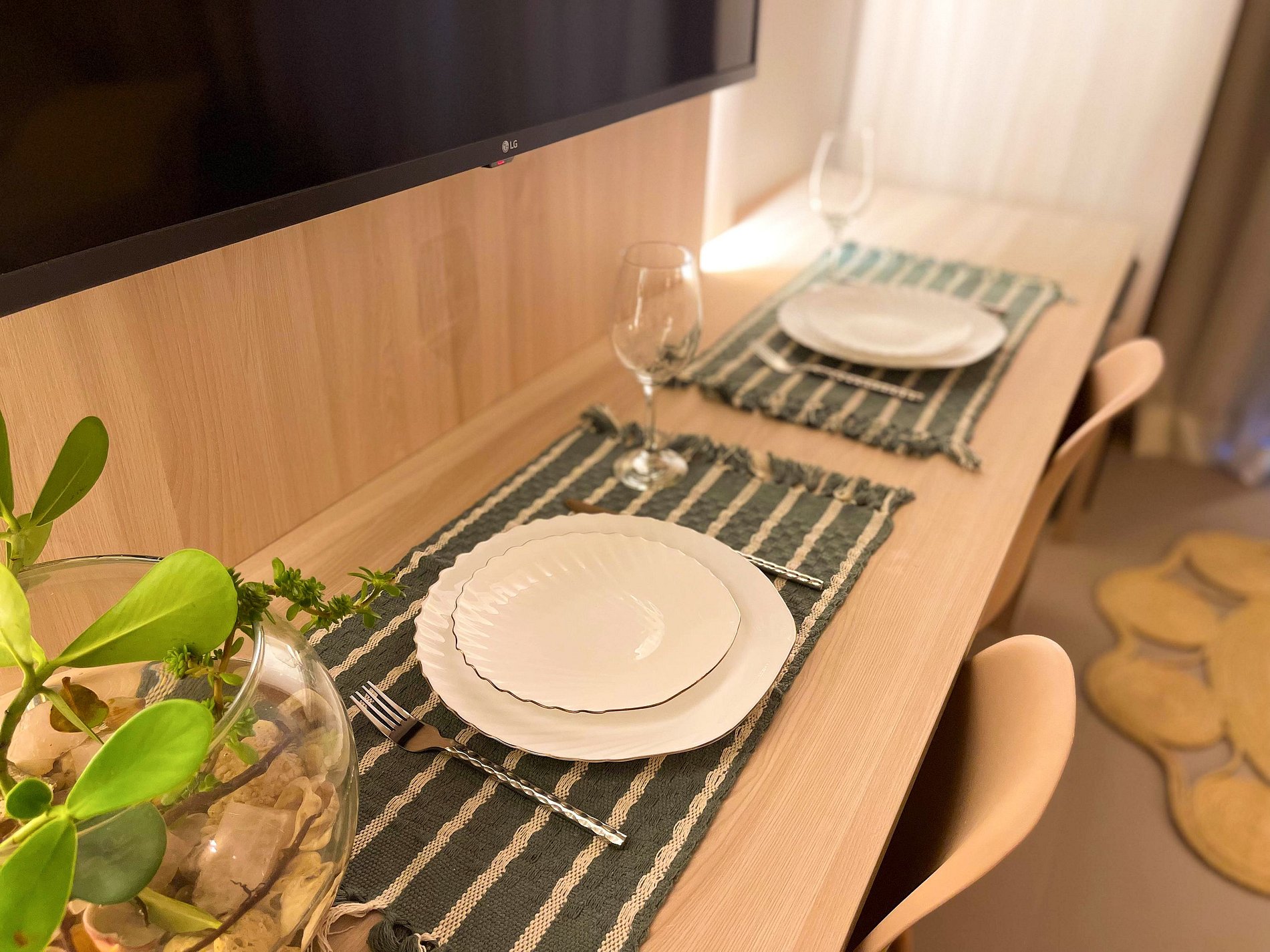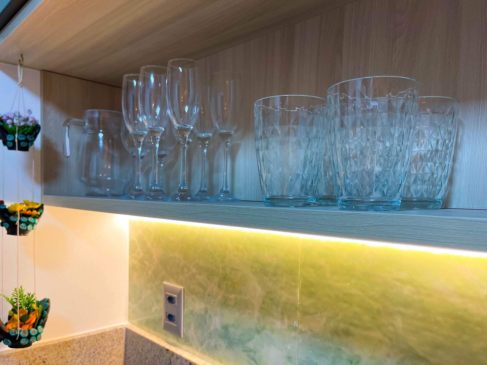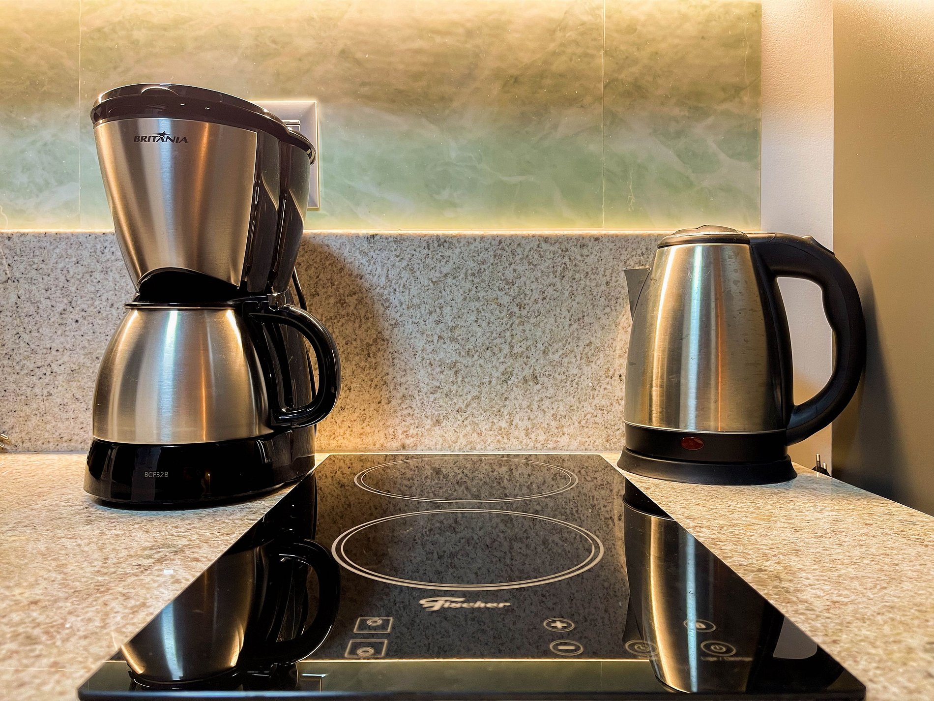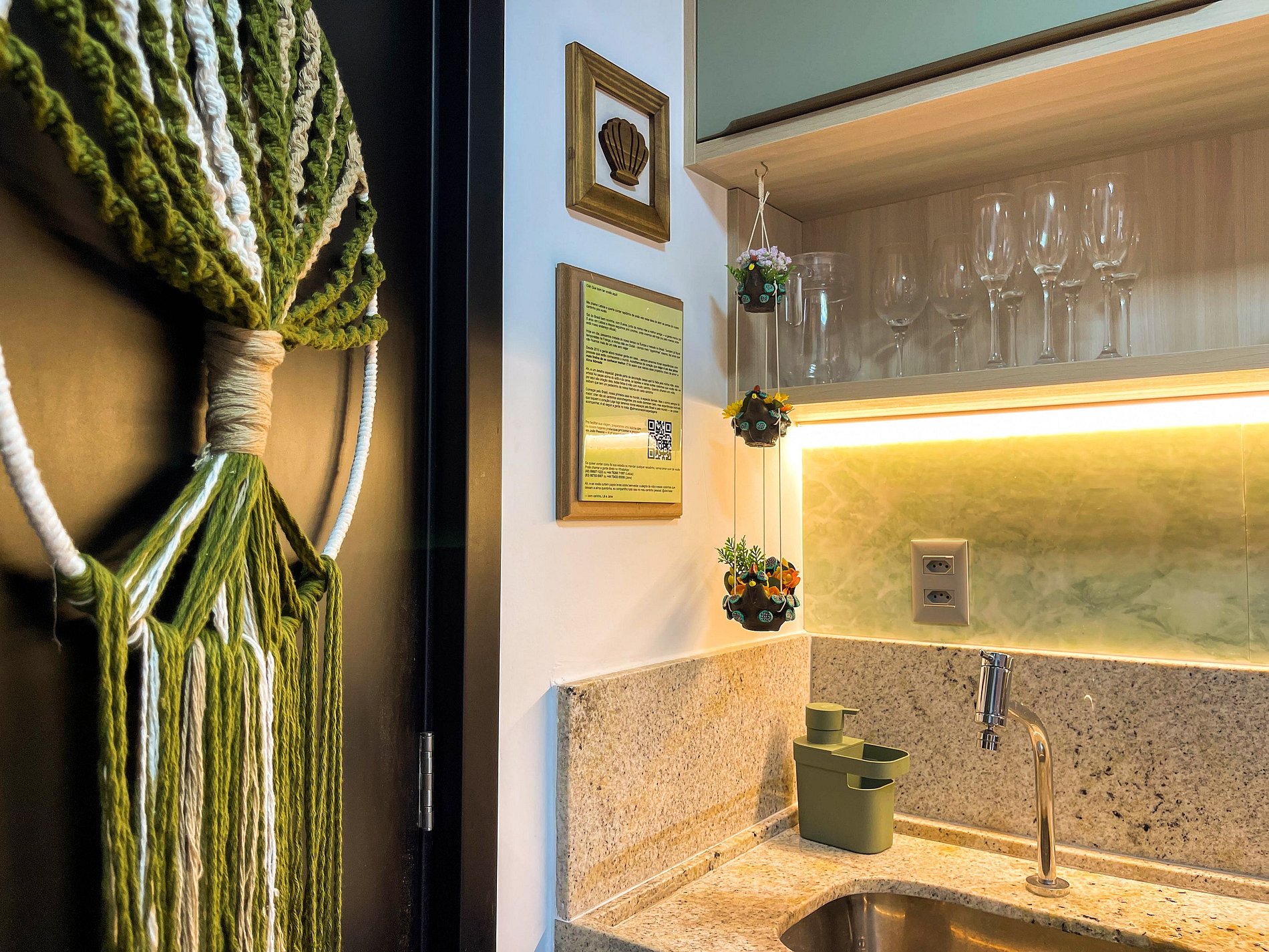A cozinha é um convite à liberdade: equipada com cooktop de indução, air fryer, cafeteira, micro-ondas, geladeira grande, liquidificador, sanduicheira e chaleira elétrica — tudo pronto para preparar desde um café tranquilo até um jantar à beira da varanda.