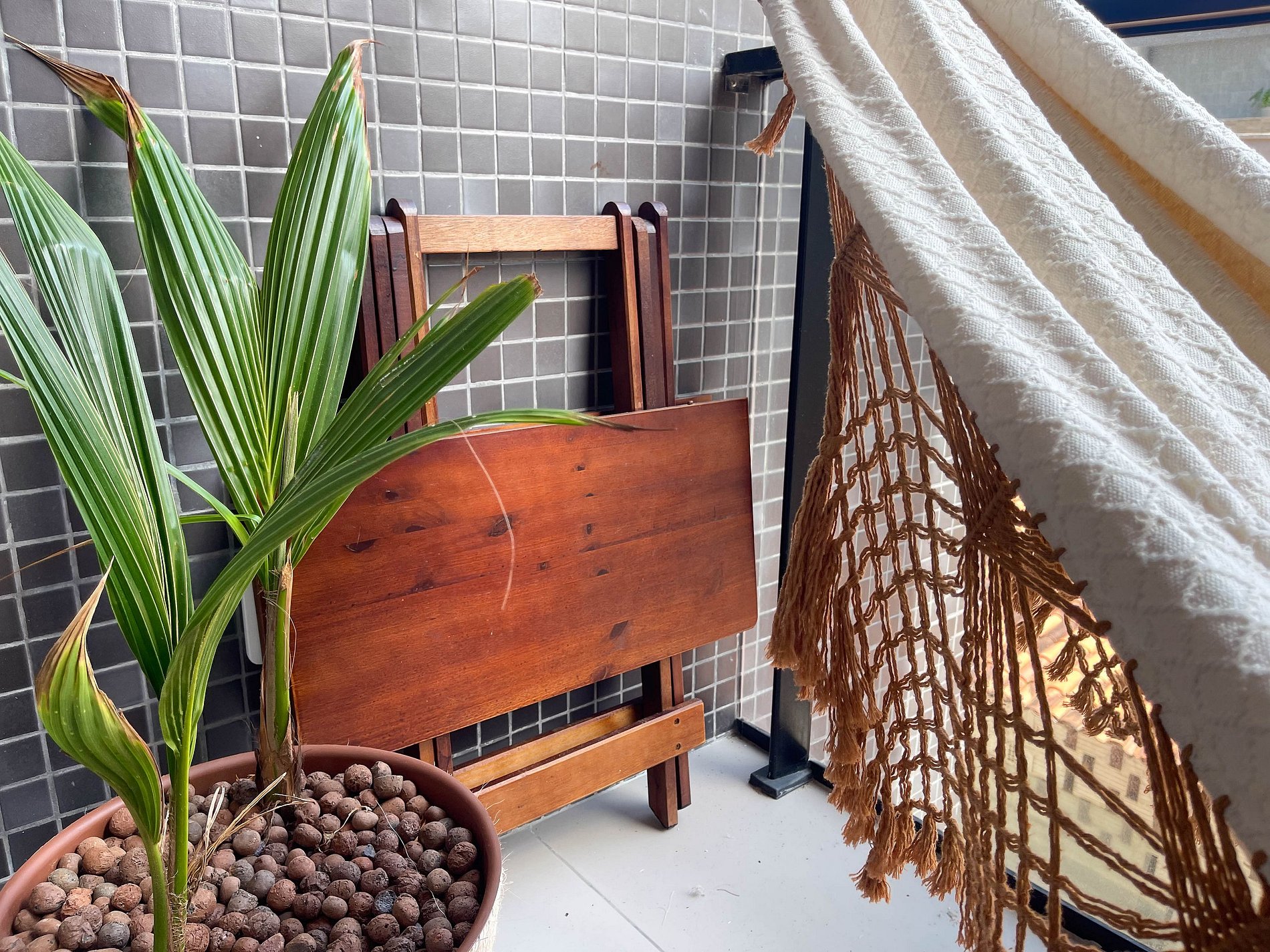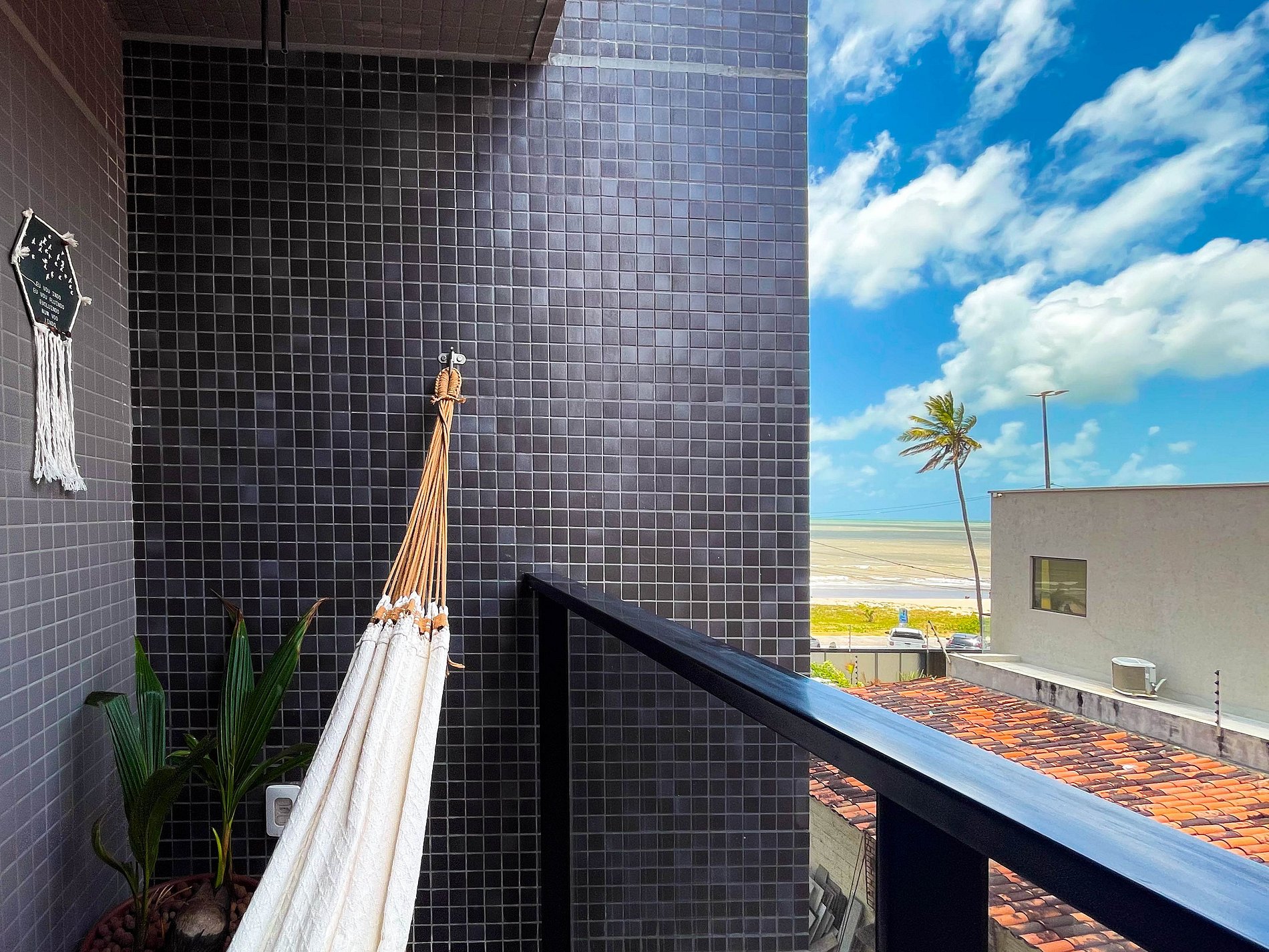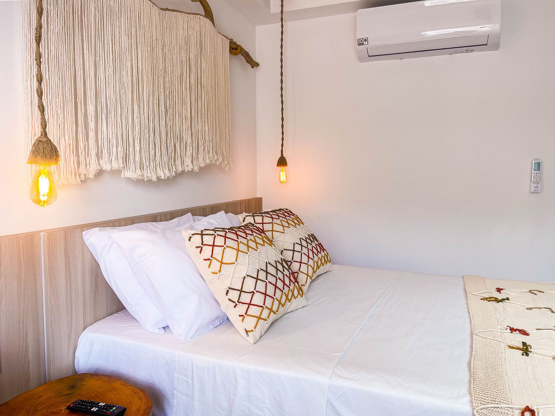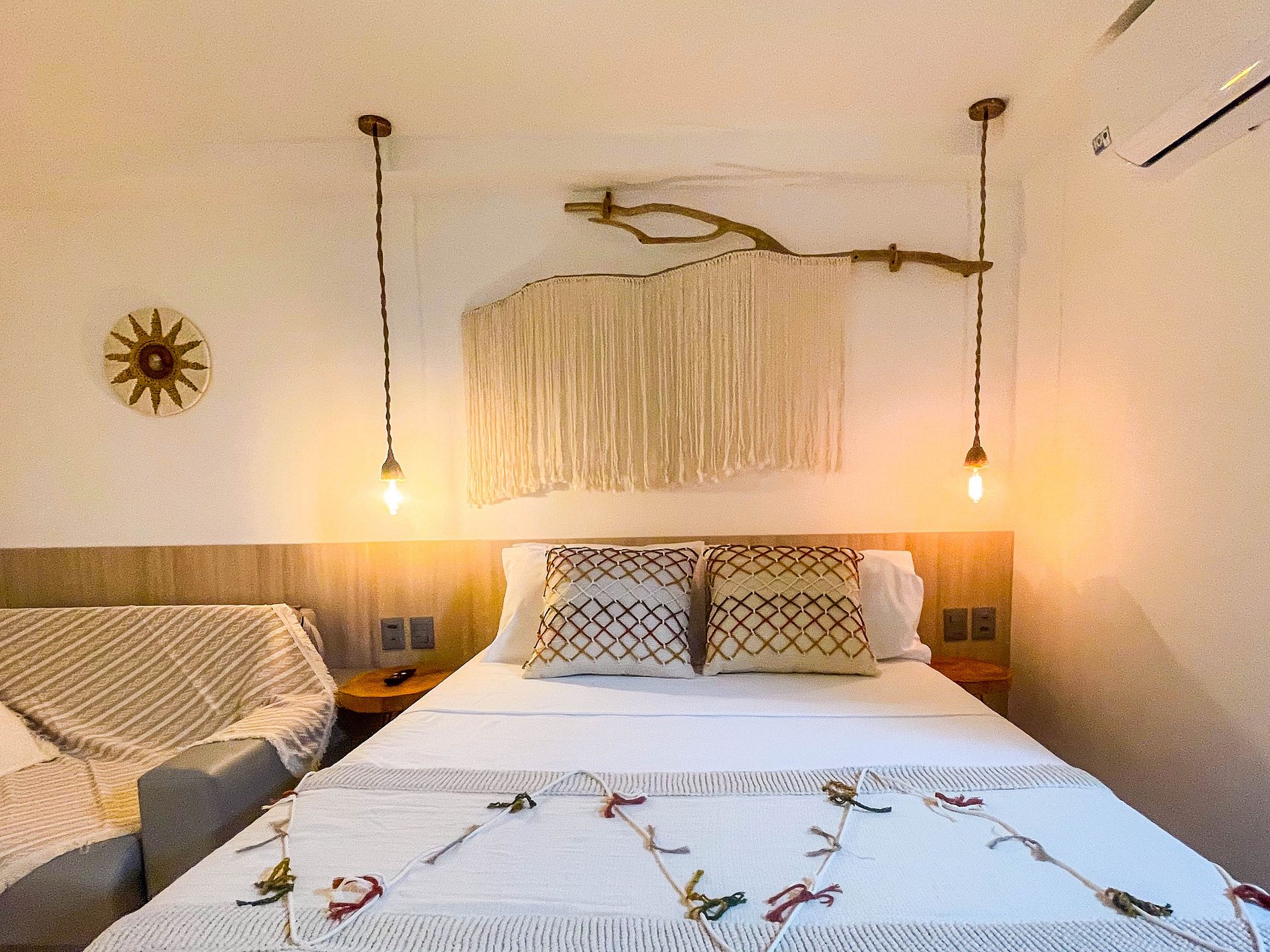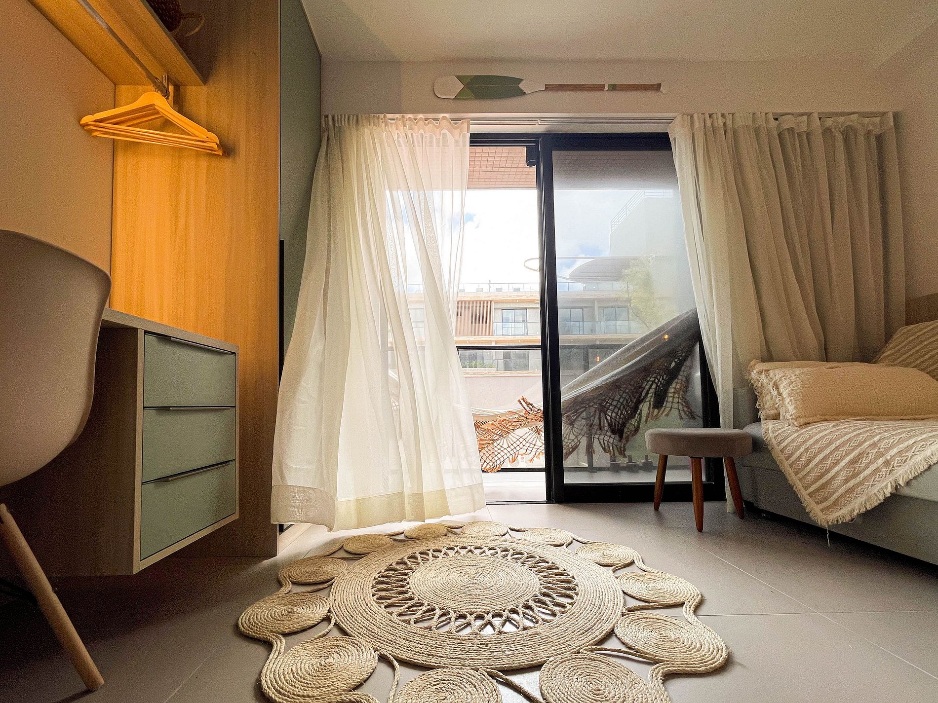 O ambiente de descanso conta com uma cama aconchegante, cortina blackout e ar-condicionado potente, garantindo noites tranquilas e dias leves. Há ainda ferro de passar, secador de cabelo e taças de vinho, para brindar a vista da varanda — onde uma rede te espera para desacelerar e aproveitar o som do mar.