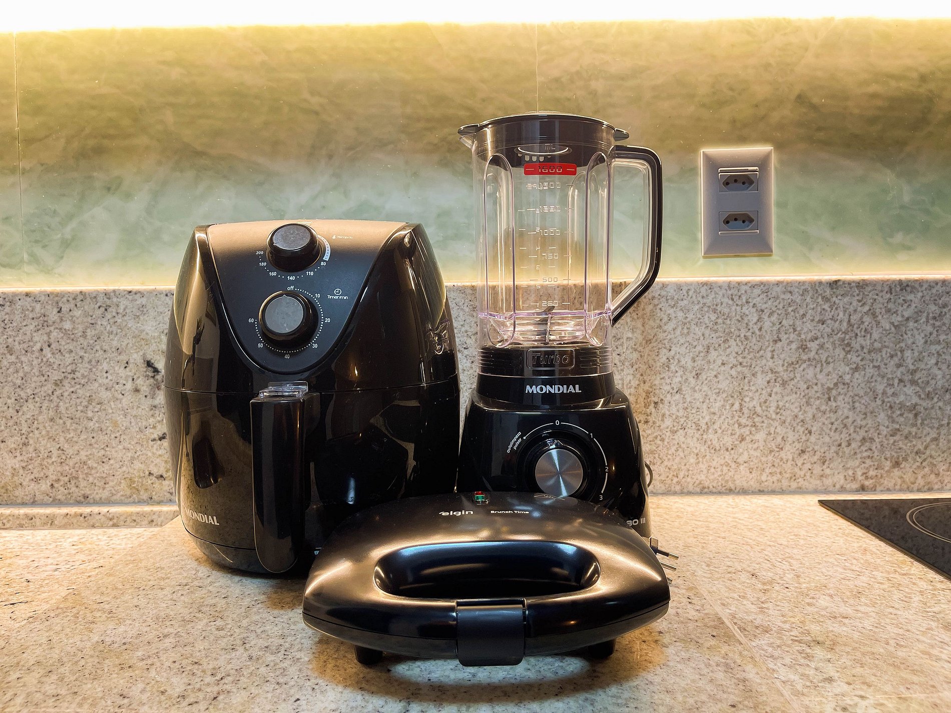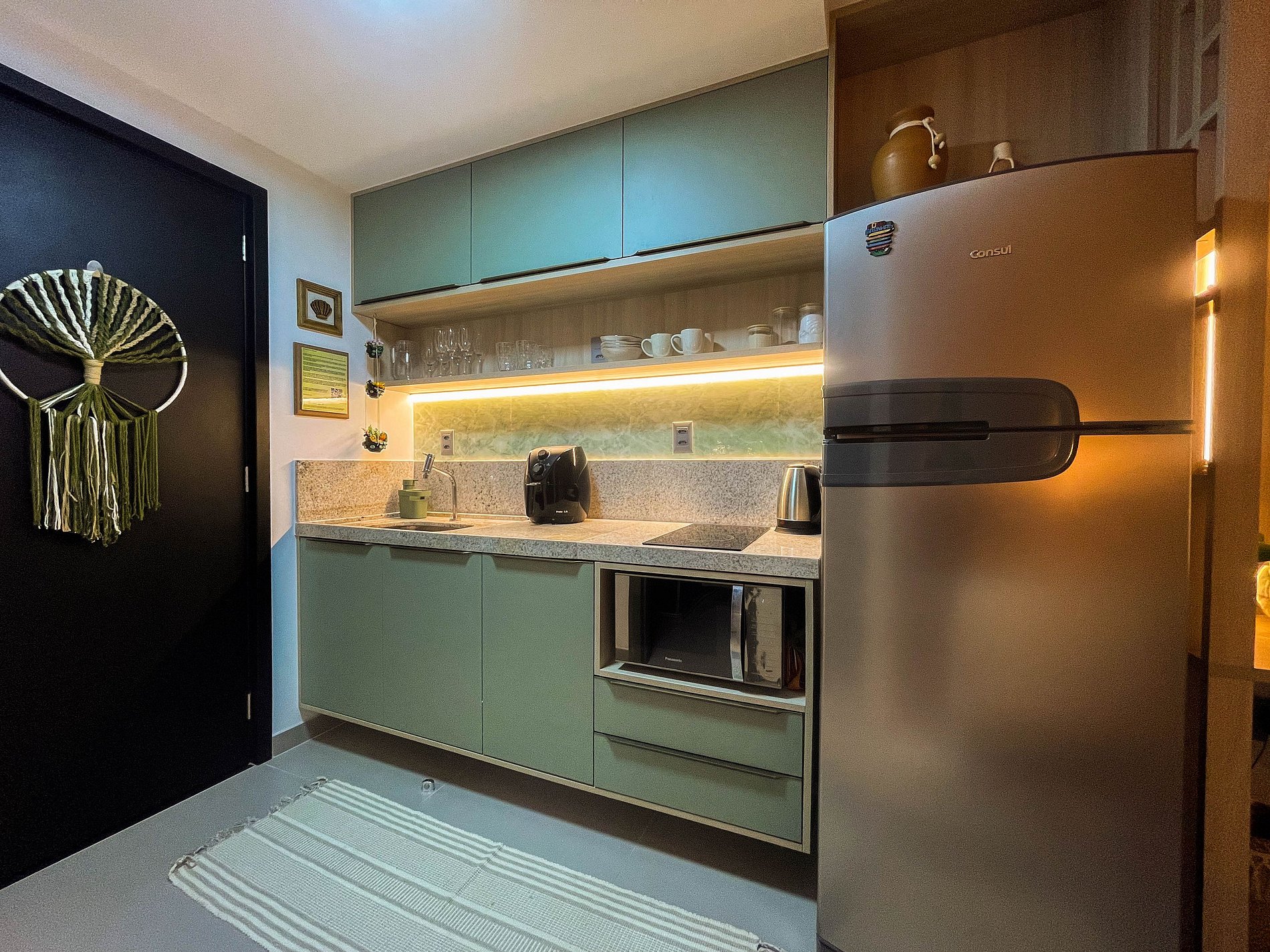 A cozinha é um convite à liberdade: equipada com cooktop de indução, air fryer, cafeteira, micro-ondas, geladeira grande, liquidificador, sanduicheira e chaleira elétrica — tudo pronto para preparar desde um café tranquilo até um jantar à beira da varanda.