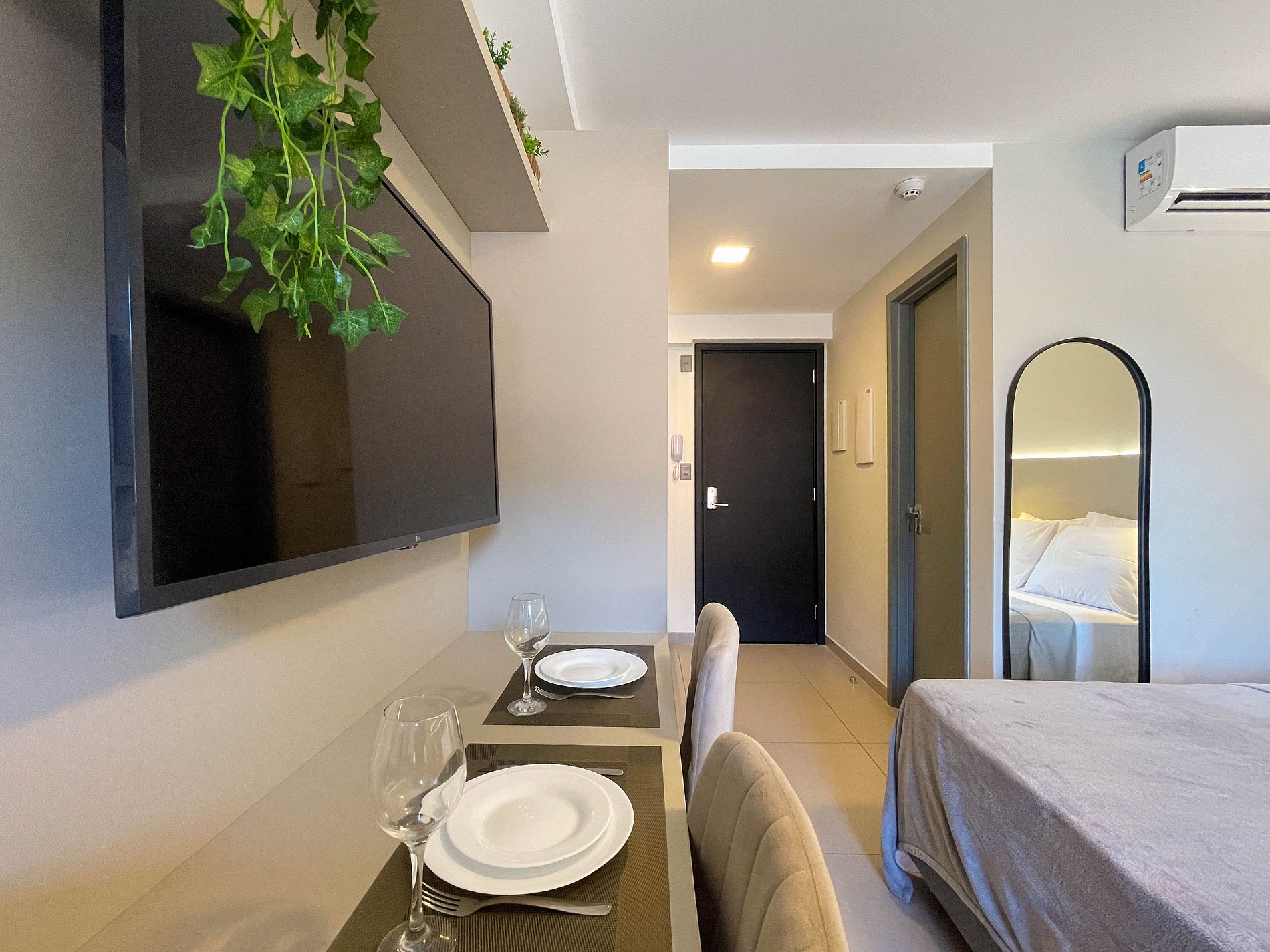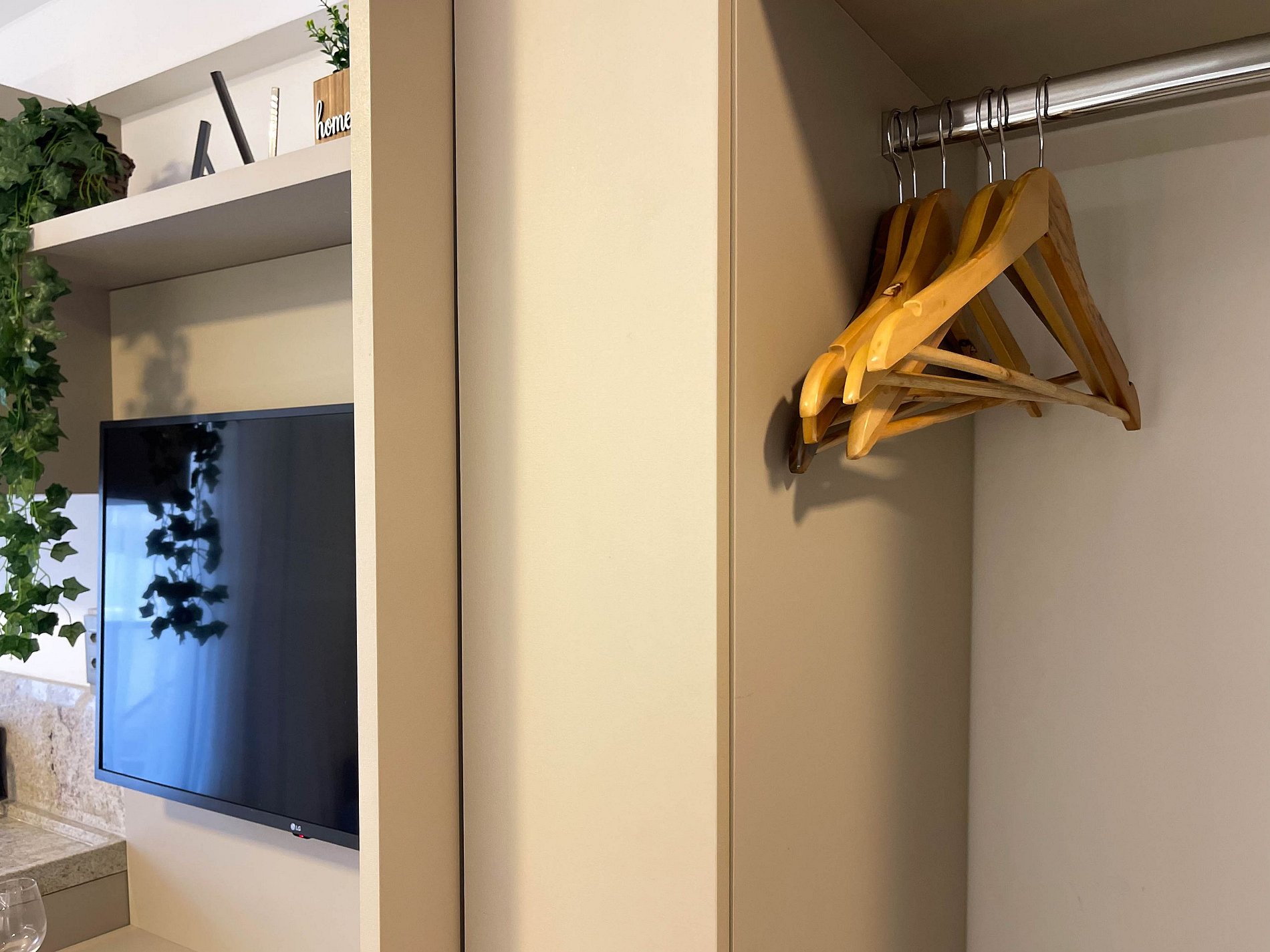 Há ainda ferro de passar, secador de cabelo e armários bem distribuídos, tornando o espaço ideal tanto para curtas quanto longas estadias.
