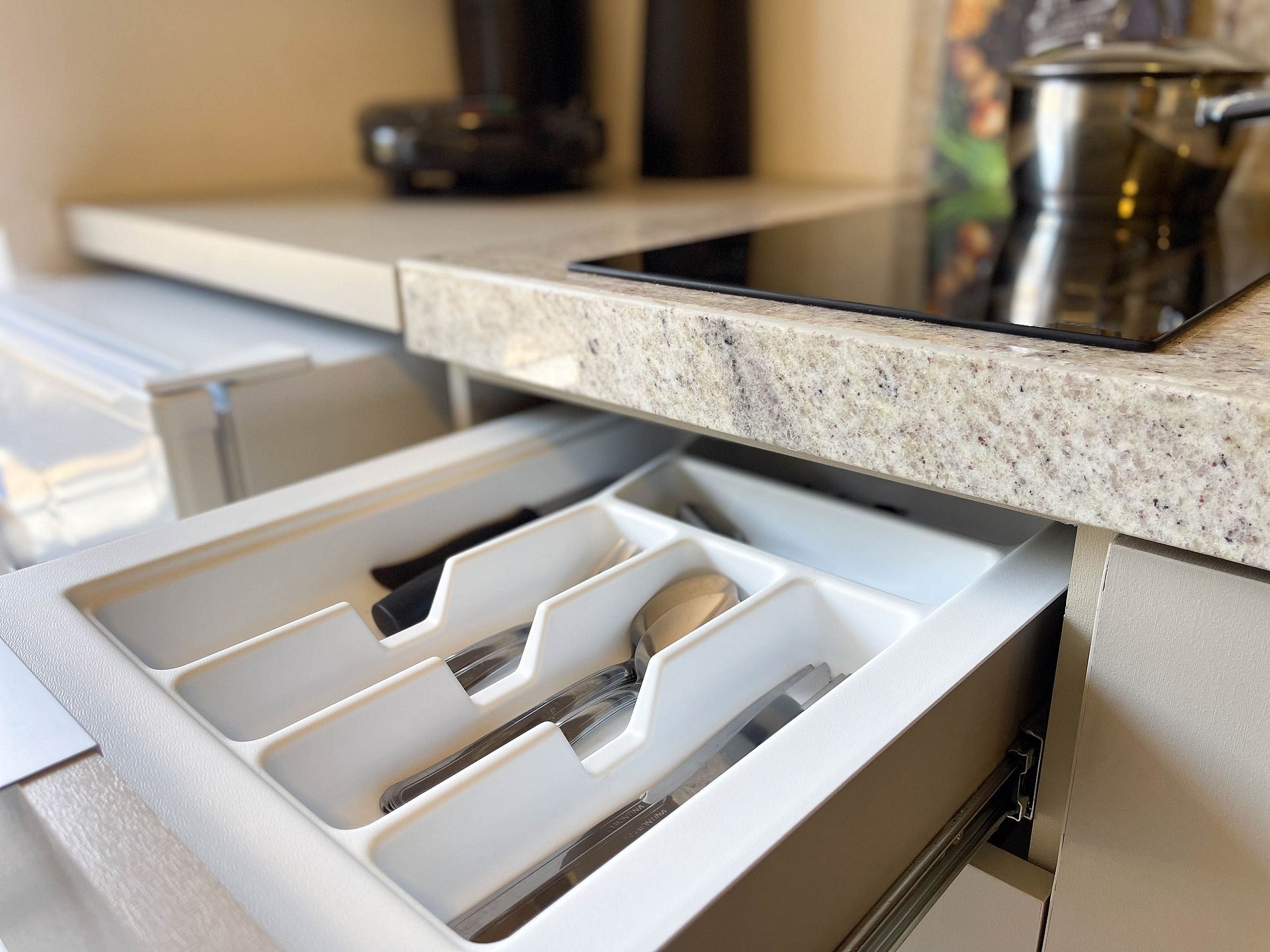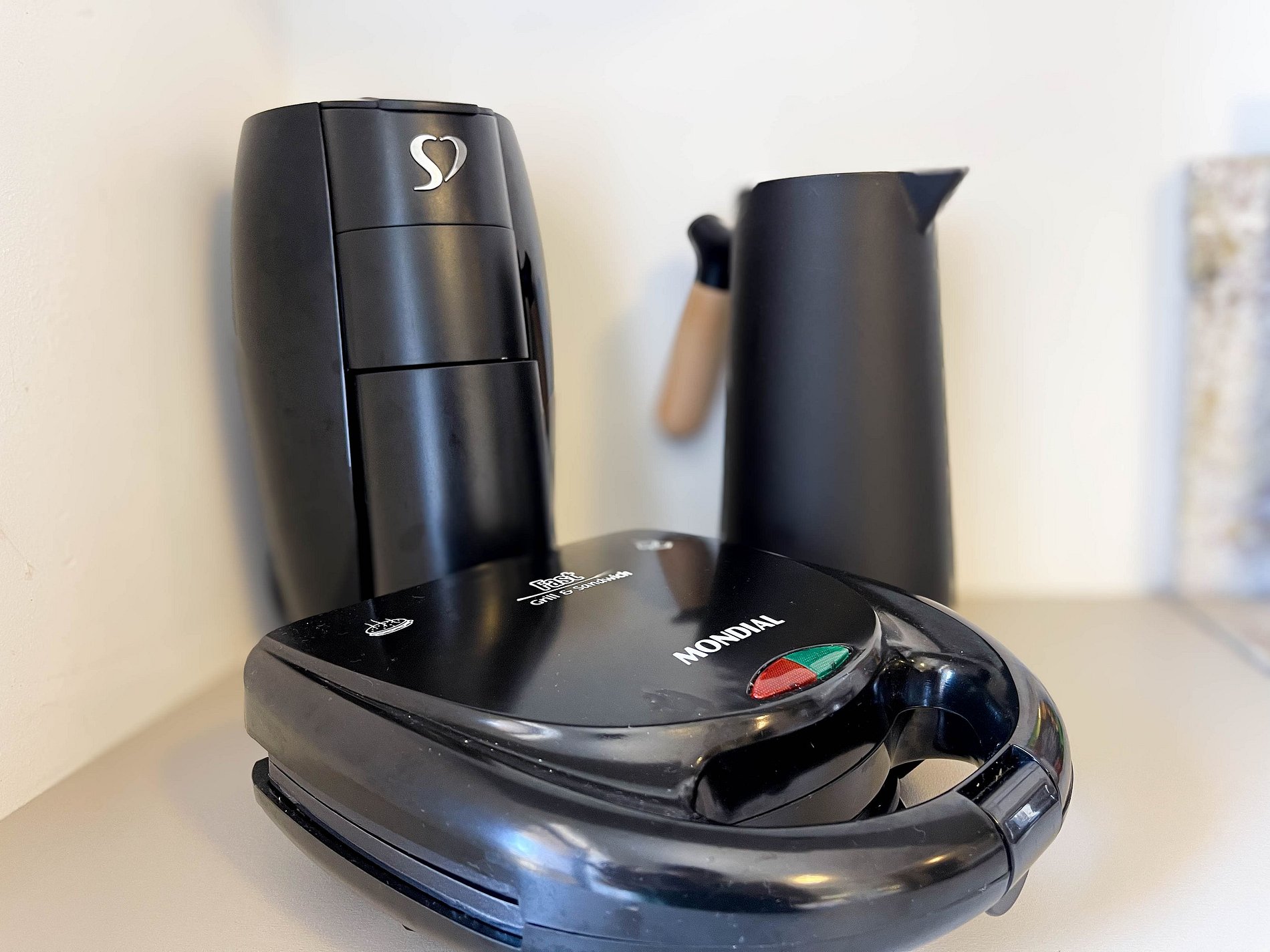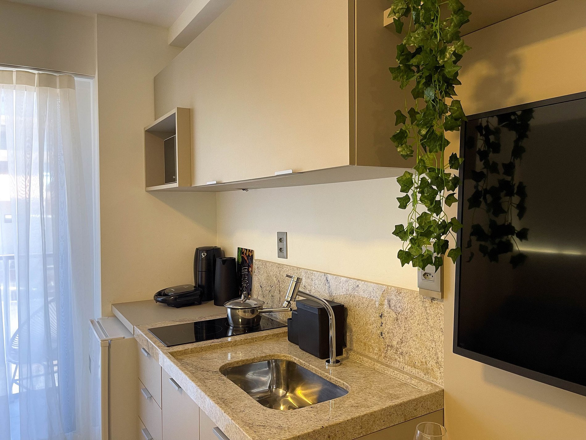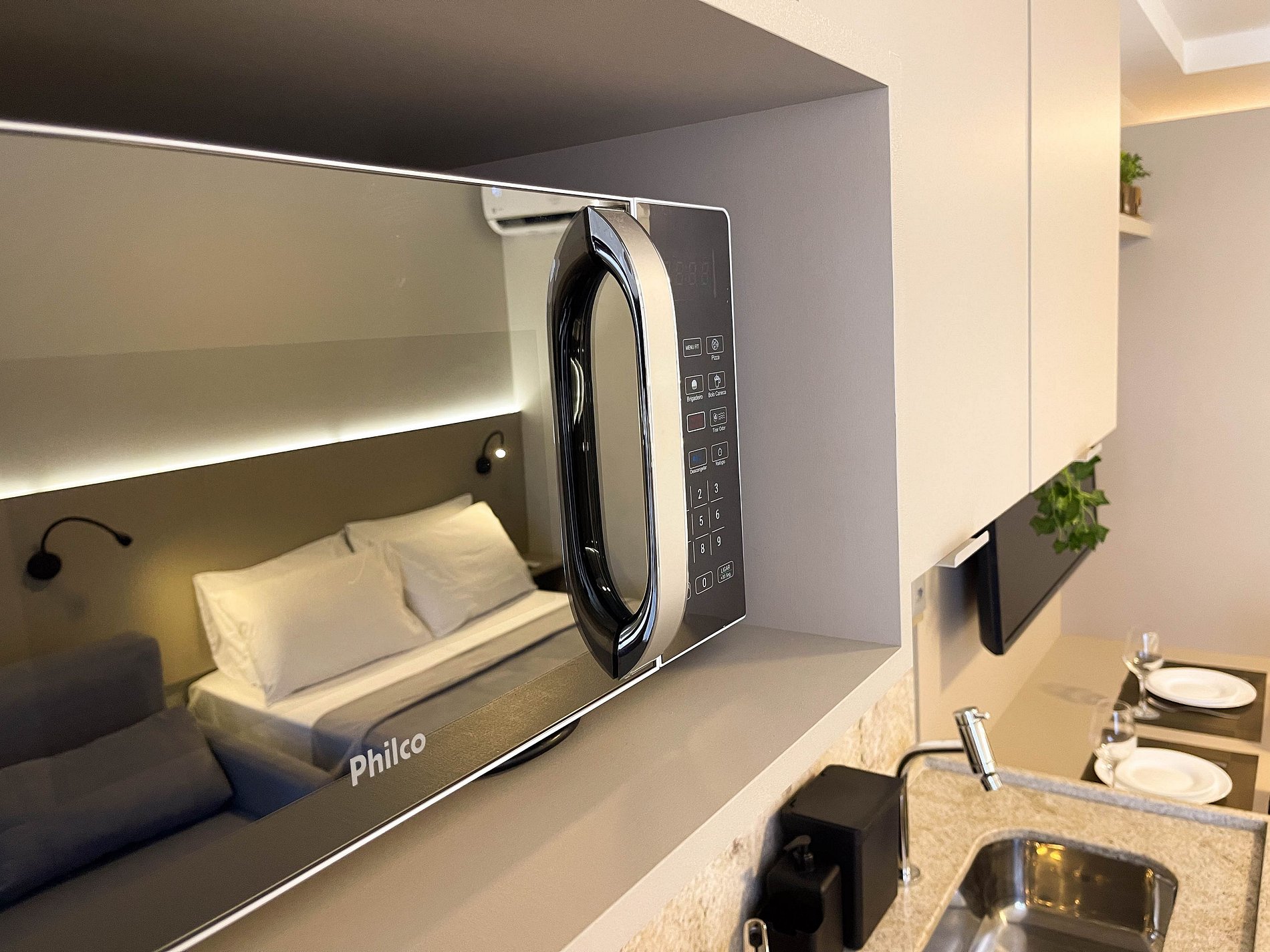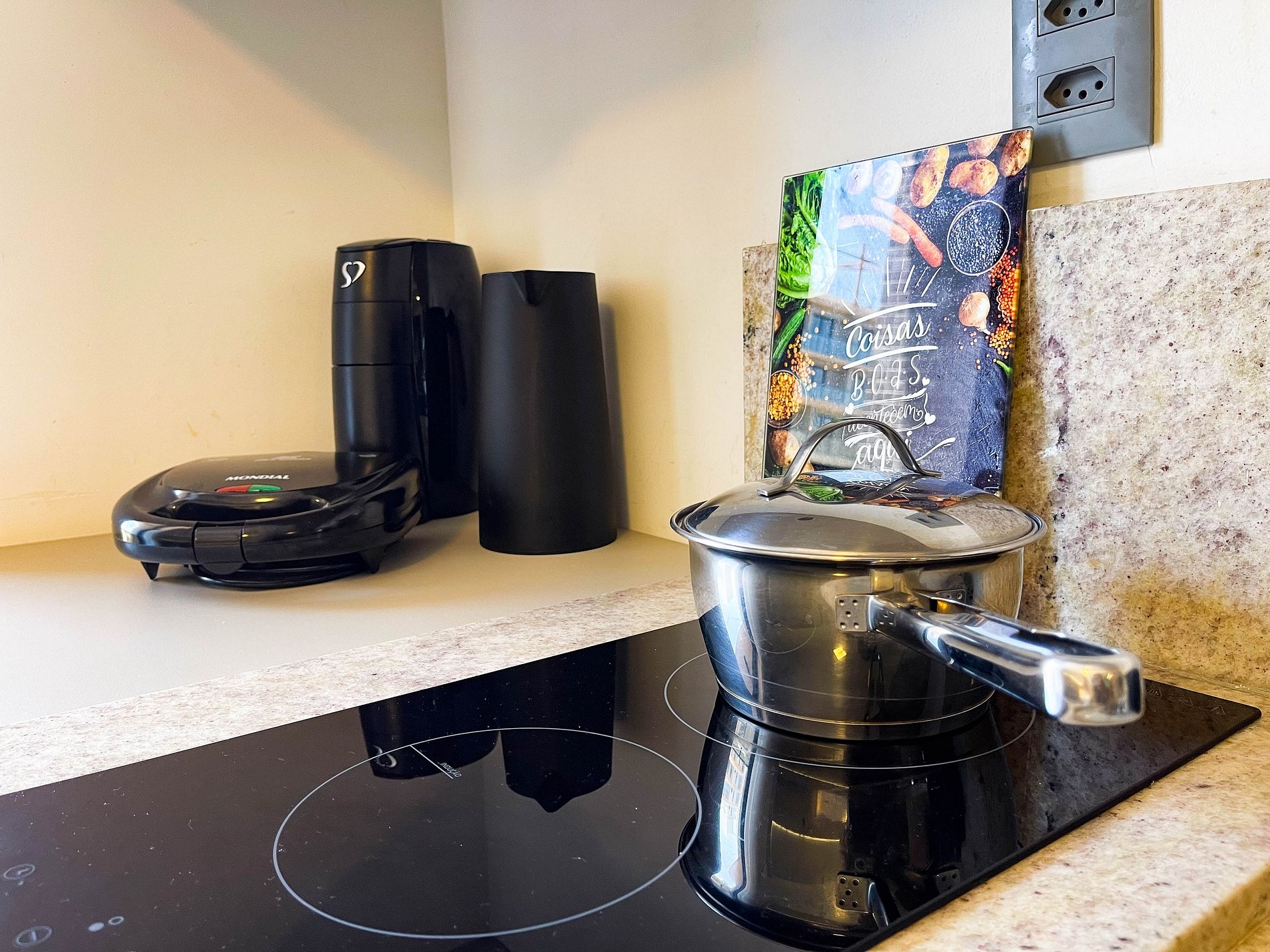 A cozinha é equipada com fogão, frigobar, micro-ondas, cafeteira, sanduicheira, liquidificador, utensílios — tudo pronto para quem gosta de se sentir em casa, mesmo longe dela.