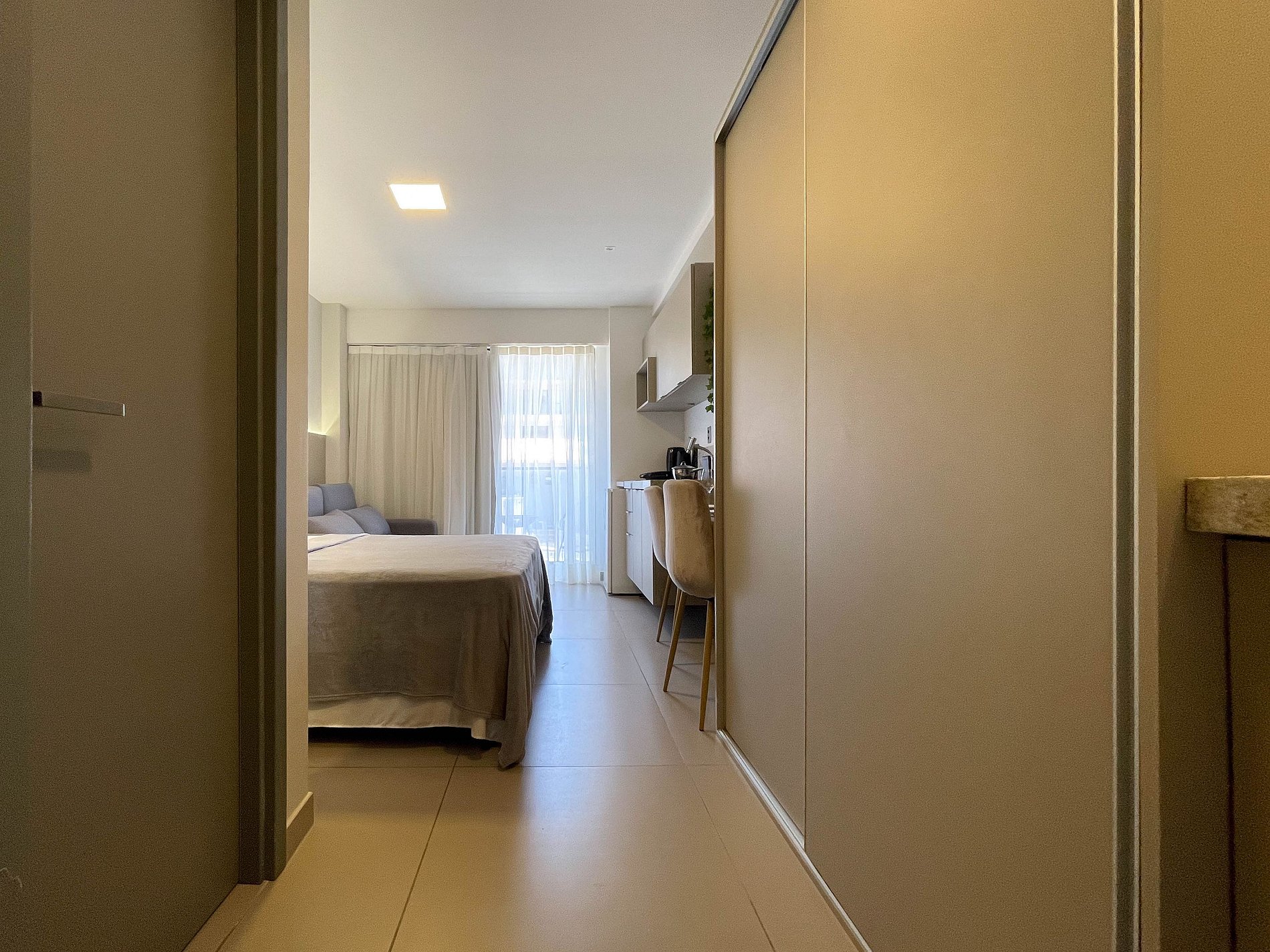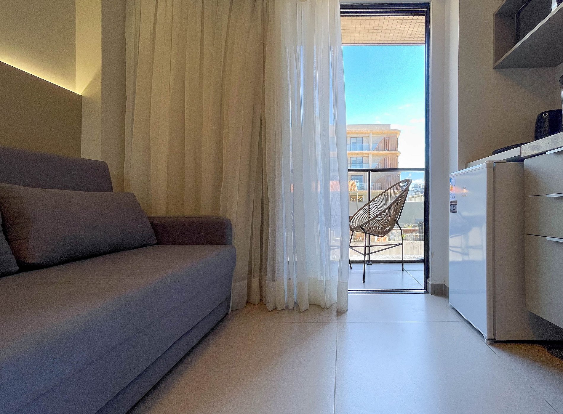 A varanda amplia o ambiente e traz um toque de liberdade — um espaço para relaxar após um dia de praia ou saborear um café da manhã. Dentro, o espaço é pensado para o bem-estar: cama de casal aconchegante, sofá-cama casal e design funcional que une praticidade e charme.