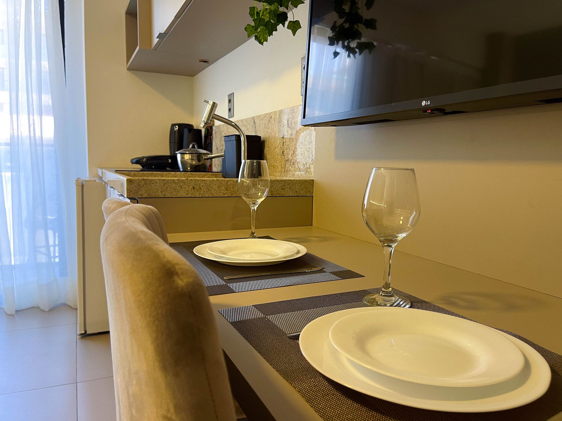 A cozinha é equipada com fogão, frigobar, micro-ondas, cafeteira, sanduicheira, liquidificador, utensílios — tudo pronto para quem gosta de se sentir em casa, mesmo longe dela.