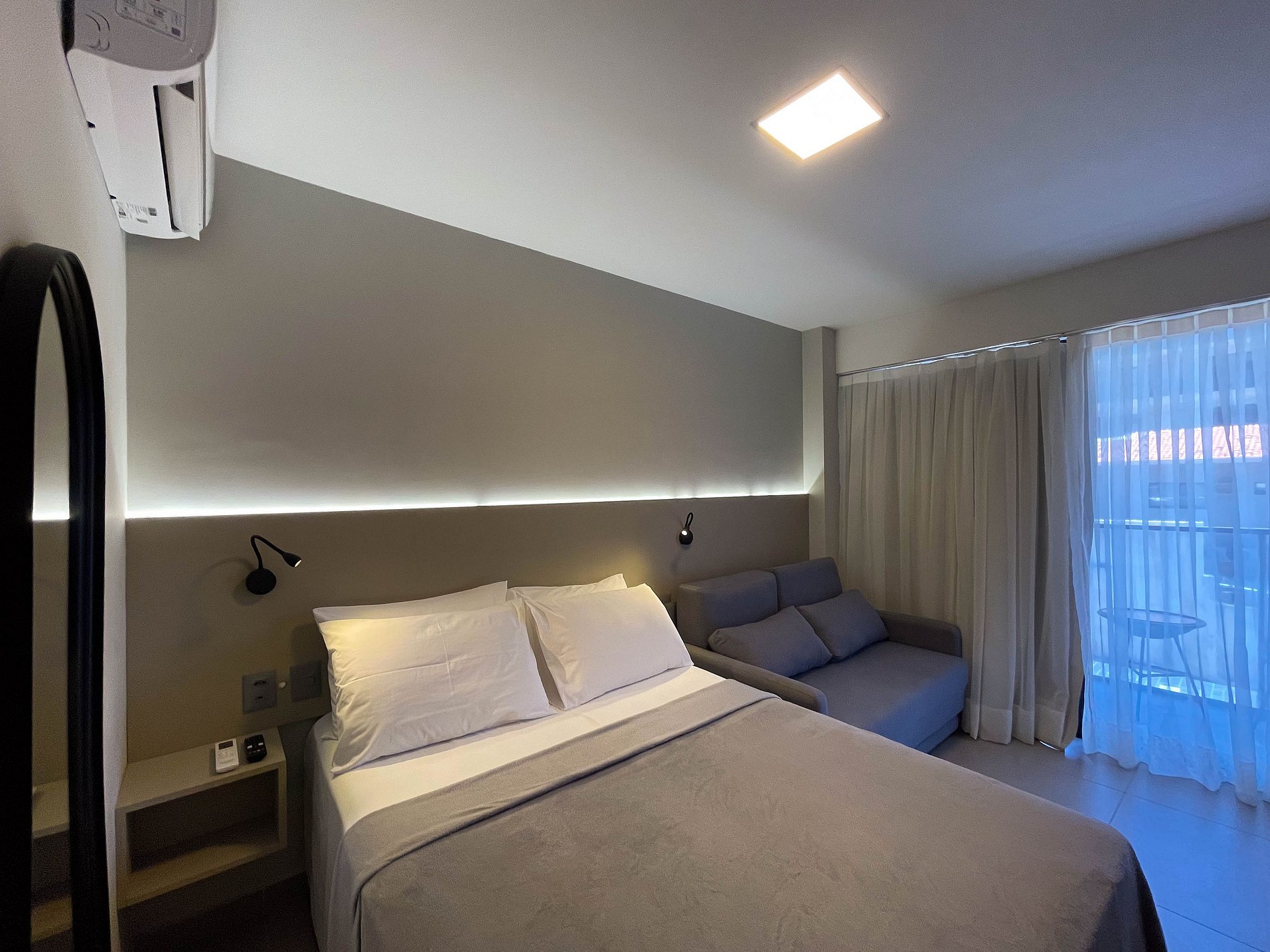 A varanda amplia o ambiente e traz um toque de liberdade — um espaço para relaxar após um dia de praia ou saborear um café da manhã. Dentro, o espaço é pensado para o bem-estar: cama de casal aconchegante, sofá-cama casal e design funcional que une praticidade e charme.