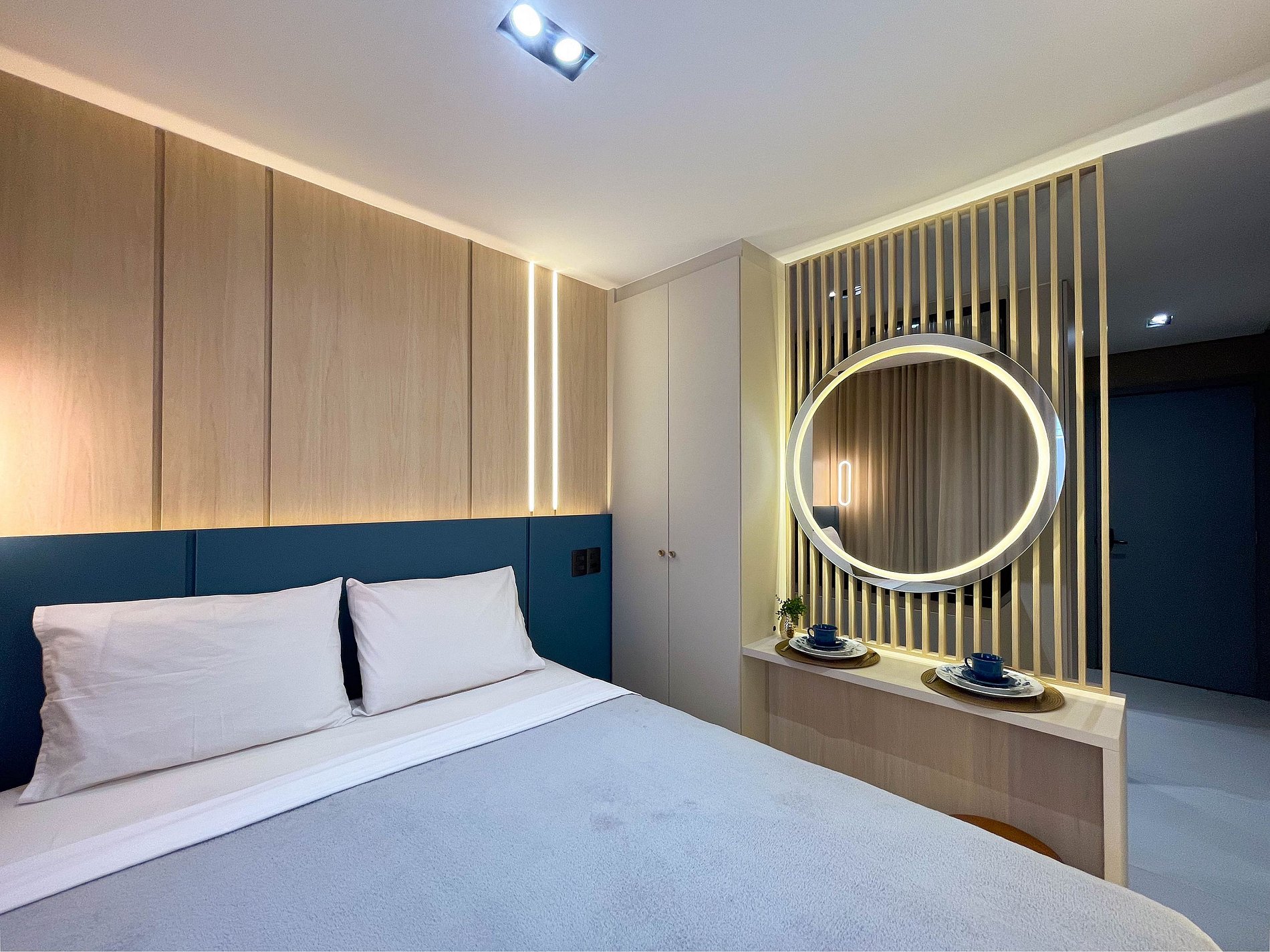 Com uma área externa privativa, o flat se transforma em um espaço acolhedor, ideal para quem valoriza momentos ao ar livre. Dentro, o ambiente é funcional e elegante: cama confortável, decoração leve e iluminação natural que cria uma sensação de paz.