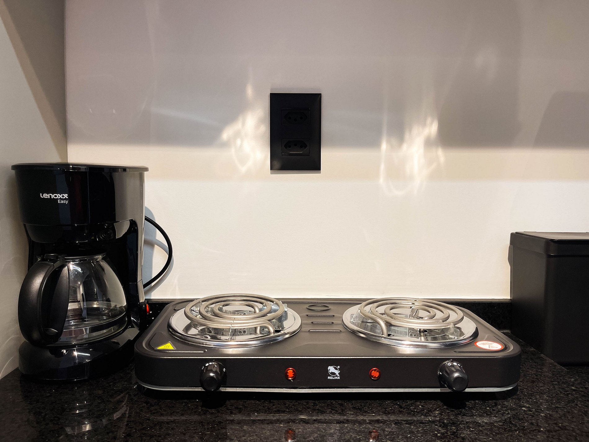 A cozinha é funcional, equipada com fogão, frigobar, micro-ondas, cafeteira, sanduicheira, liquidificador, utensílios diversos, permitindo autonomia total durante a estadia.