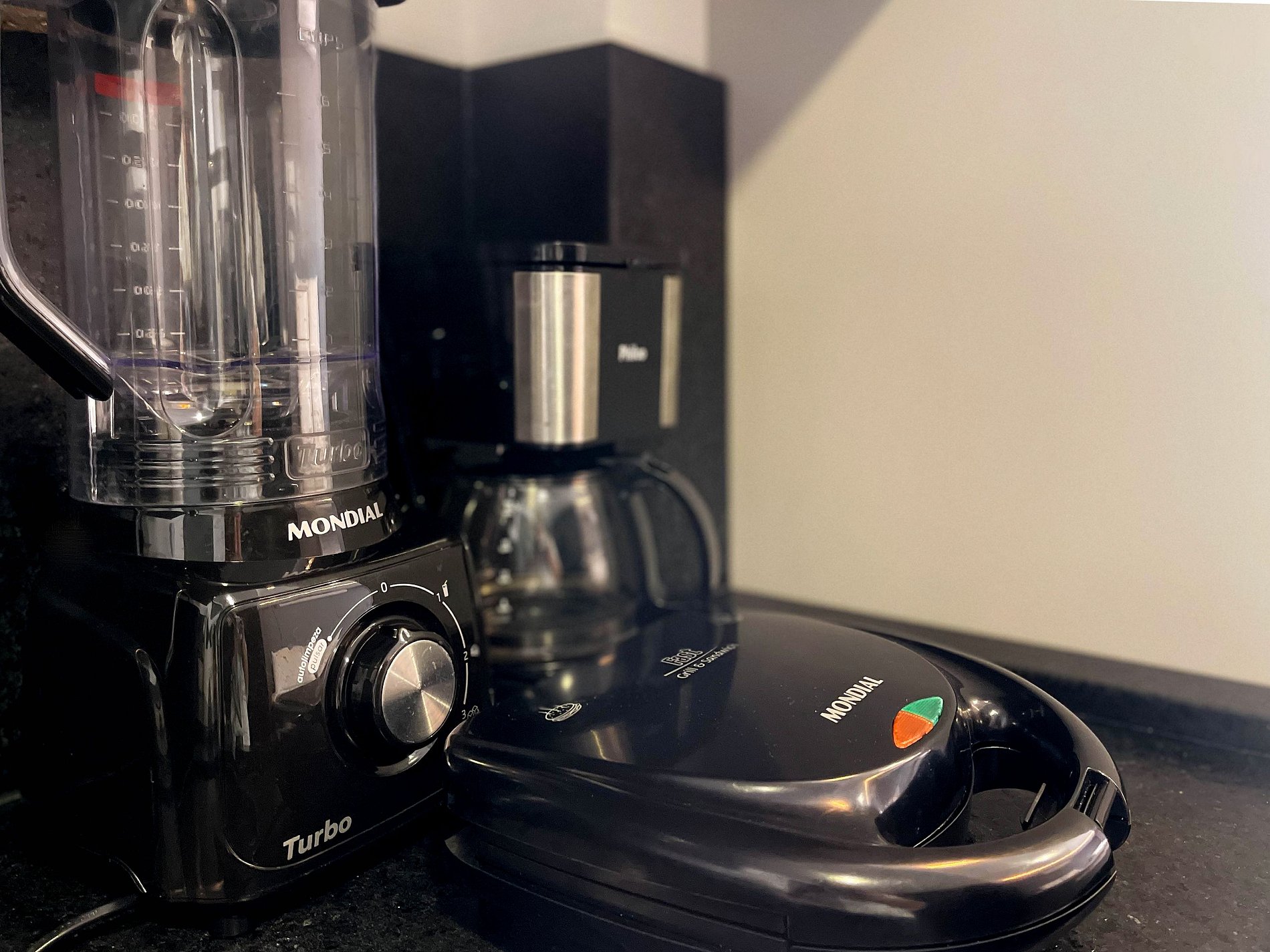 A cozinha equipada — com fogão, refrigerador, micro-ondas, liquidificador, torradeira, cafeteira e utensílios — permite desde um café simples até refeições elaboradas, criando momentos de convivência que tornam a estadia mais pessoal.
