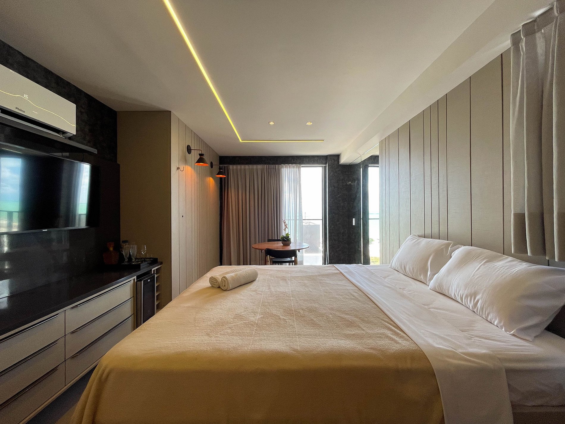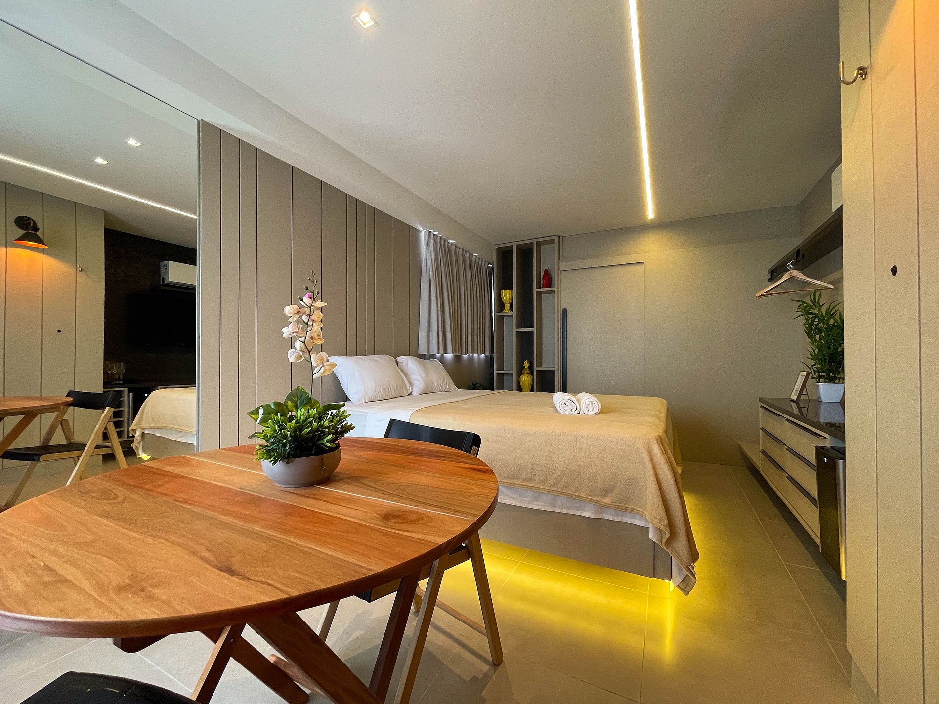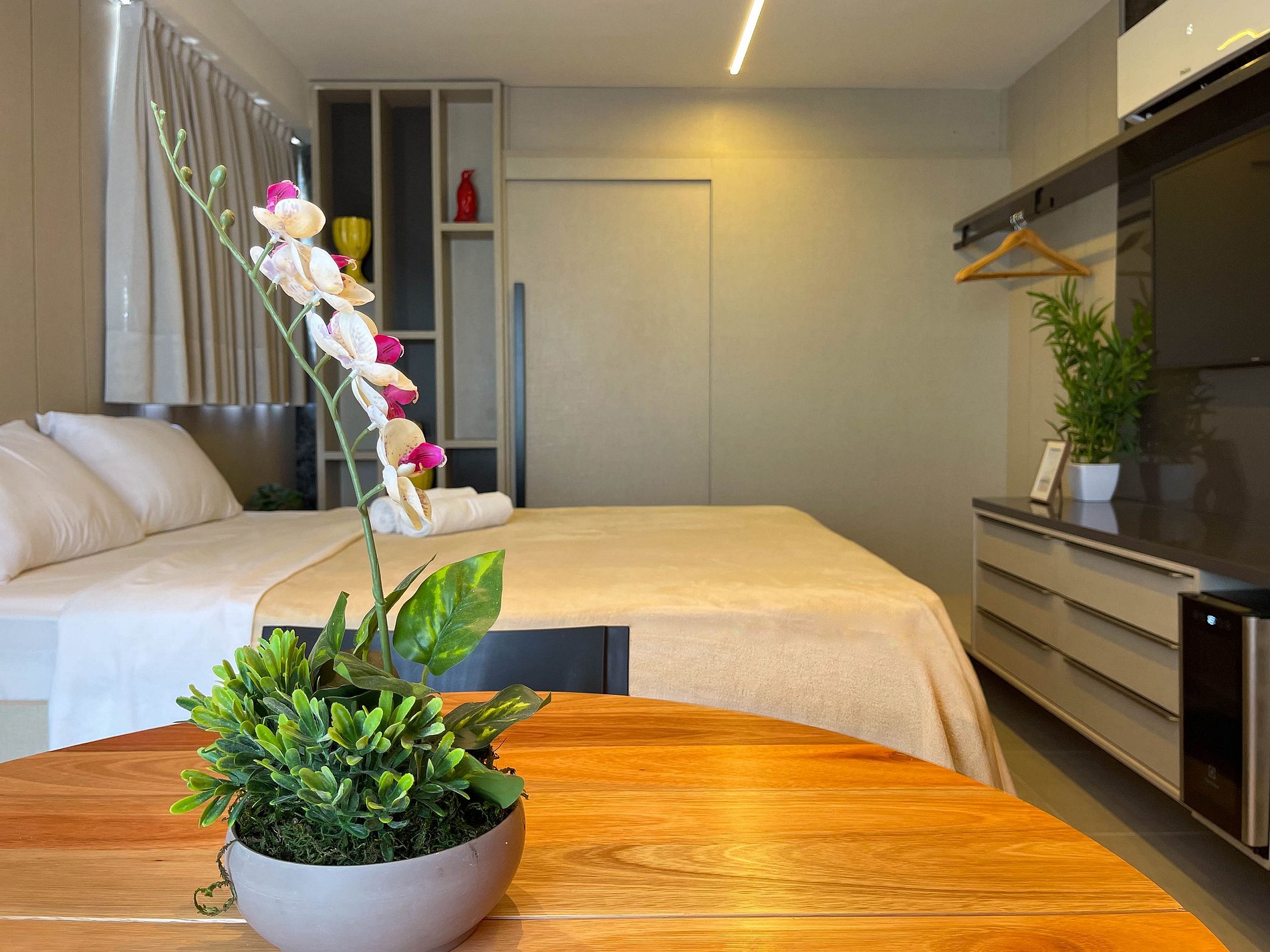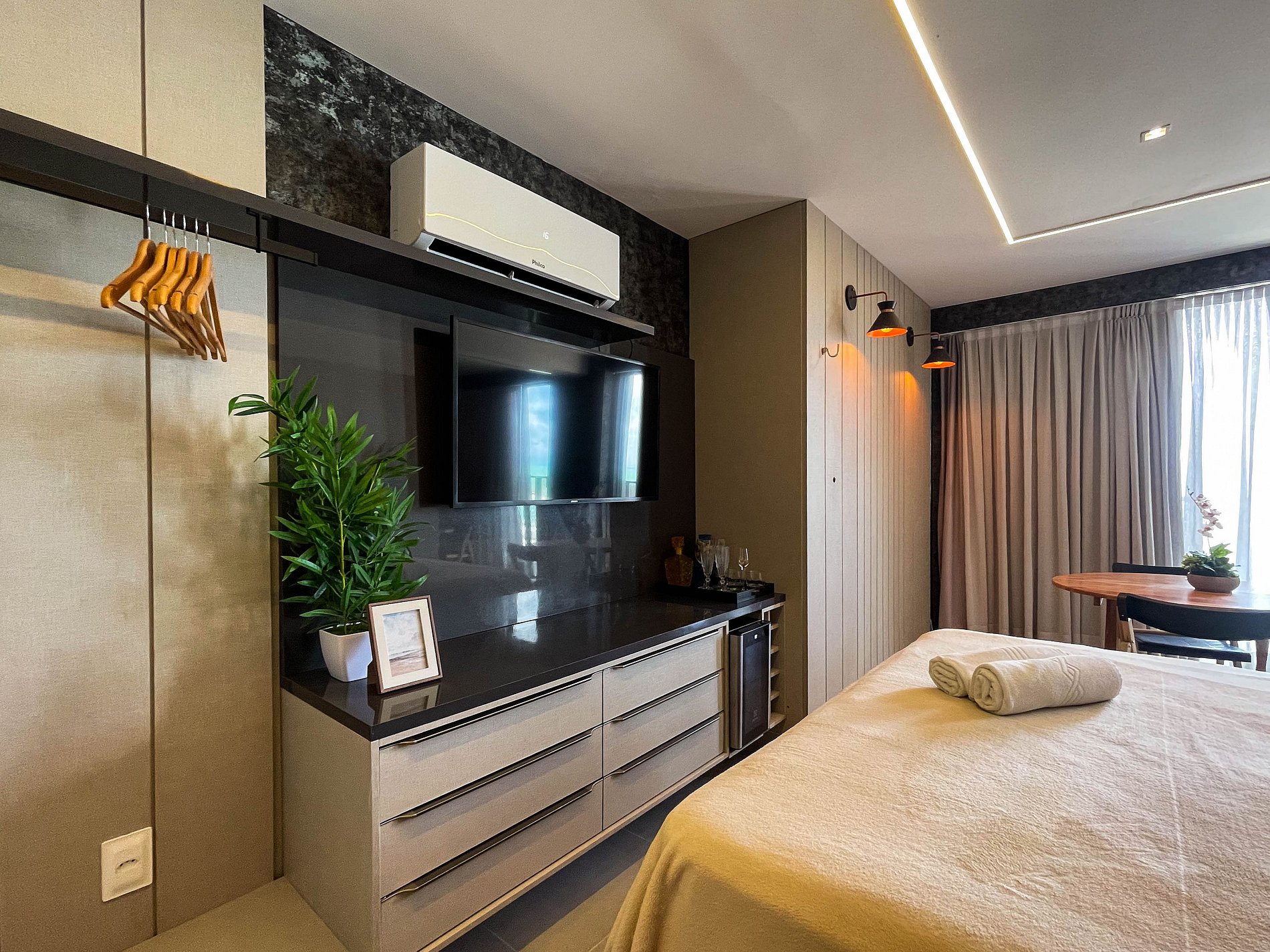 O studio é amplo, bem iluminado e acolhedor. A cama queen convida a noites de descanso profundo, enquanto o ar-condicionado e a cortina blackout garantem conforto térmico e silêncio. A TV completa o ambiente, atendendo tanto momentos de lazer. Wi-fi ainda não disponível.
