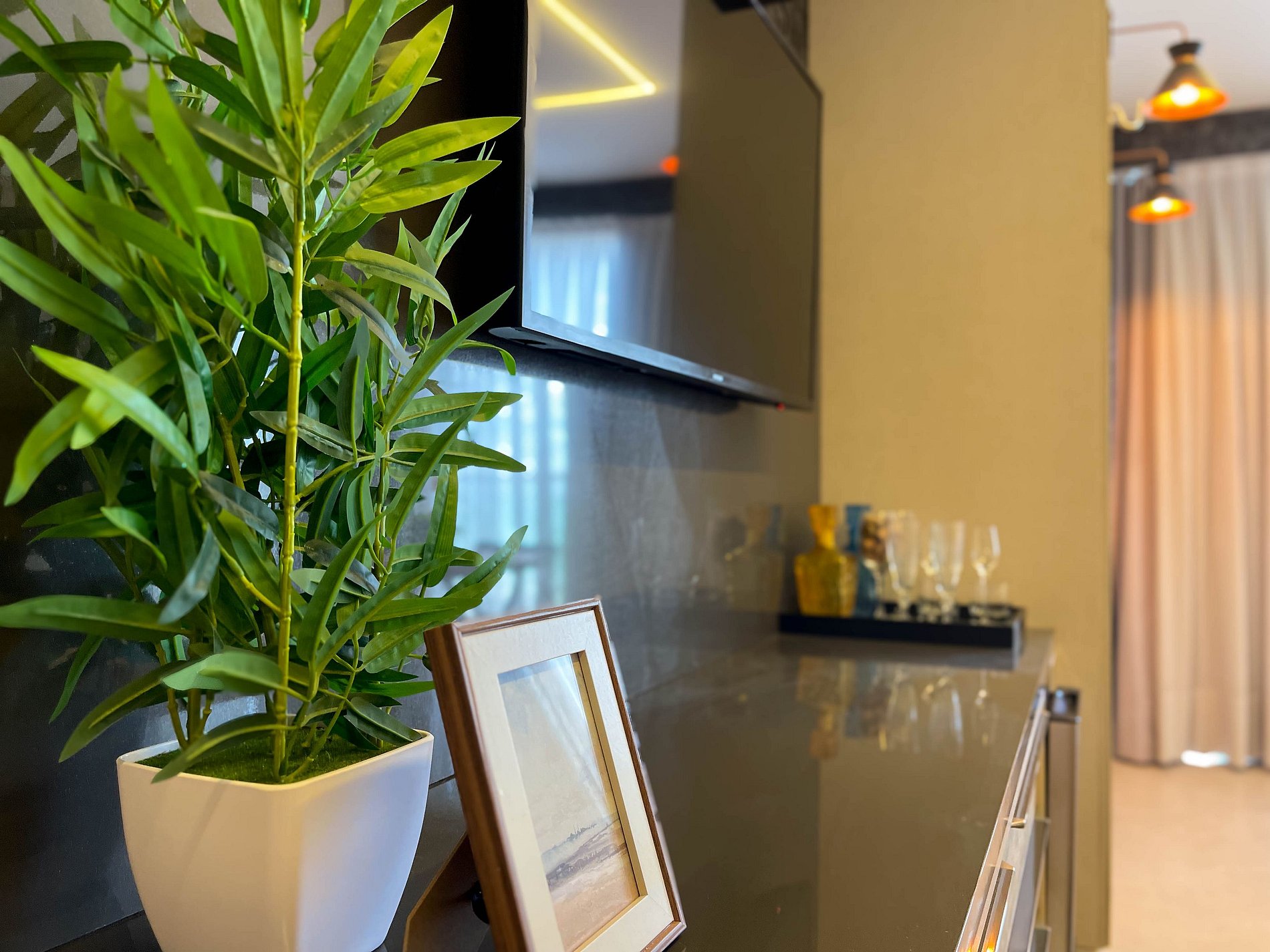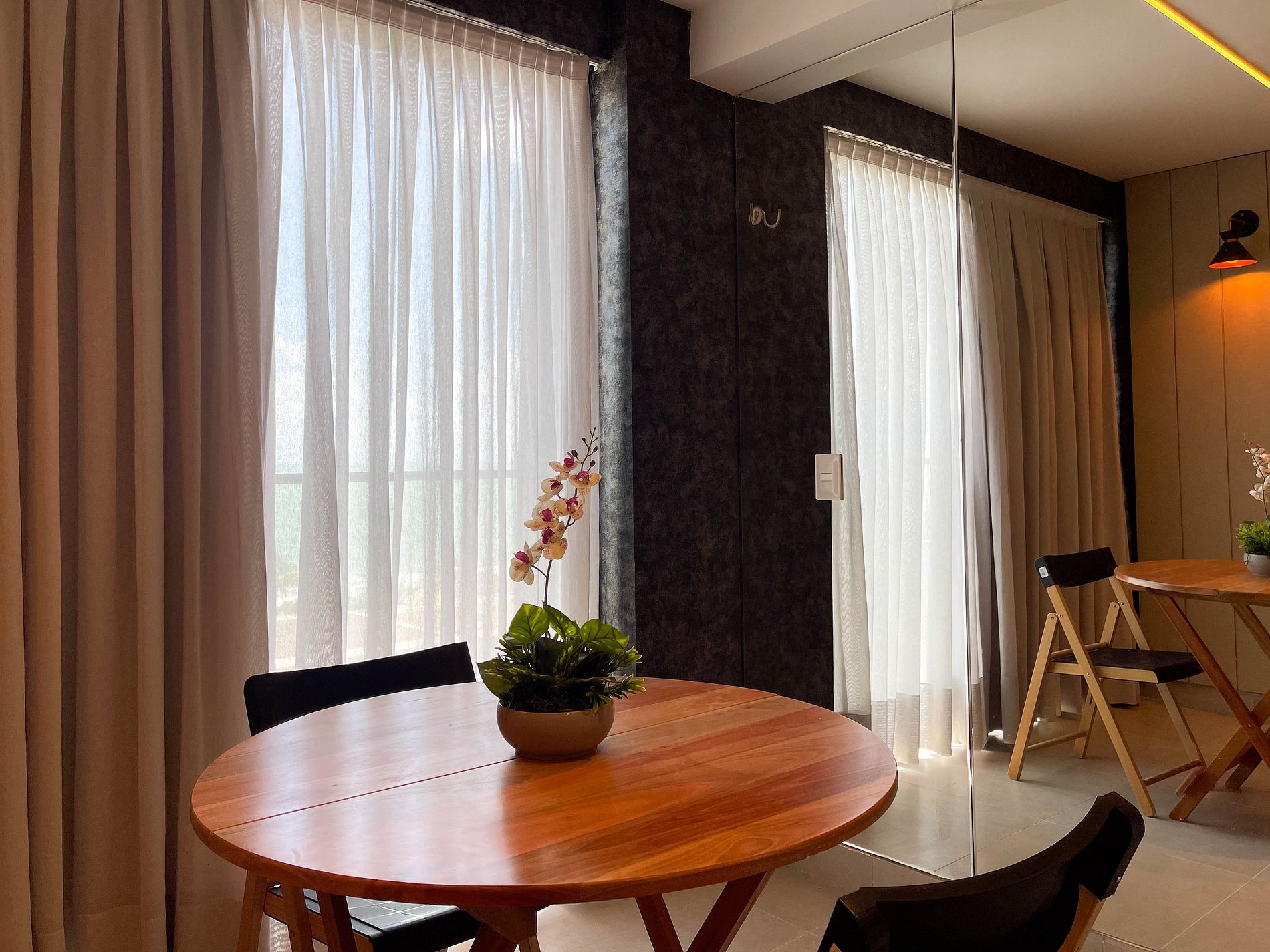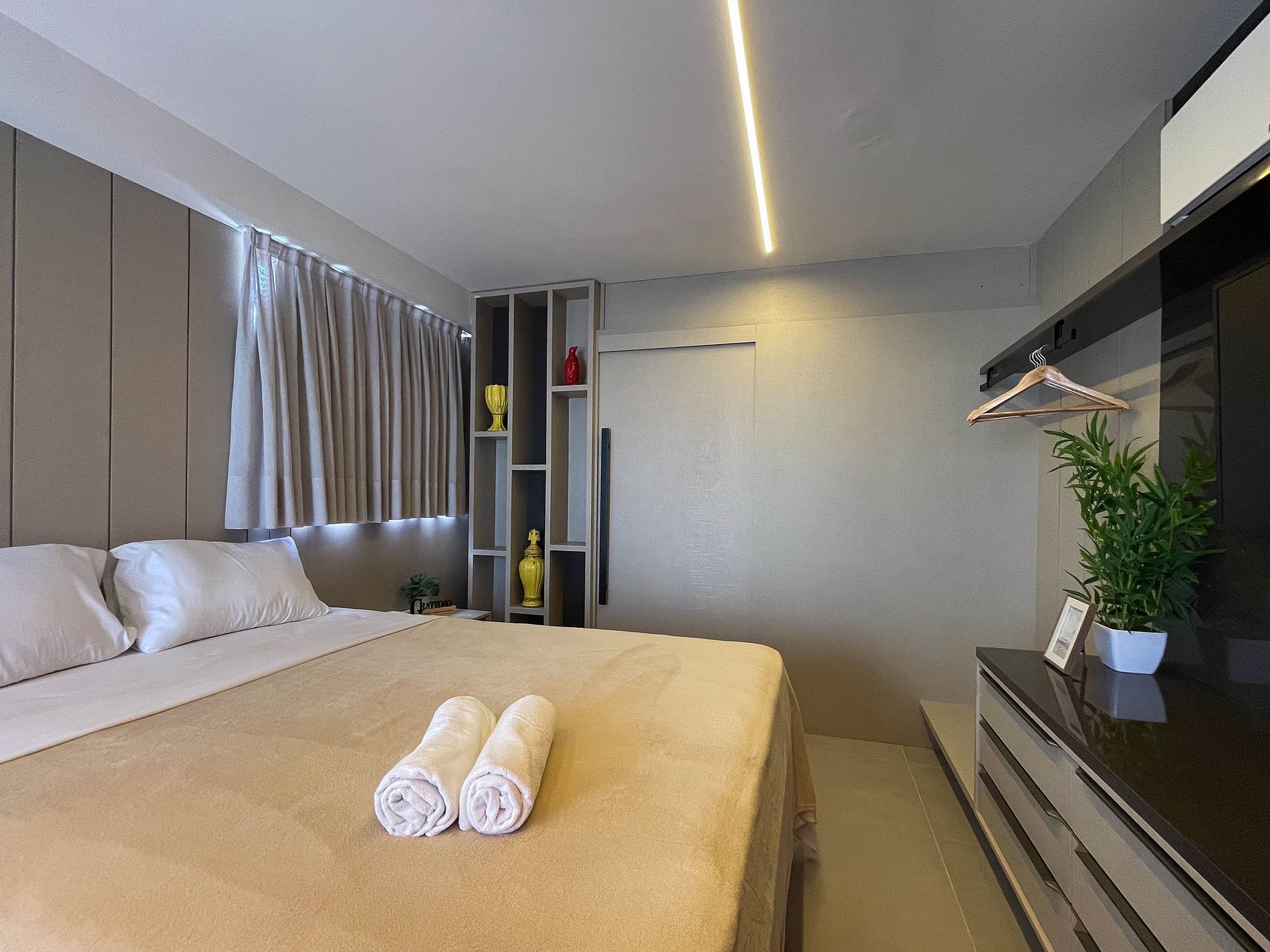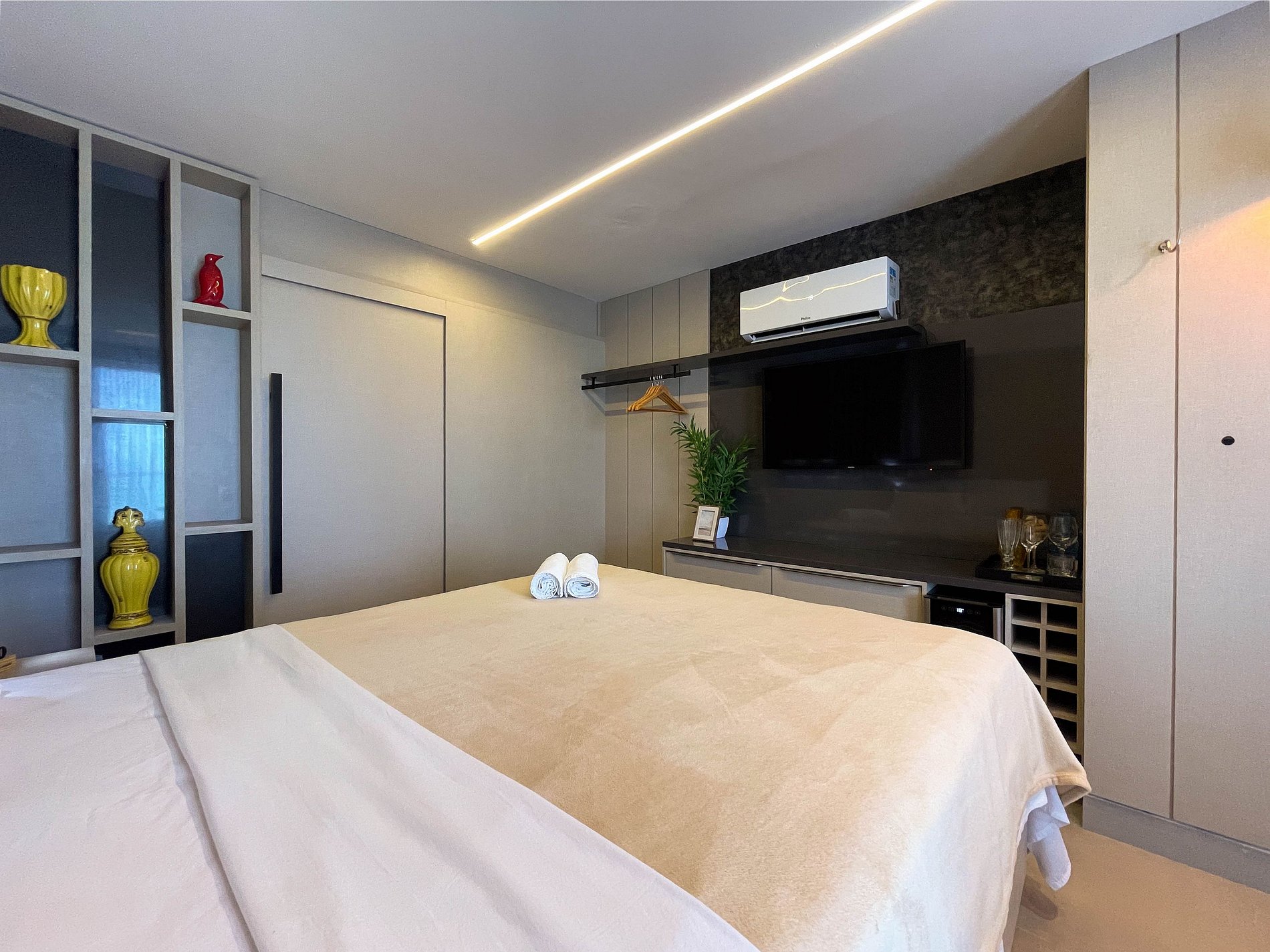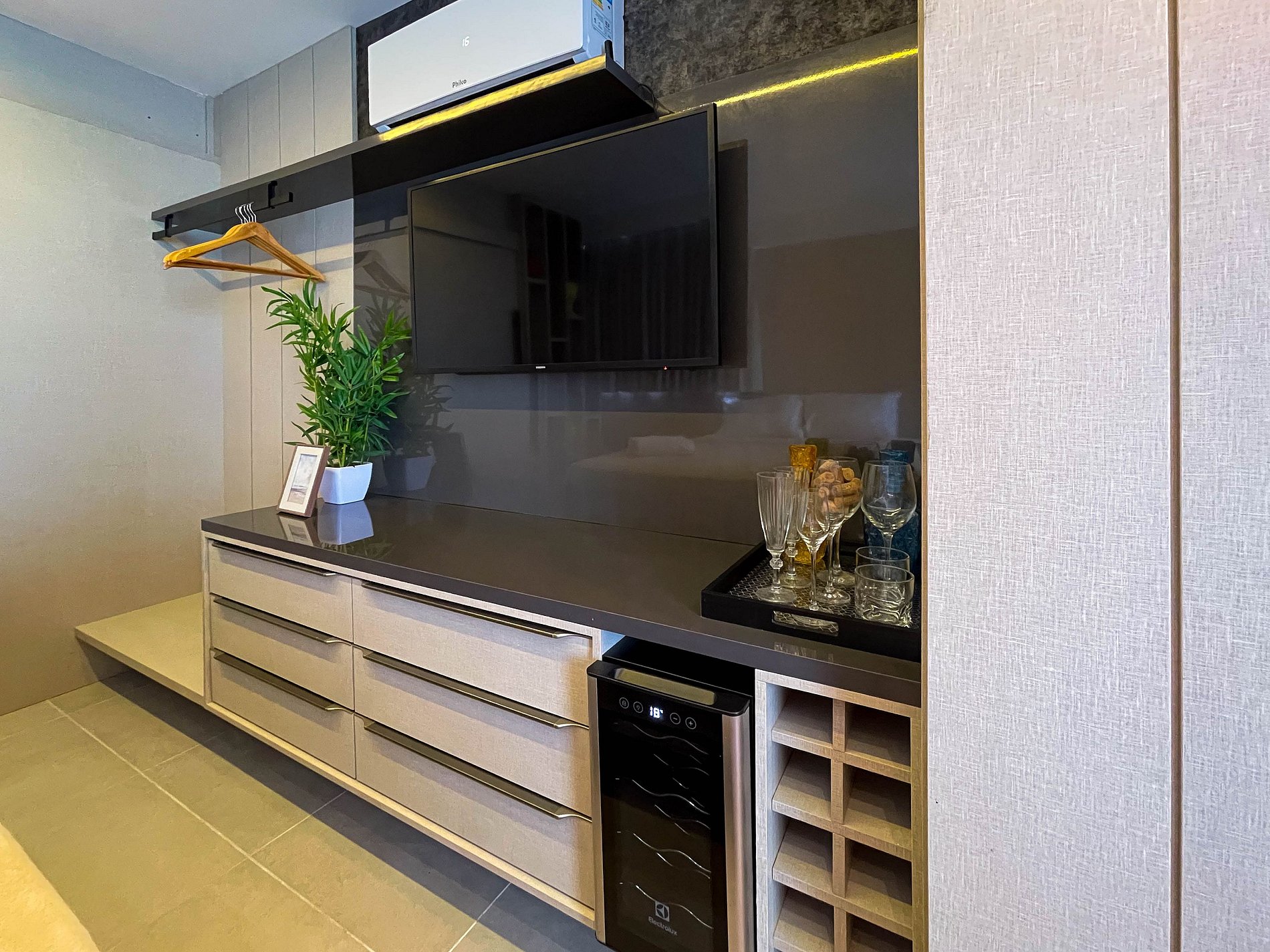 O studio é amplo, bem iluminado e acolhedor. A cama queen convida a noites de descanso profundo, enquanto o ar-condicionado e a cortina blackout garantem conforto térmico e silêncio. A TV completa o ambiente, atendendo tanto momentos de lazer. Wi-fi ainda não disponível.
