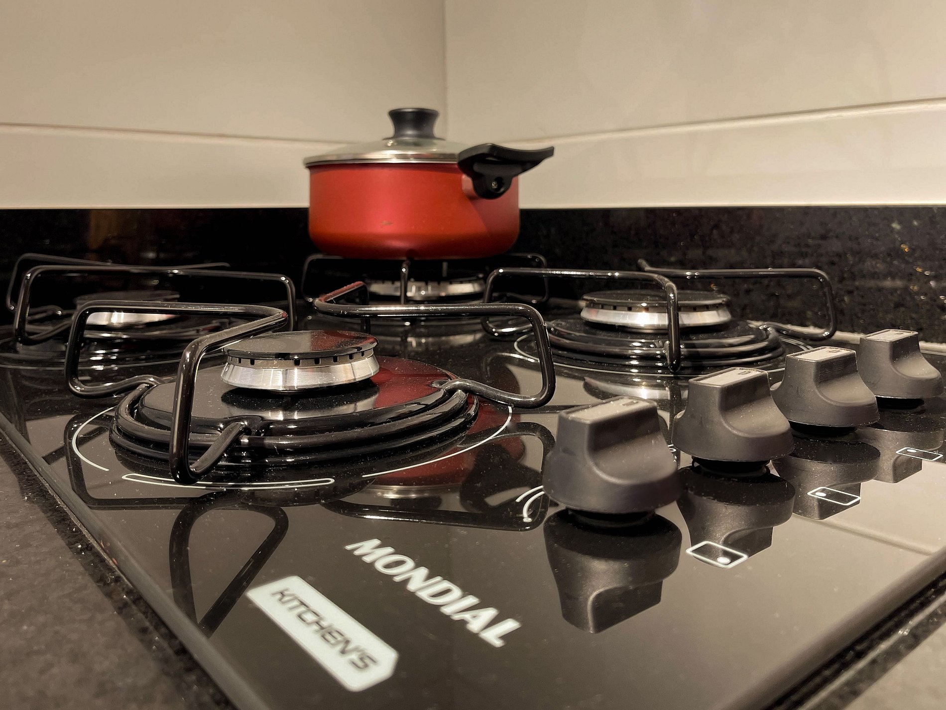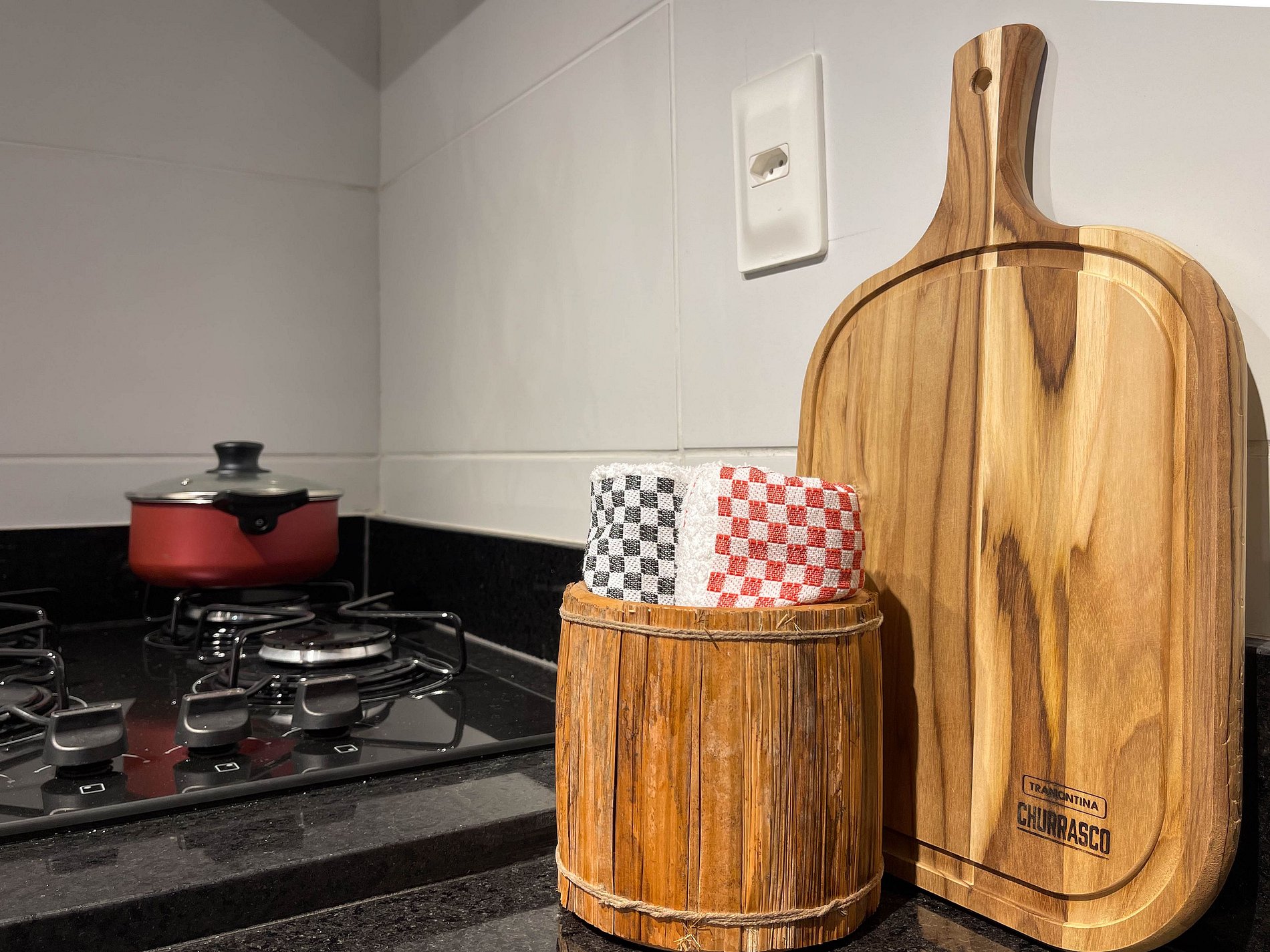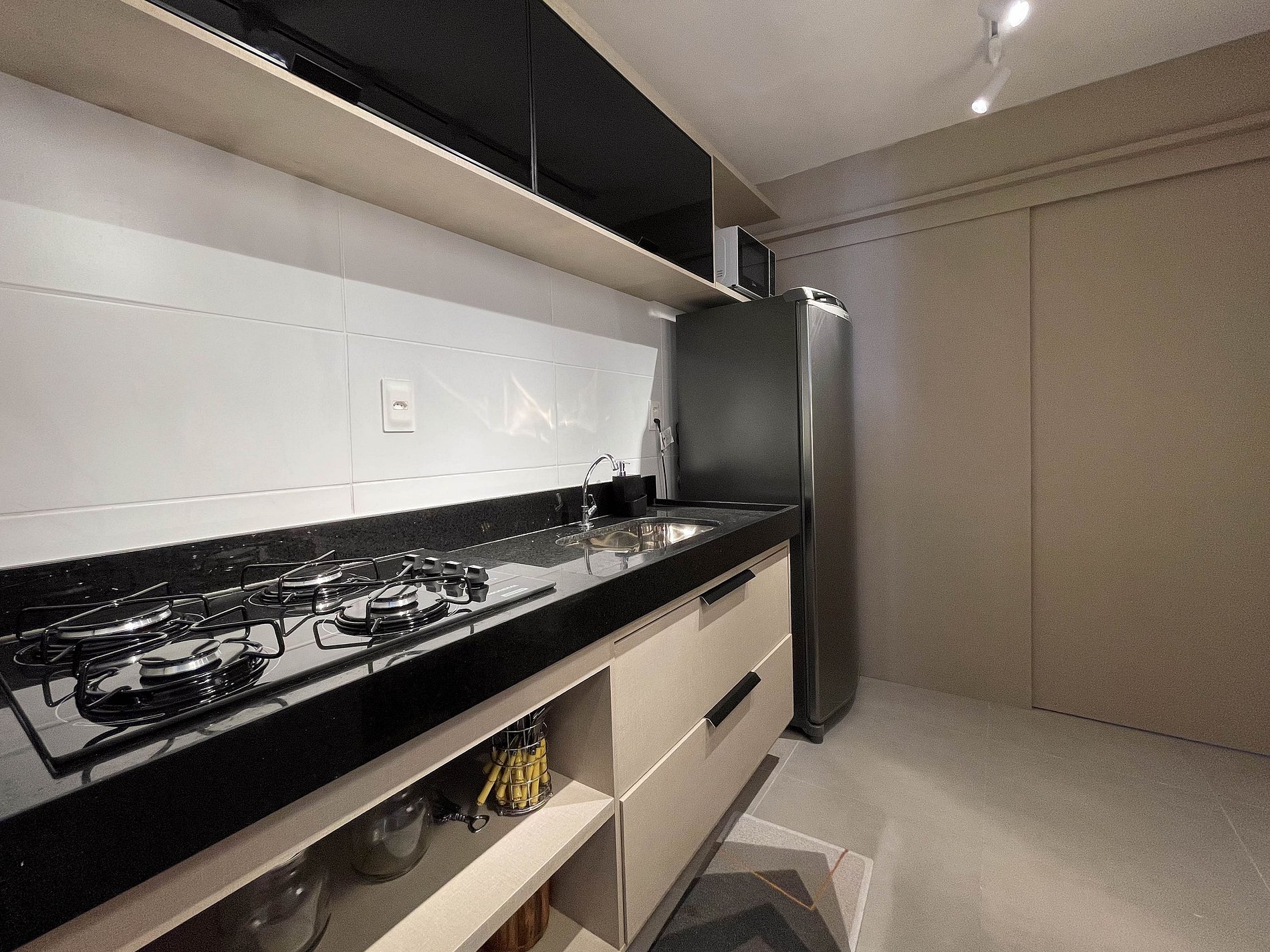 A área de cozinha é funcional, equipada com fogão, micro-ondas, geladeira, cafeteira, liquidificador, ferro de passar roupas e até adega, oferecendo autonomia e praticidade para o dia a dia. Cada detalhe foi pensado para criar a sensação de estar em casa, com organização, conforto e facilidade.