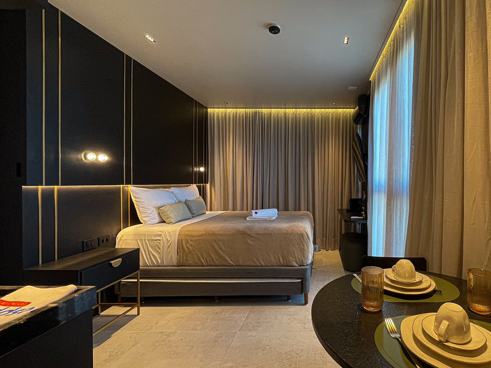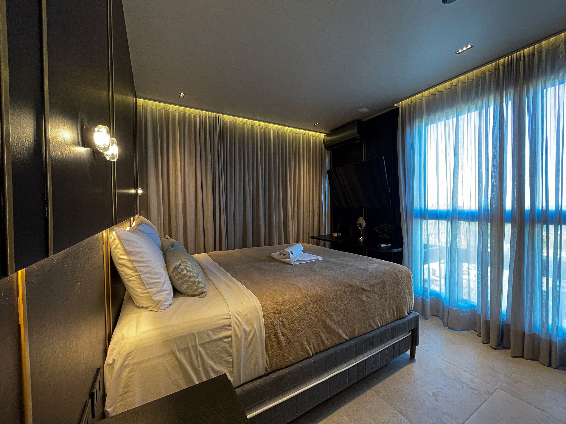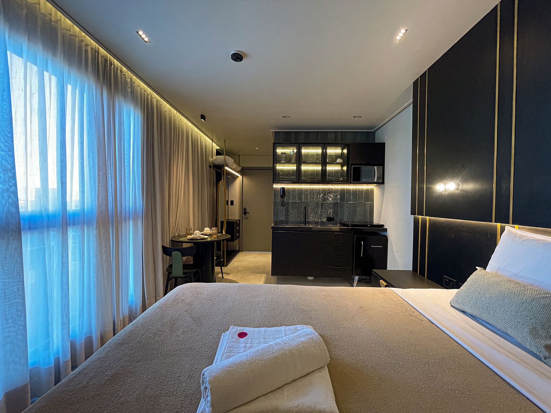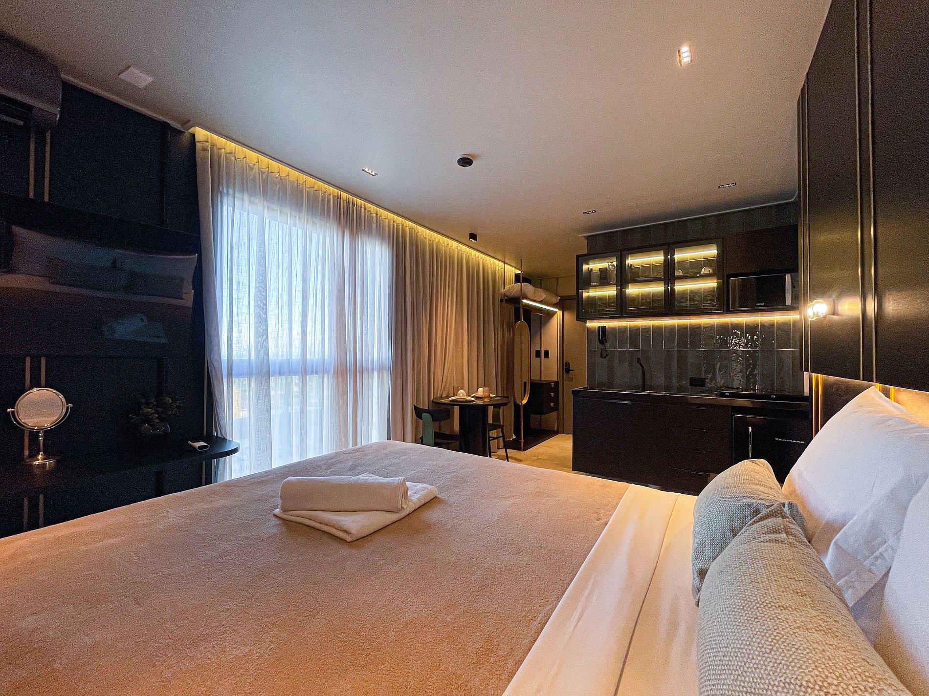 O studio é amplo, bem iluminado e transmite uma atmosfera de luxo discreto. A cama queen garante noites de descanso absoluto, enquanto o ar-condicionado e as cortinas blackout proporcionam conforto térmico e silêncio.