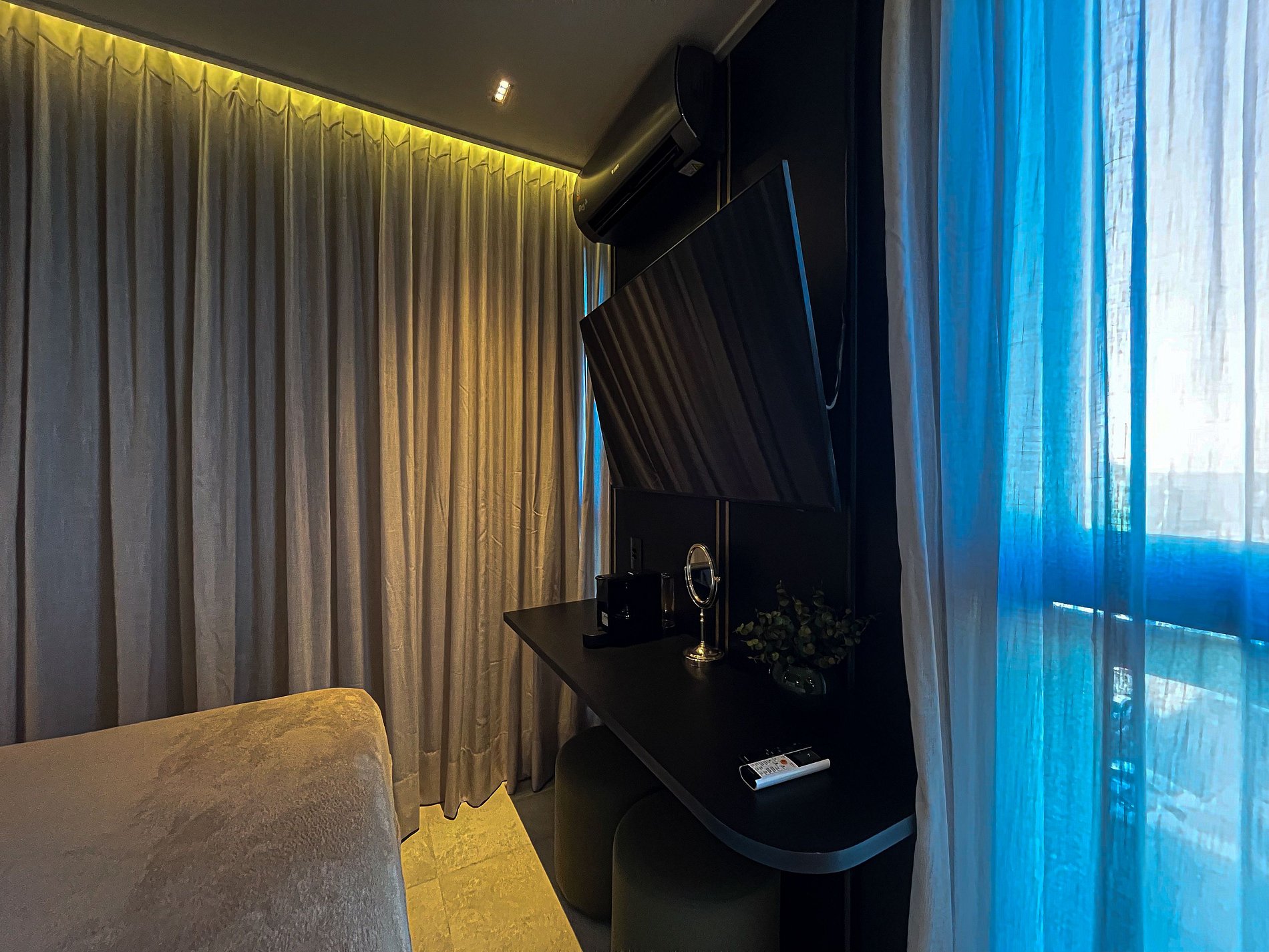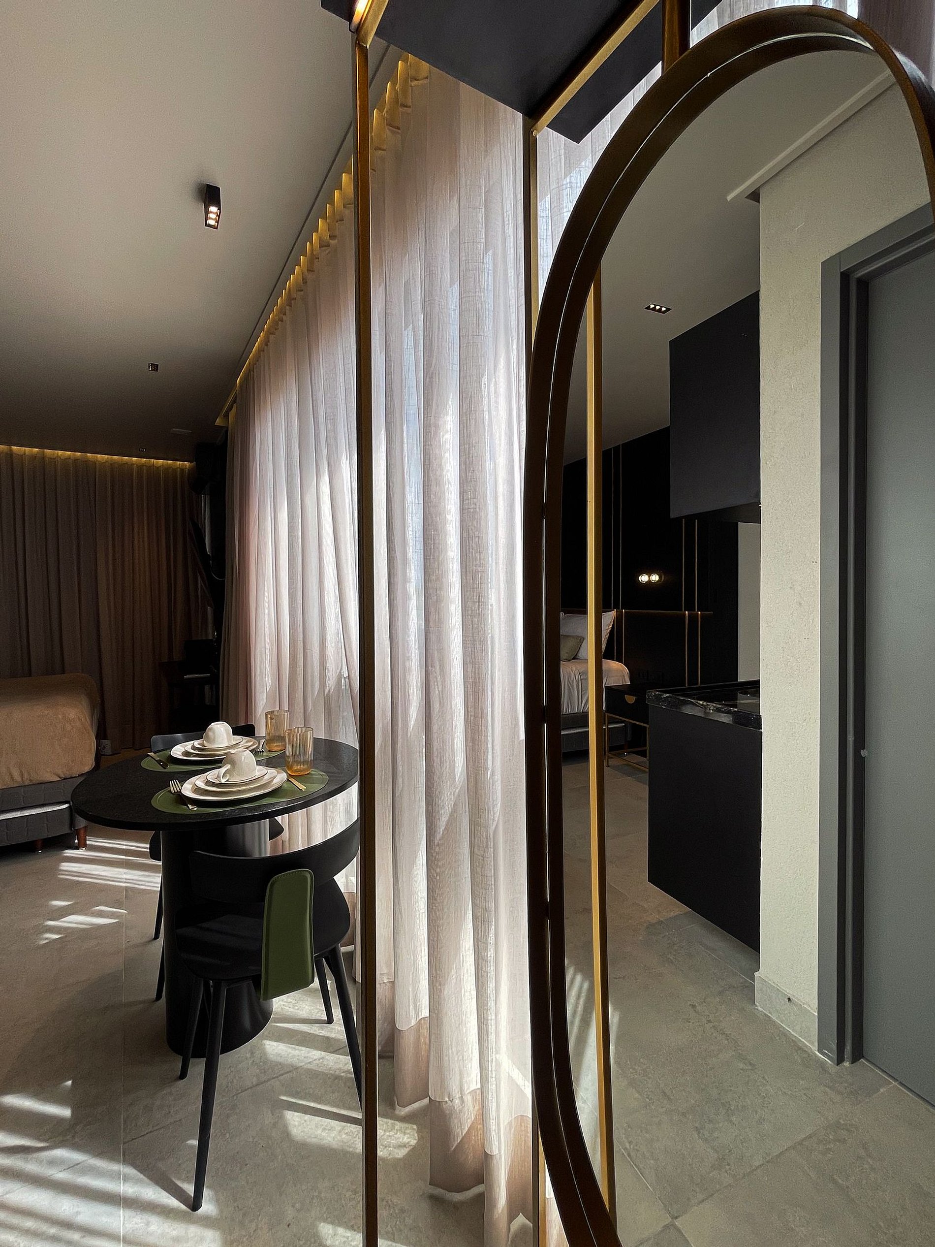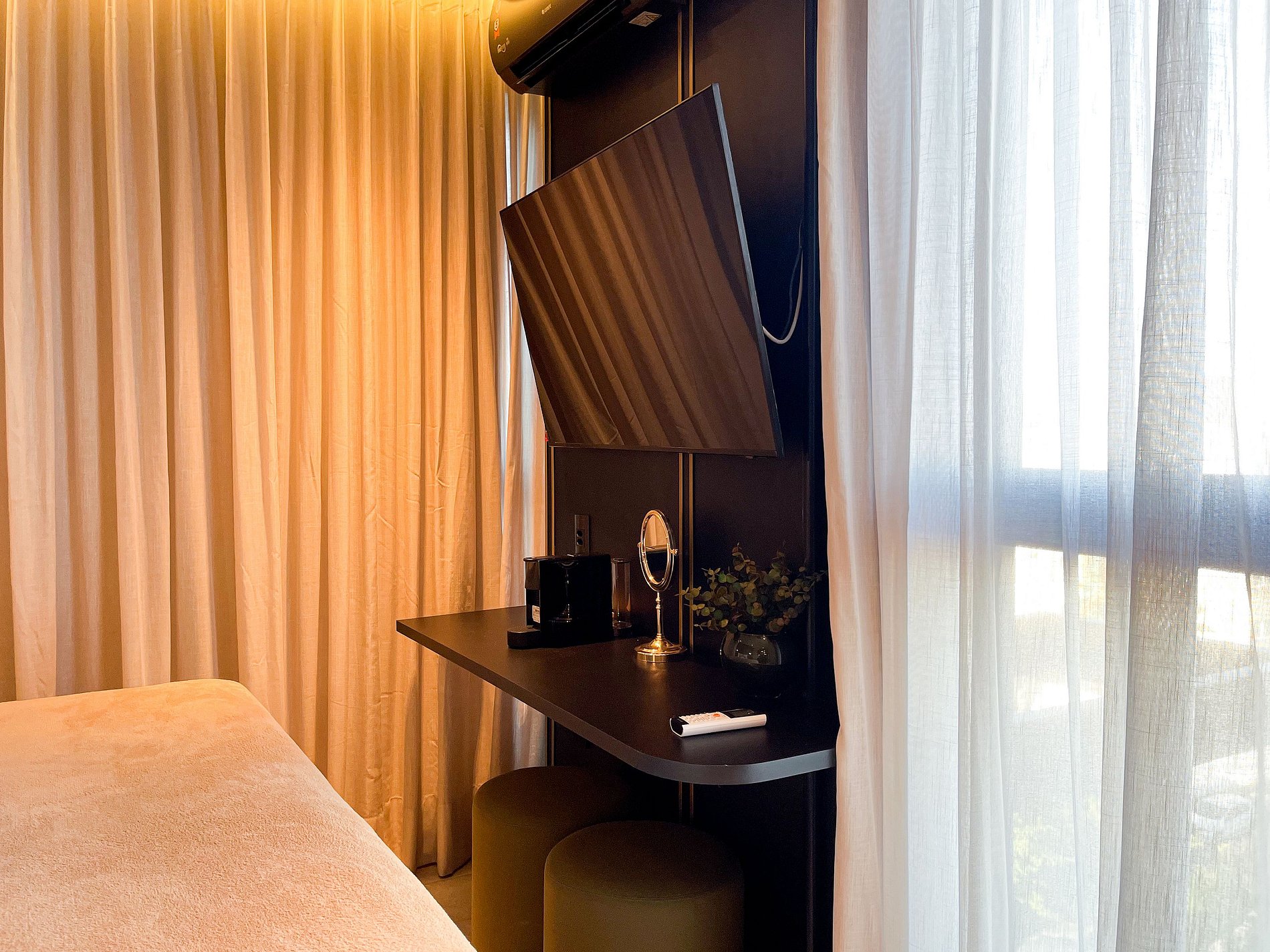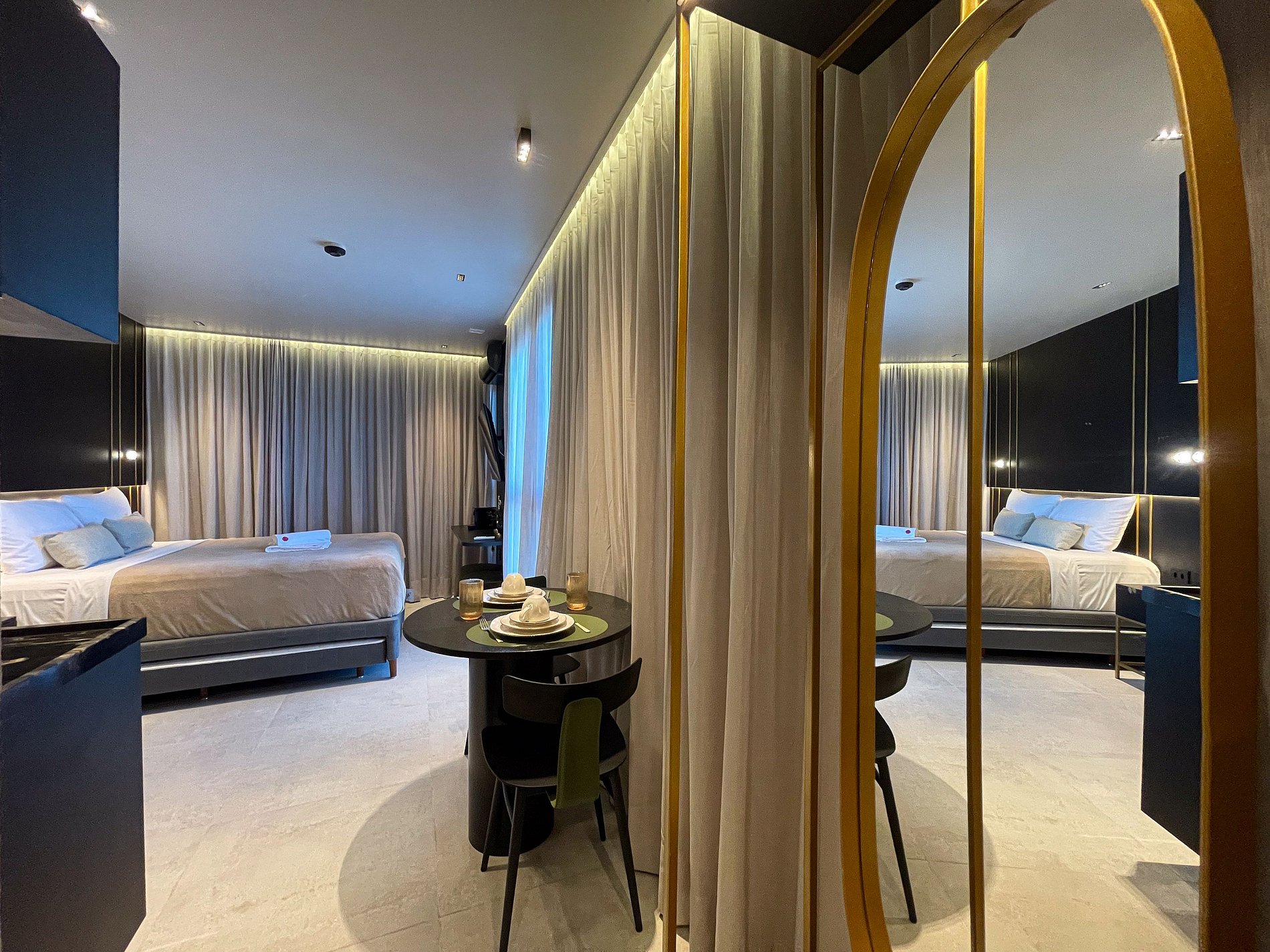 O studio é amplo, bem iluminado e transmite uma atmosfera de luxo discreto. A cama queen garante noites de descanso absoluto, enquanto o ar-condicionado e as cortinas blackout proporcionam conforto térmico e silêncio.