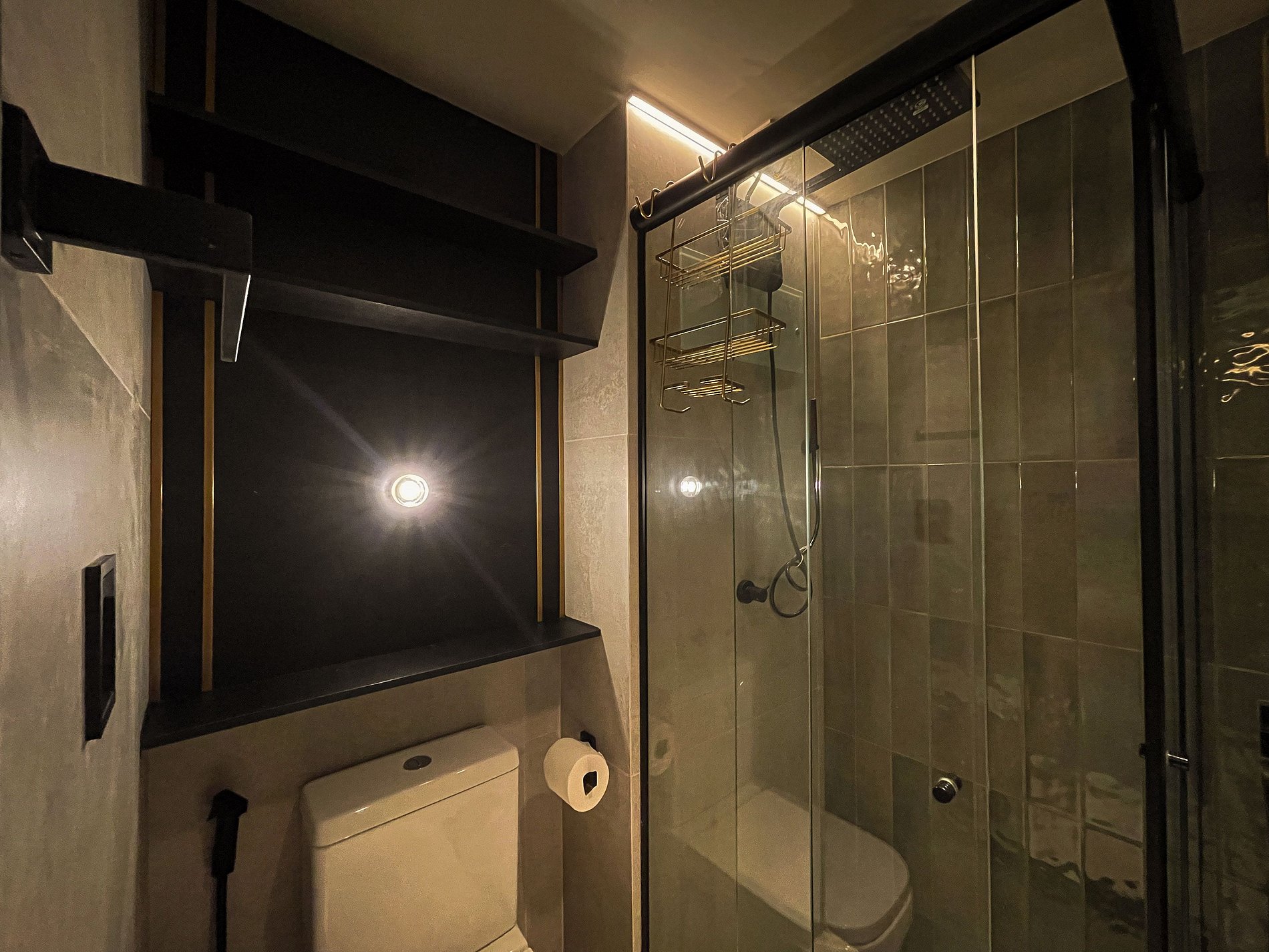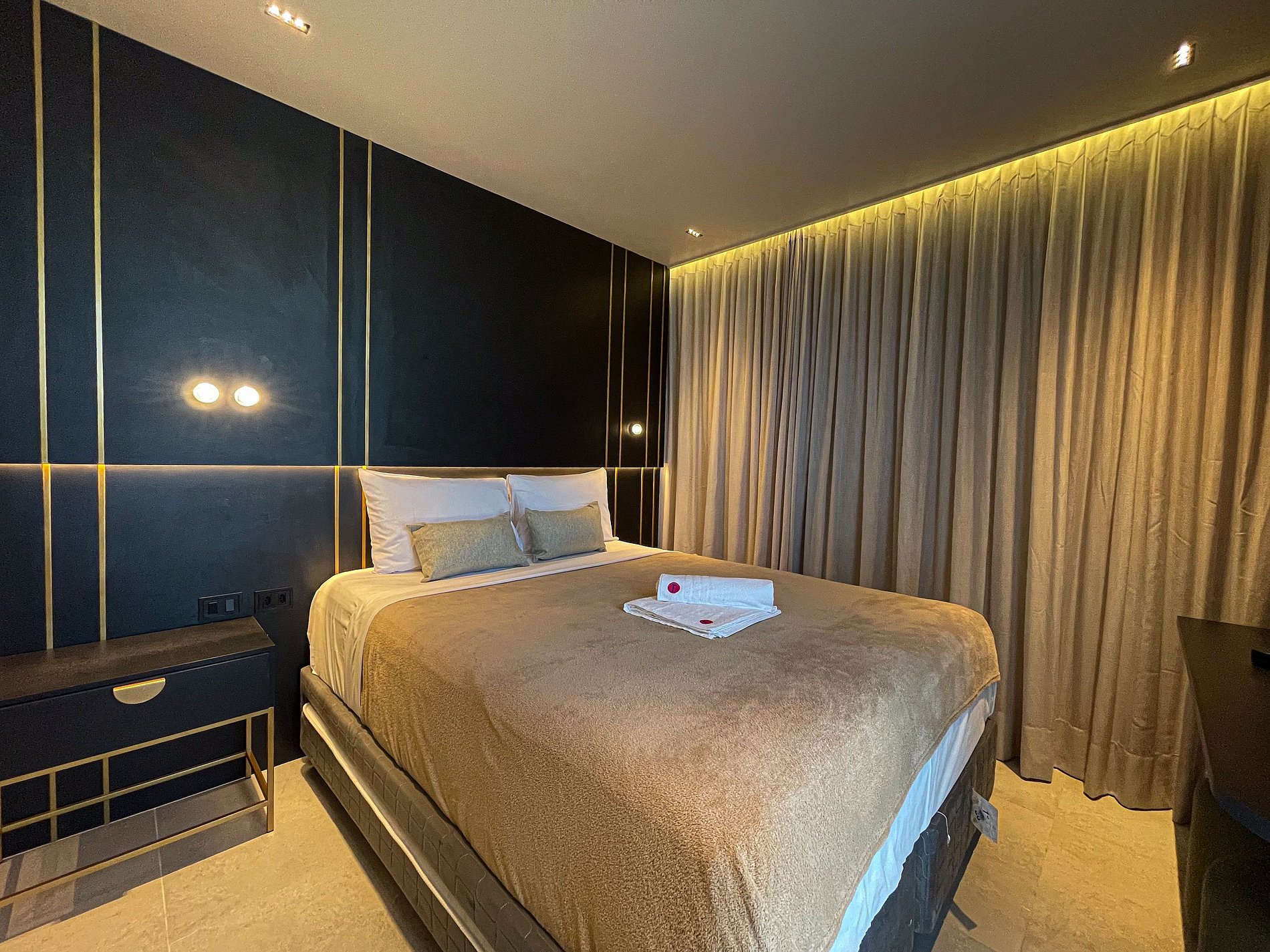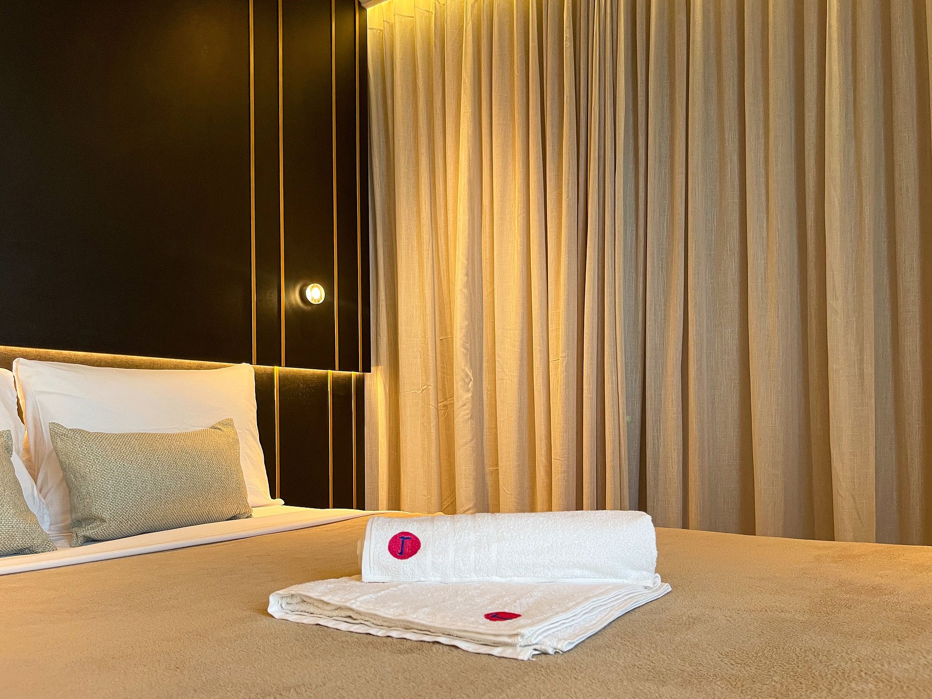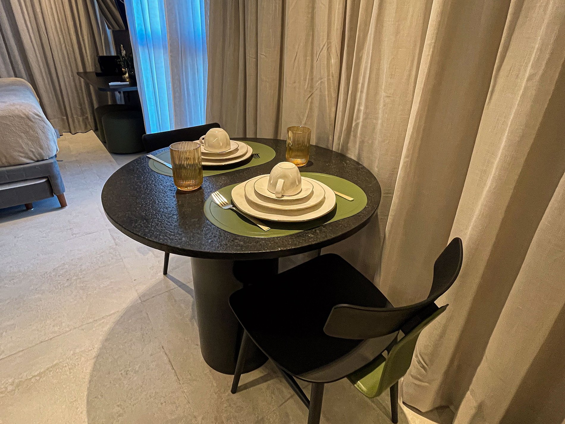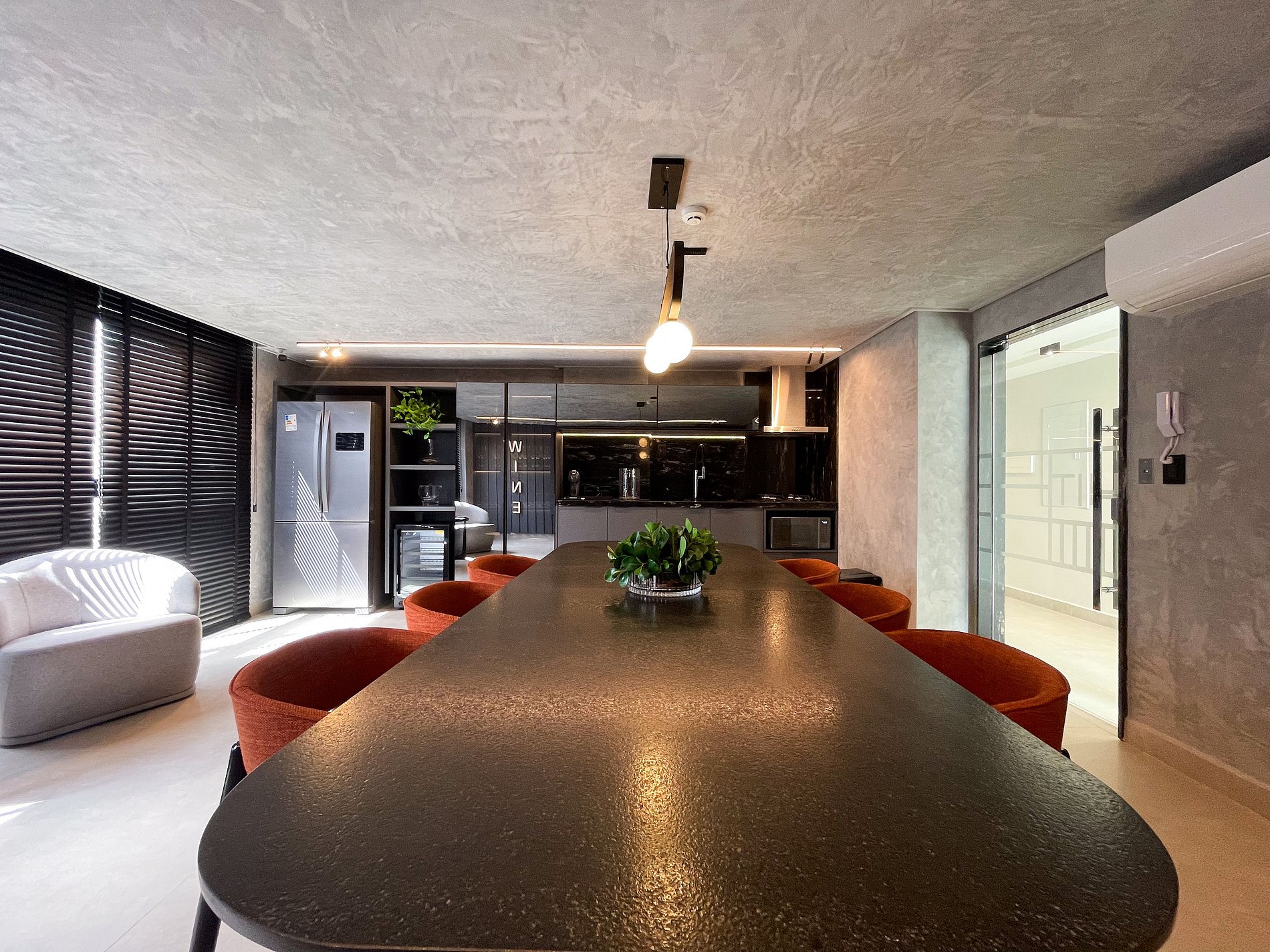 O studio é amplo, bem iluminado e transmite uma atmosfera de luxo discreto. A cama queen garante noites de descanso absoluto, enquanto o ar-condicionado e as cortinas blackout proporcionam conforto térmico e silêncio.