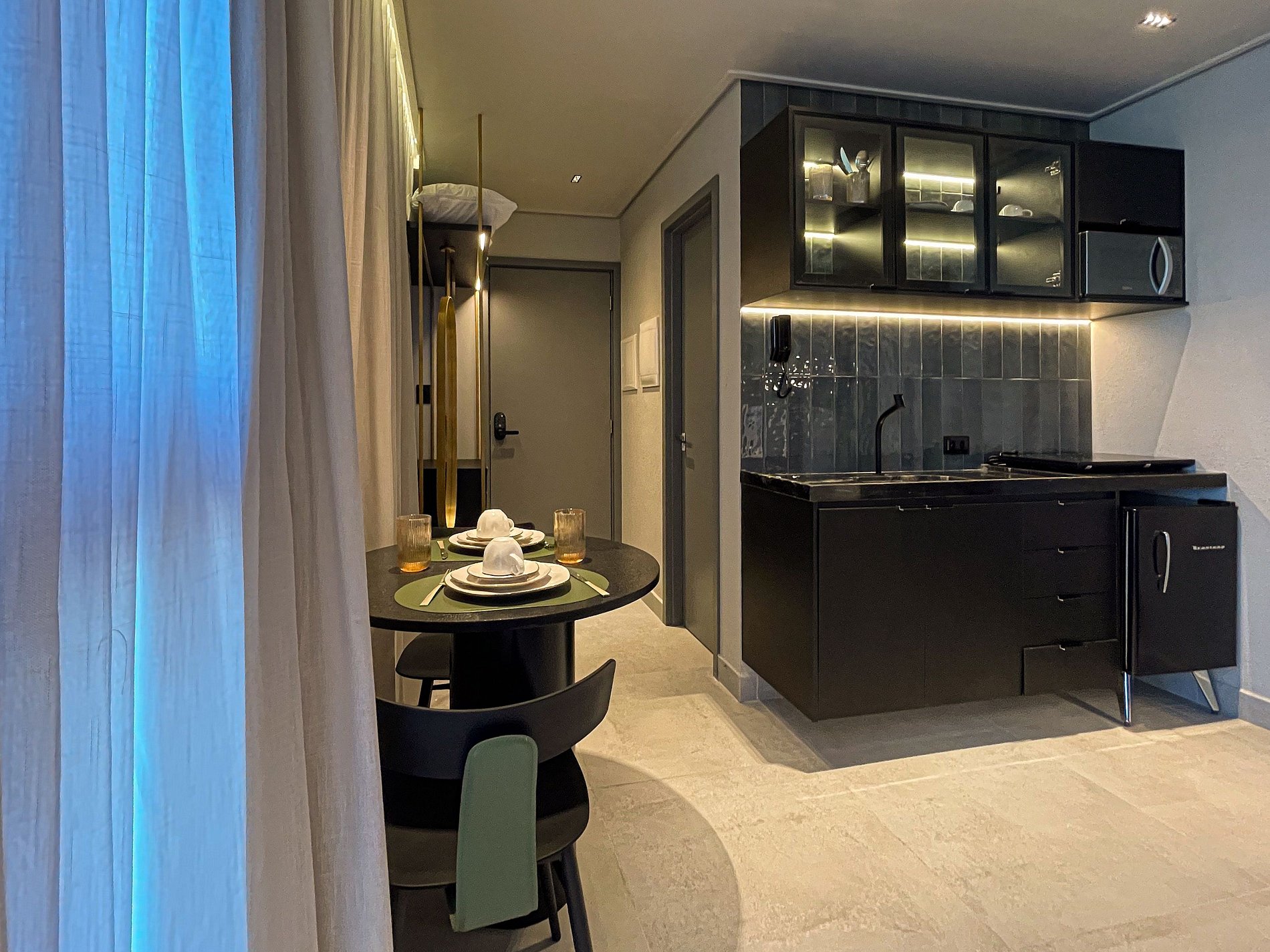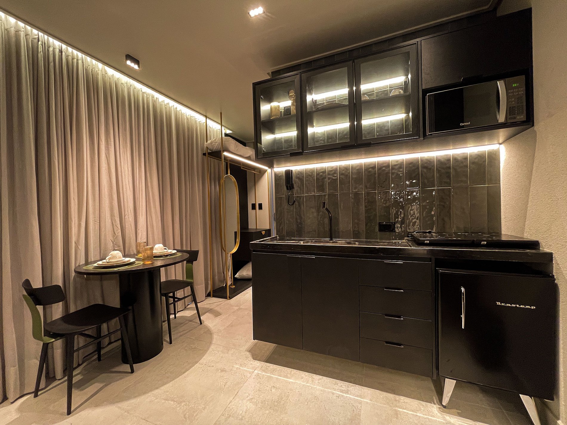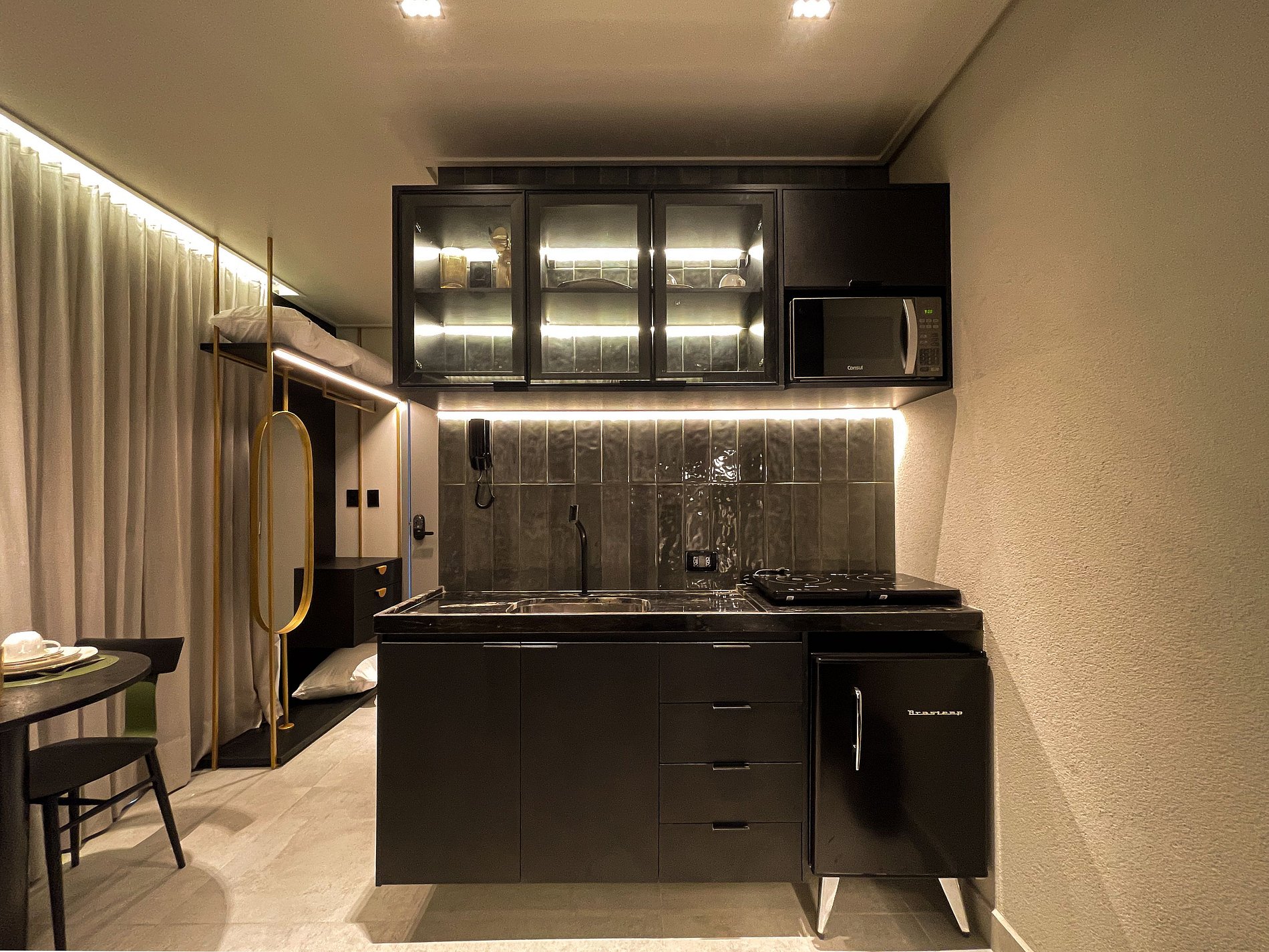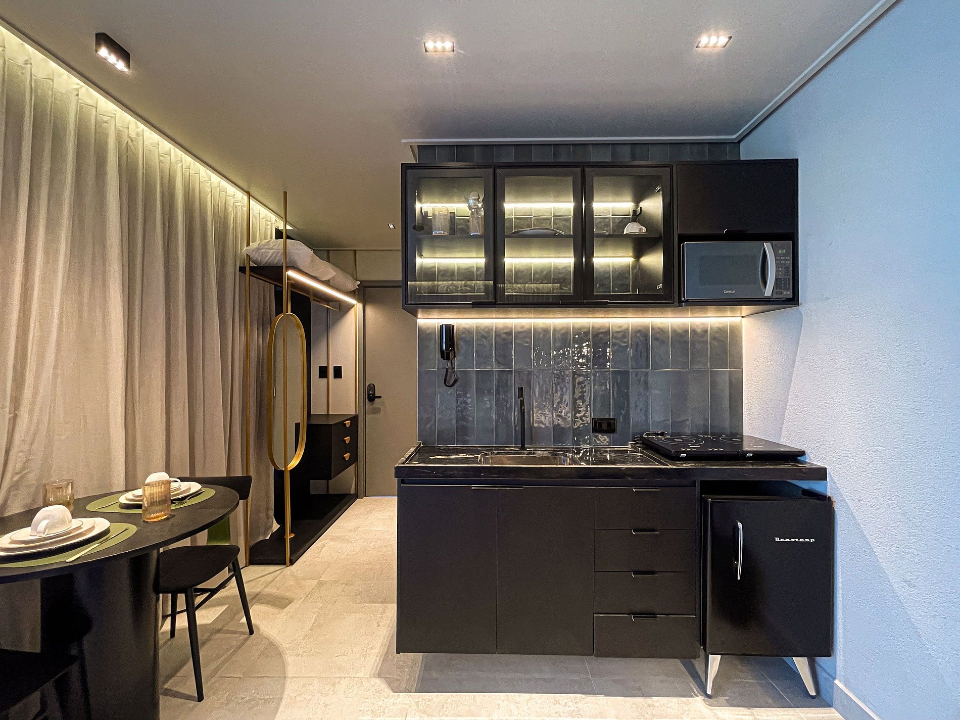 A área de cozinha é funcional e elegante, equipada com fogão, micro-ondas, frigobar, cafeteira Nespresso, liquidificador e ferro de passar roupas, oferecendo total autonomia para o dia a dia. Cada detalhe foi pensado para que o hóspede se sinta em casa, com praticidade, organização e conforto em todos os momentos.