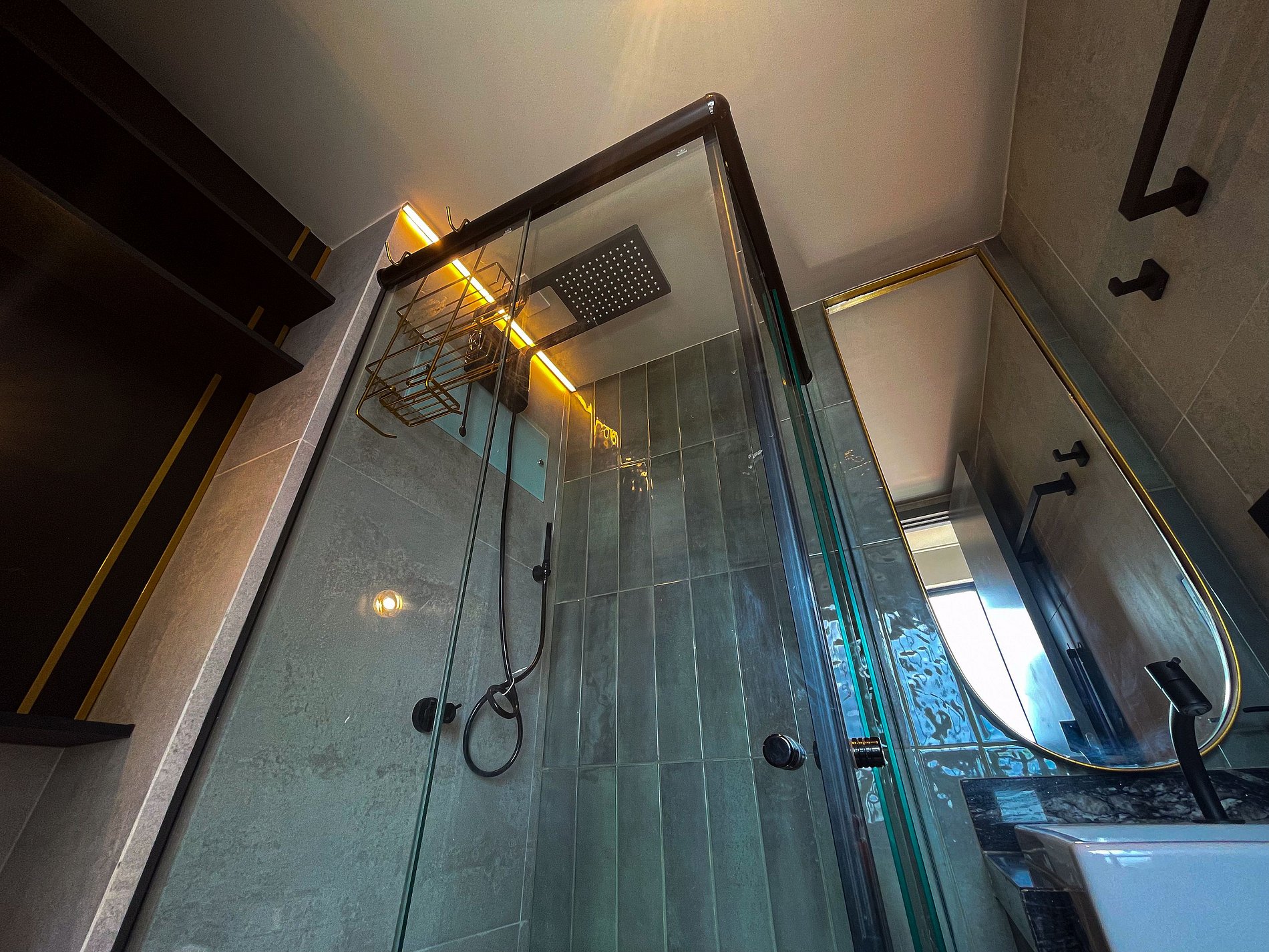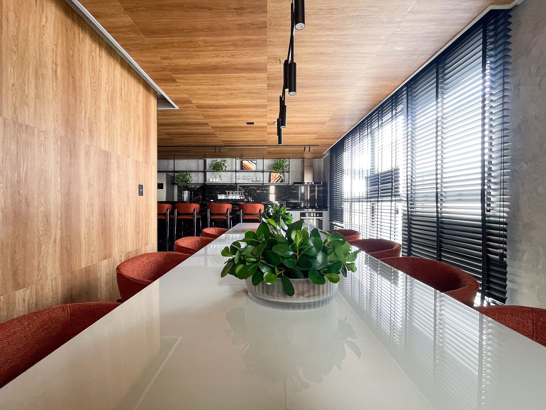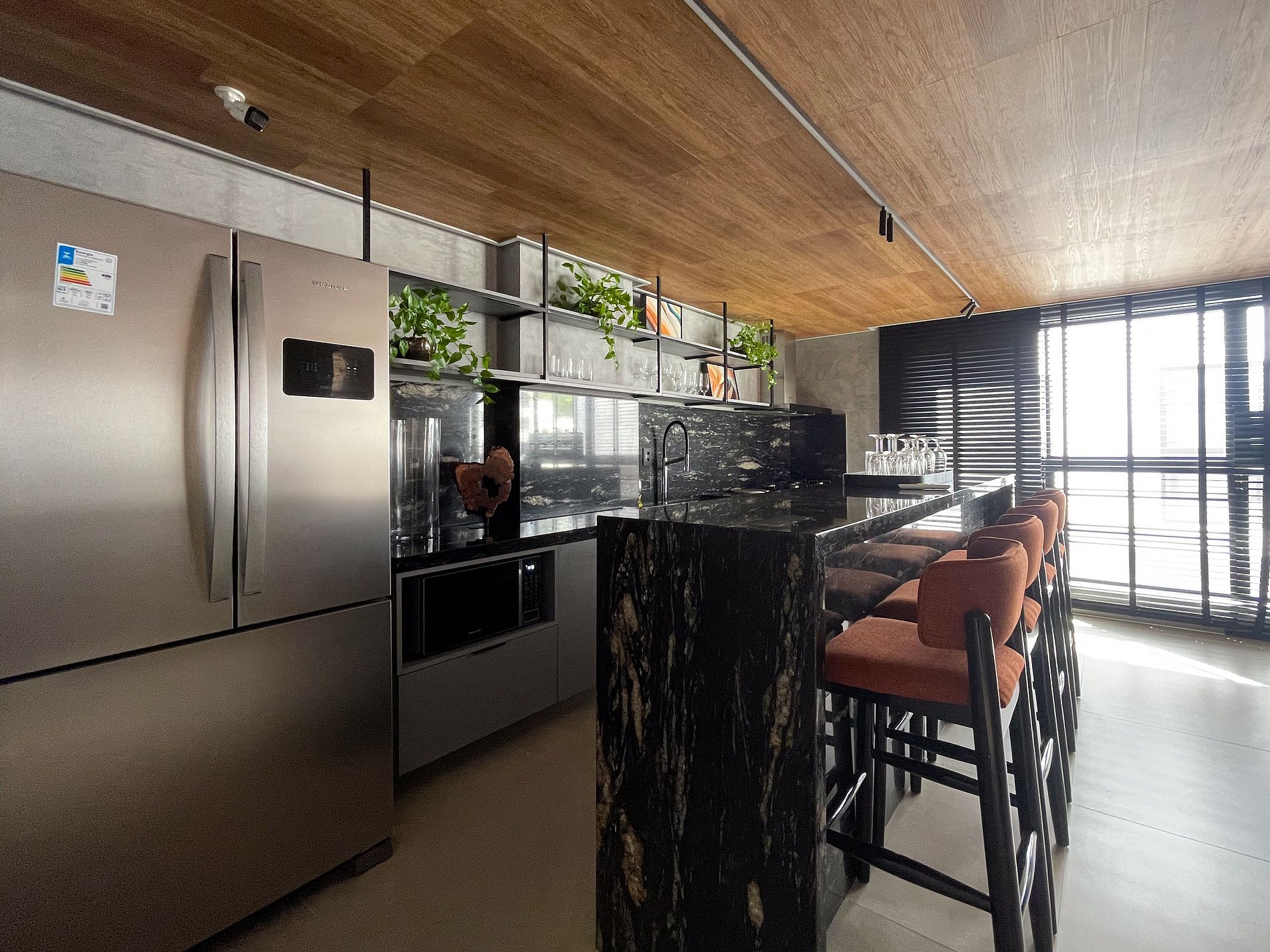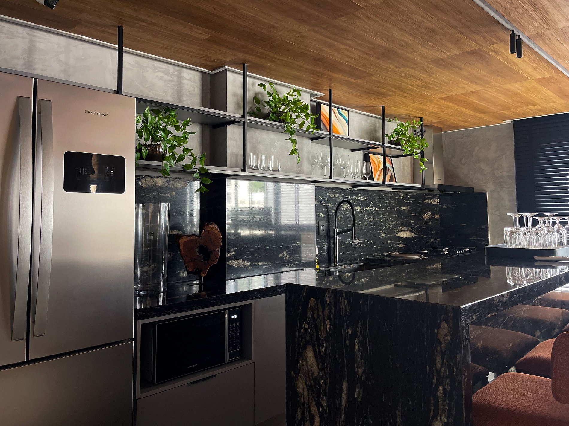 A área de cozinha é funcional e elegante, equipada com fogão, micro-ondas, frigobar, cafeteira Nespresso, liquidificador e ferro de passar roupas, oferecendo total autonomia para o dia a dia. Cada detalhe foi pensado para que o hóspede se sinta em casa, com praticidade, organização e conforto em todos os momentos.
