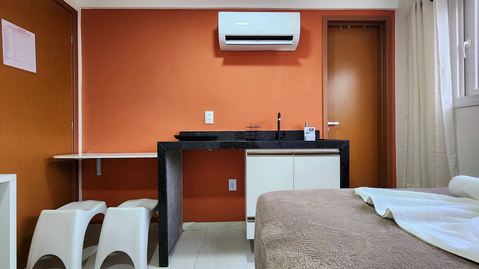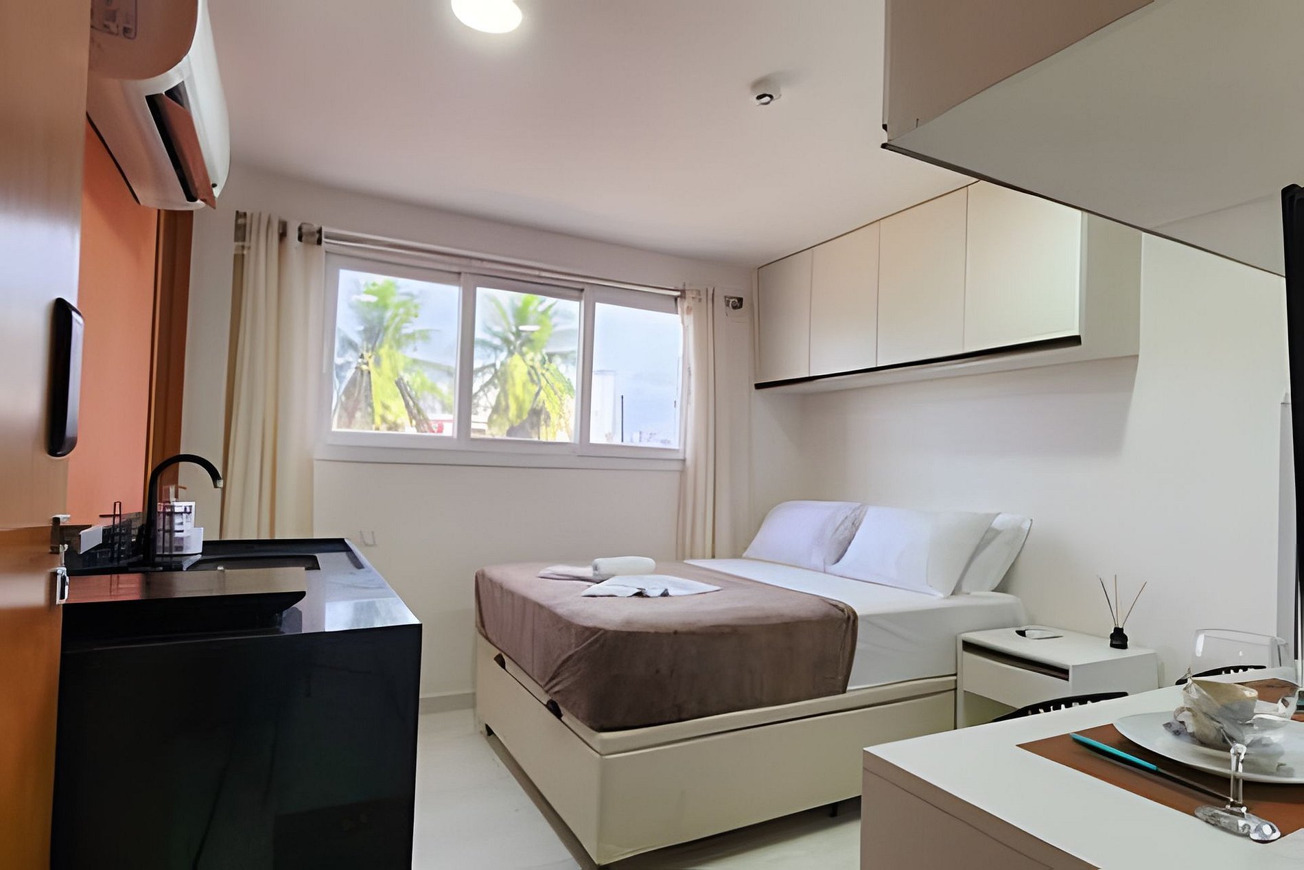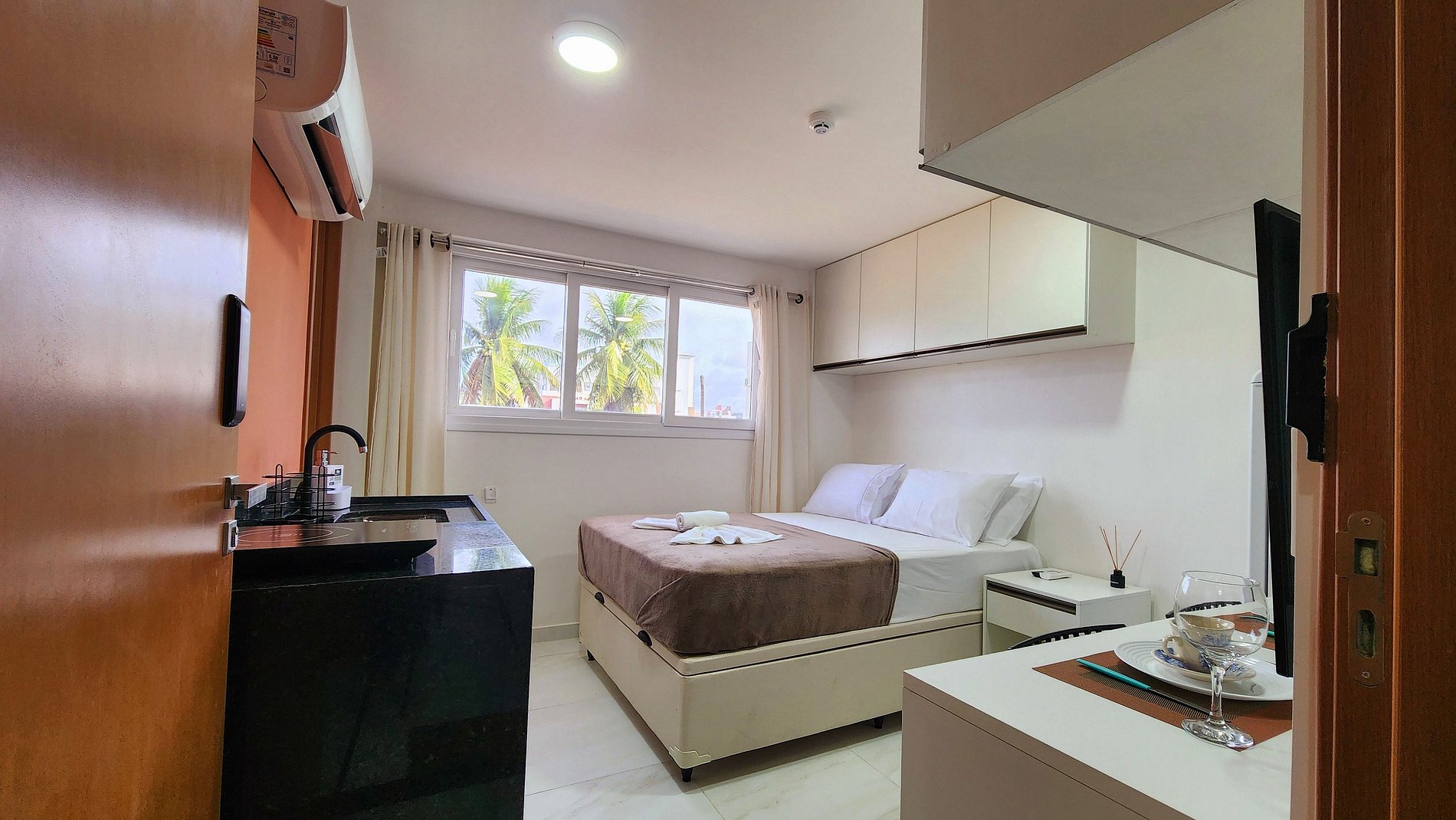 Acomodação: O quarto dispõe de uma confortável cama de casal, ar condicionado para noites tranquilas, TV para seu entretenimento, e uma mesa para refeições ou trabalho. A cozinha é totalmente equipada com mini fogão de 1 boca, geladeira, liquidificador, sanduicheira, air fryer e microondas, além de pratos, xícaras e talheres, permitindo que você prepare suas refeições com facilidade.