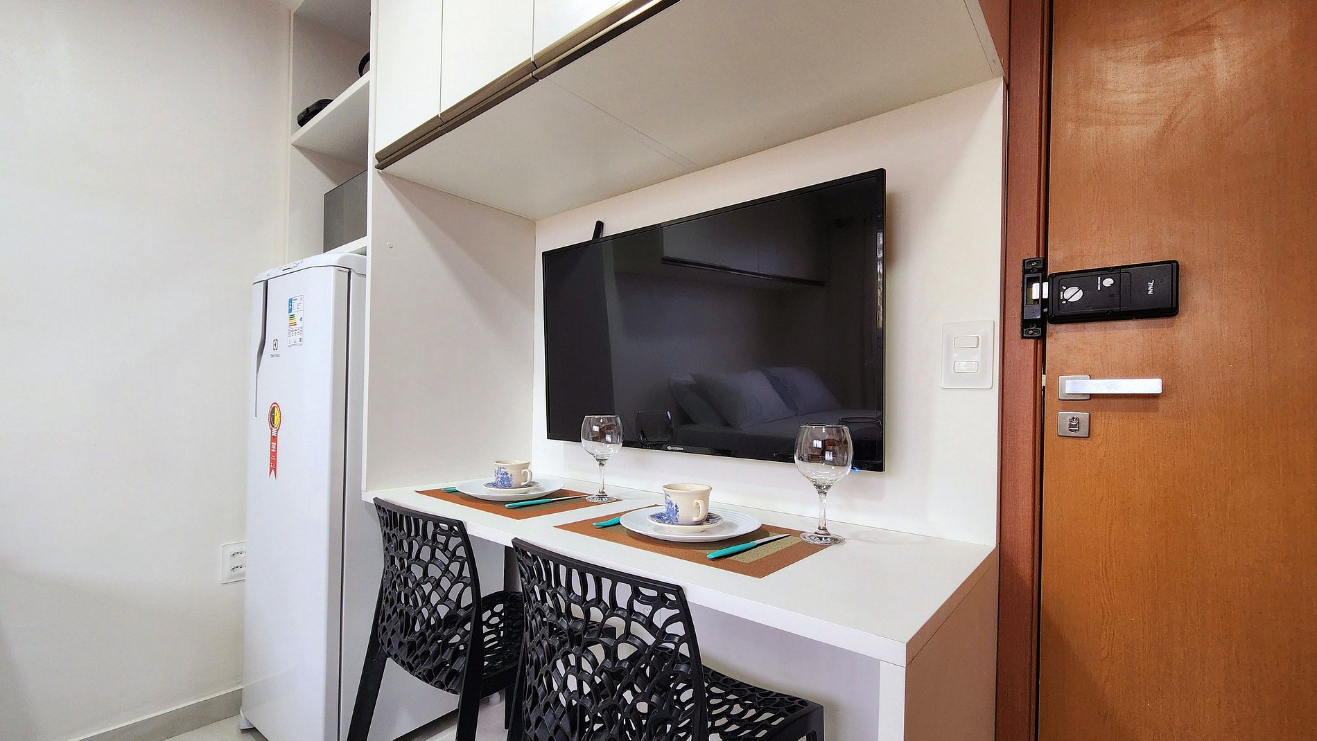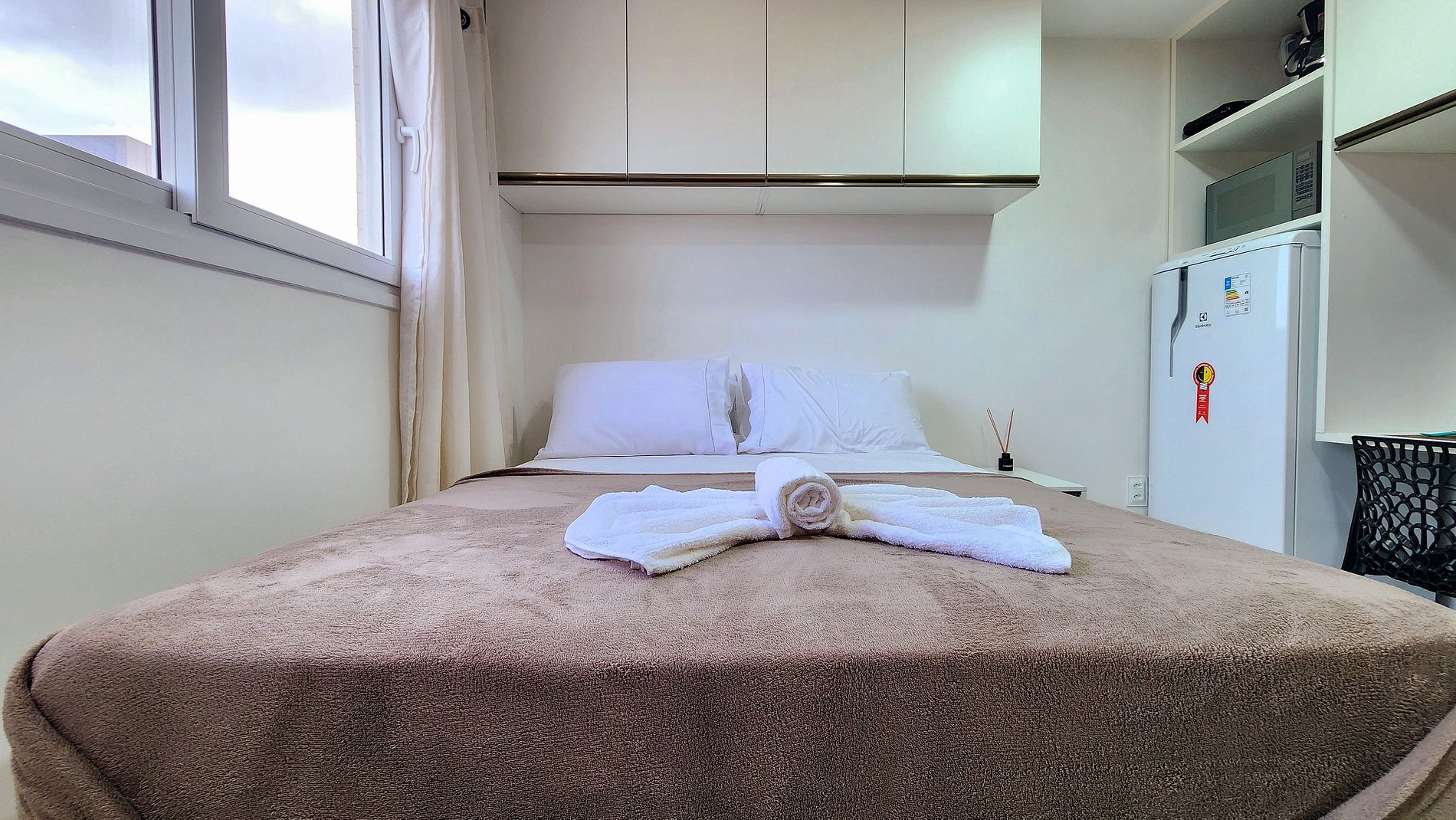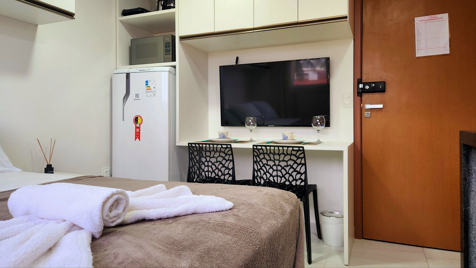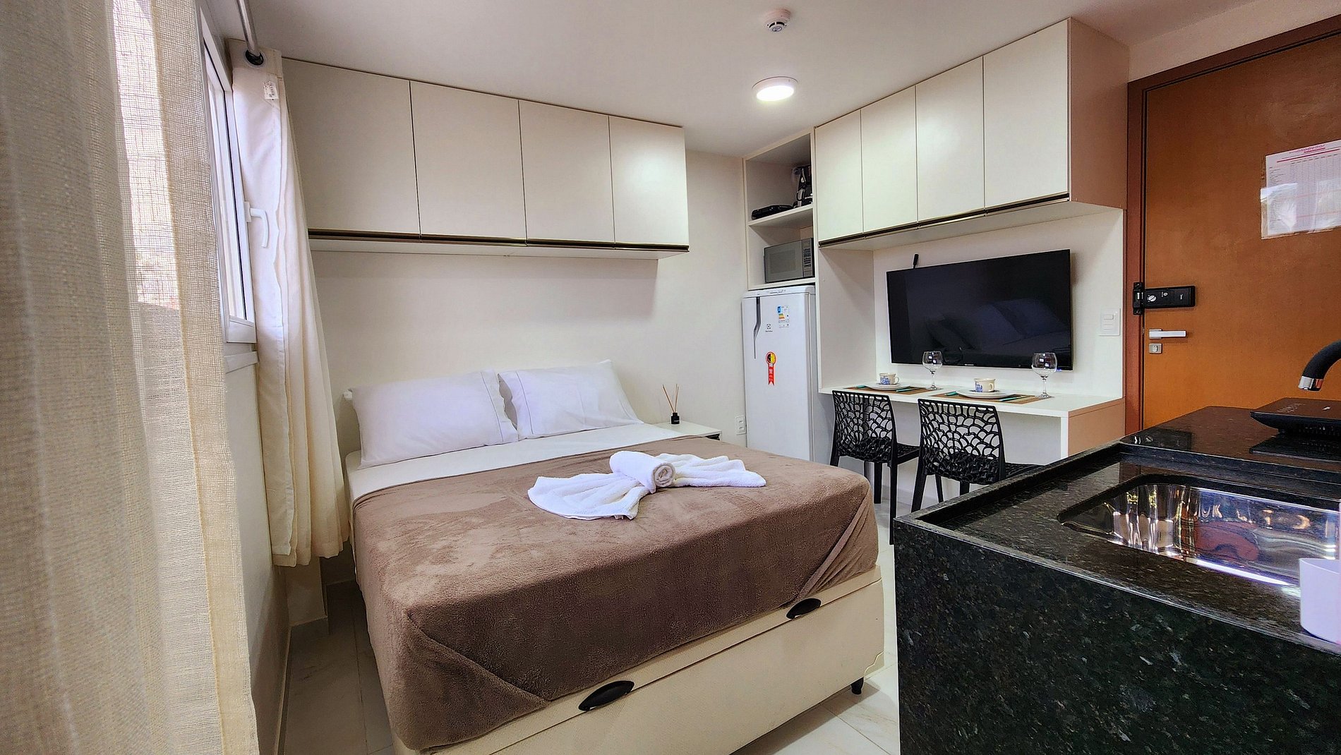 Acomodação: O quarto dispõe de uma confortável cama de casal, ar condicionado para noites tranquilas, TV para seu entretenimento, e uma mesa para refeições ou trabalho. A cozinha é totalmente equipada com mini fogão de 1 boca, geladeira, liquidificador, sanduicheira, air fryer e microondas, além de pratos, xícaras e talheres, permitindo que você prepare suas refeições com facilidade.