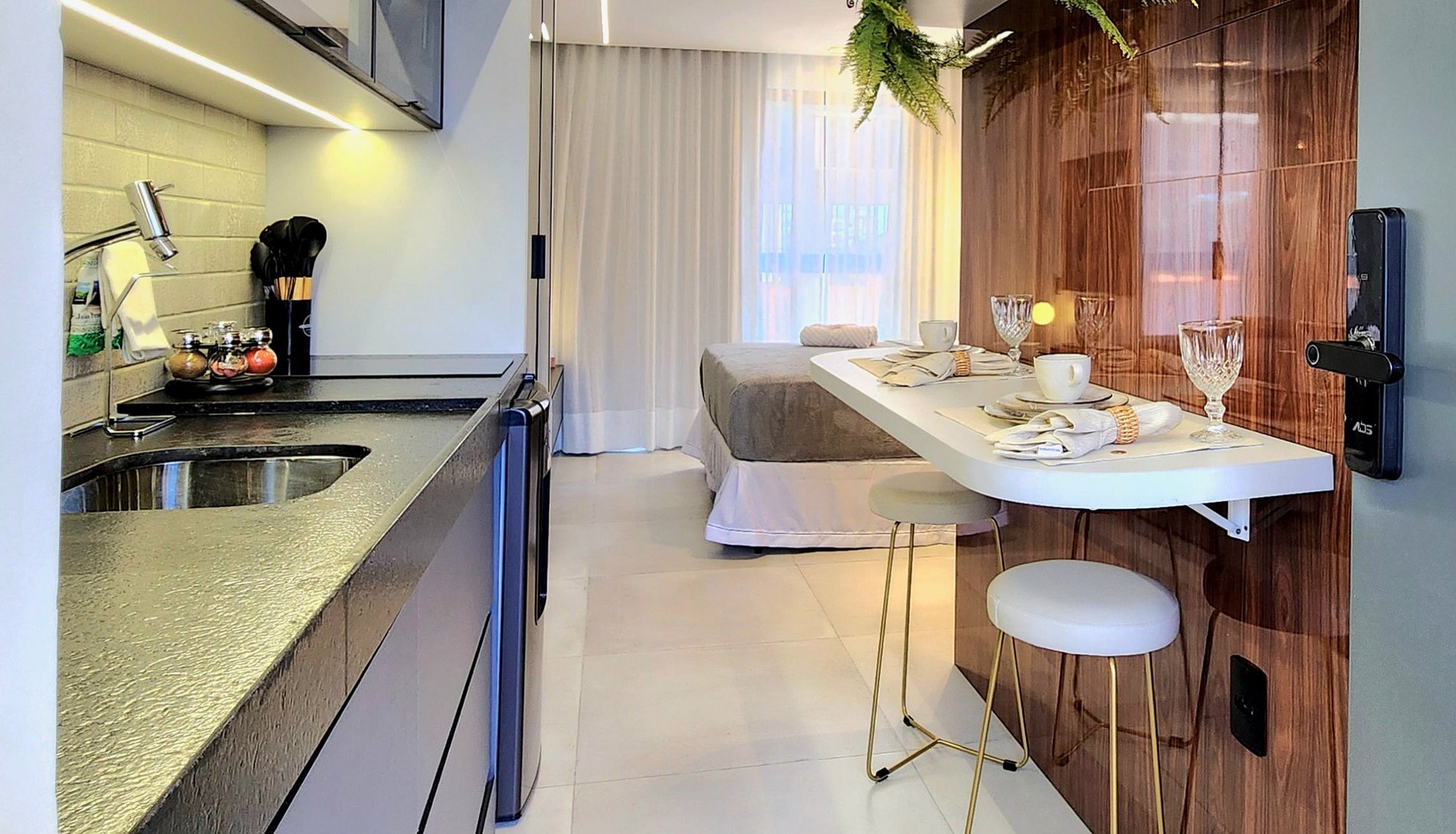 O espaço é projetado com uma decoração refinada e funcional, ideal para até duas pessoas. Equipado com uma confortável cama de casal, ar condicionado, um banheiro impecavelmente limpo, e uma cozinha compacta que inclui fogão de indução de 2 bocas, purificador de água, liquidificador, sanduicheira e cafeteira. Tudo que você precisa para preparar uma refeição rápida ou começar o dia com um café fresco está ao seu alcance.