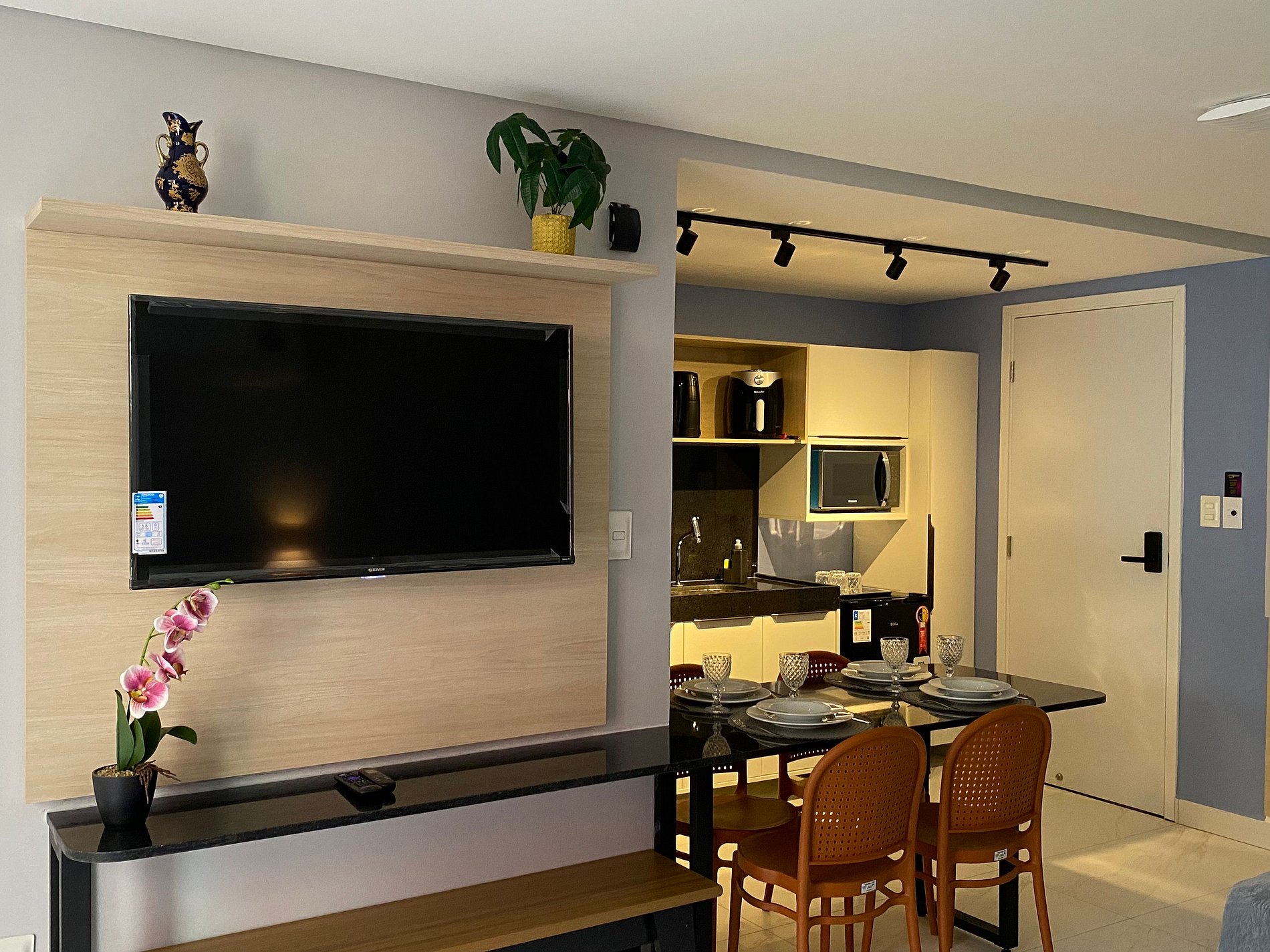 Cozinha Completa: Prepare suas refeições favoritas com facilidade. O flat está equipado com frigobar, fogão de 1 boca, cafeteira normal e de expresso, air fryer, microondas, pratos e utensílios.
