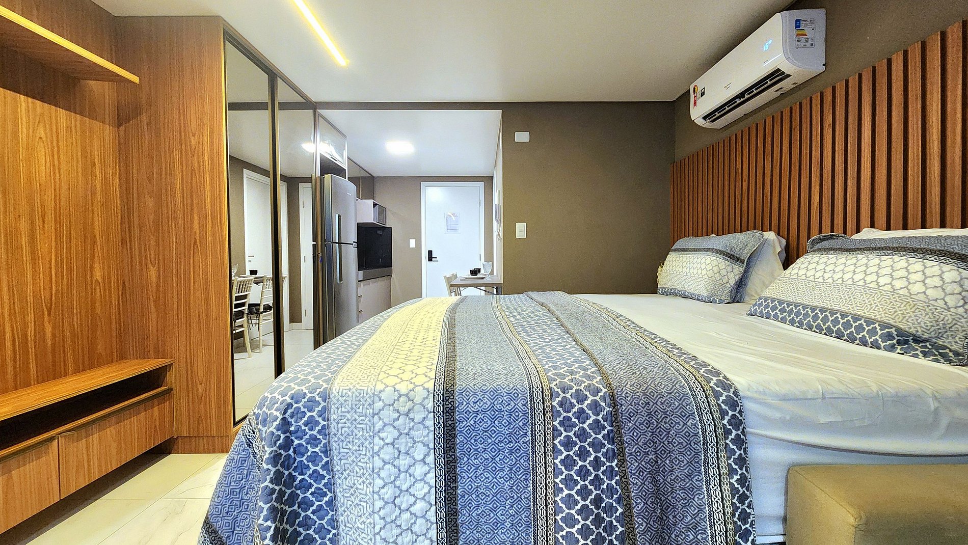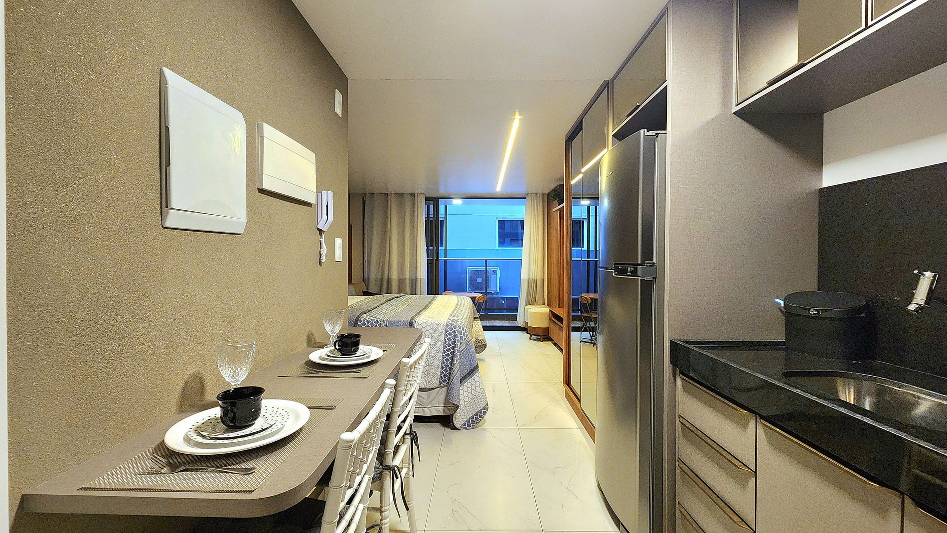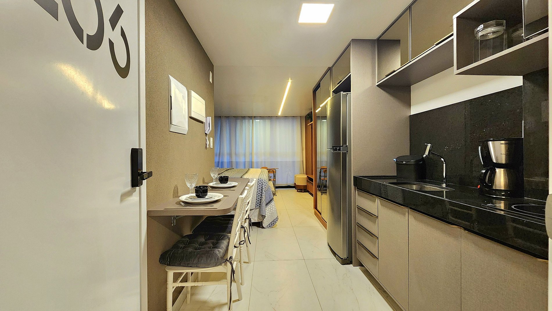 A unidade vem totalmente equipada com uma geladeira, fogão de indução, microondas, sanduicheira e cafeteira, além de um jogo completo de panelas, pratos e talheres. Tudo para que você se sinta em casa e tenha a conveniência de preparar suas refeições.