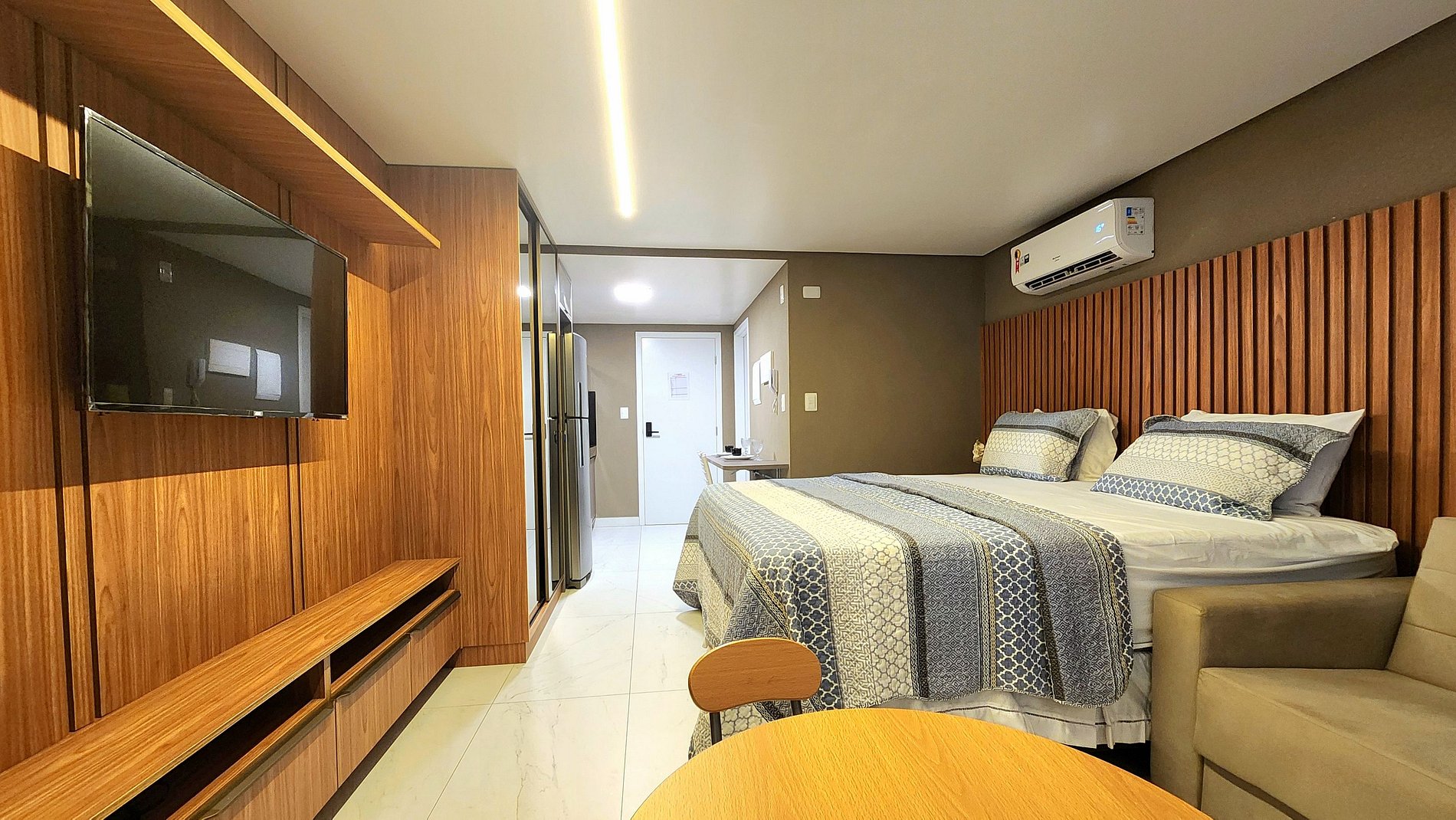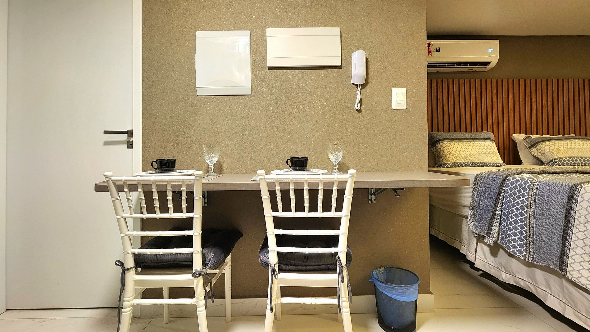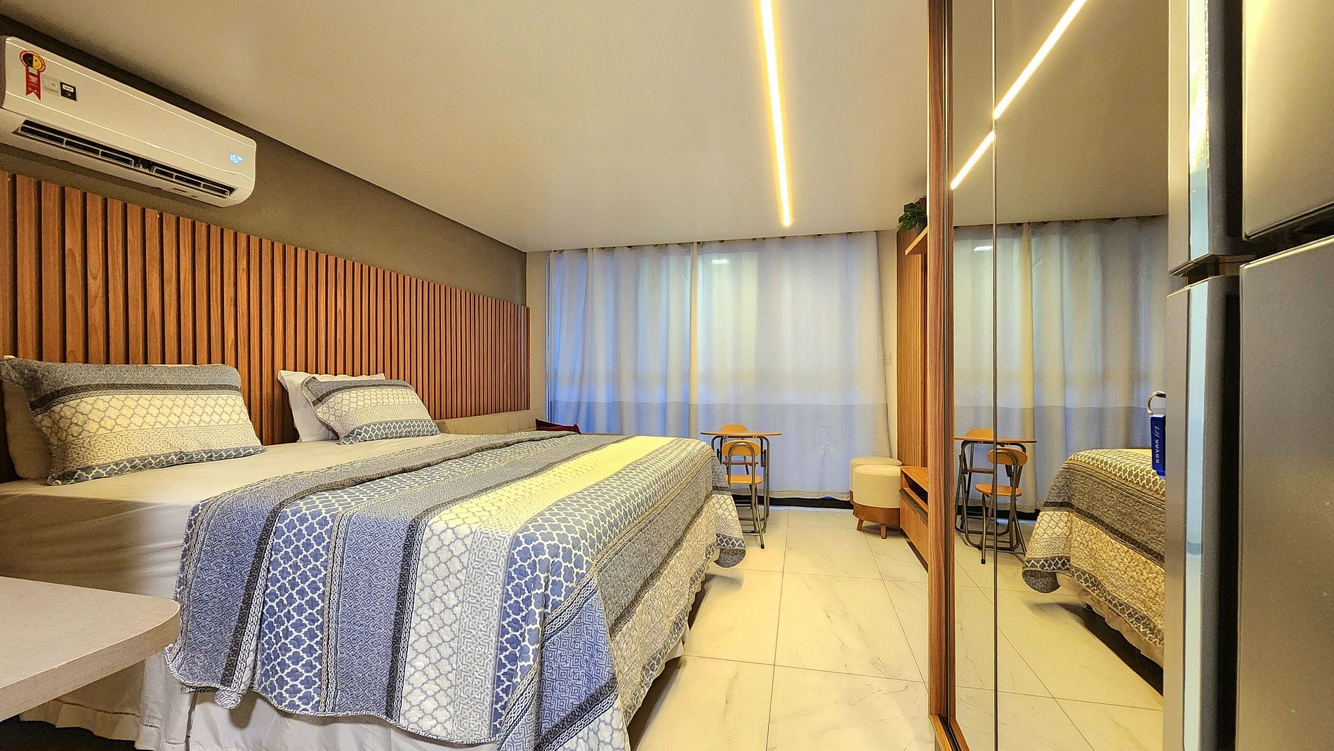 A unidade vem totalmente equipada com uma geladeira, fogão de indução, microondas, sanduicheira e cafeteira, além de um jogo completo de panelas, pratos e talheres. Tudo para que você se sinta em casa e tenha a conveniência de preparar suas refeições.