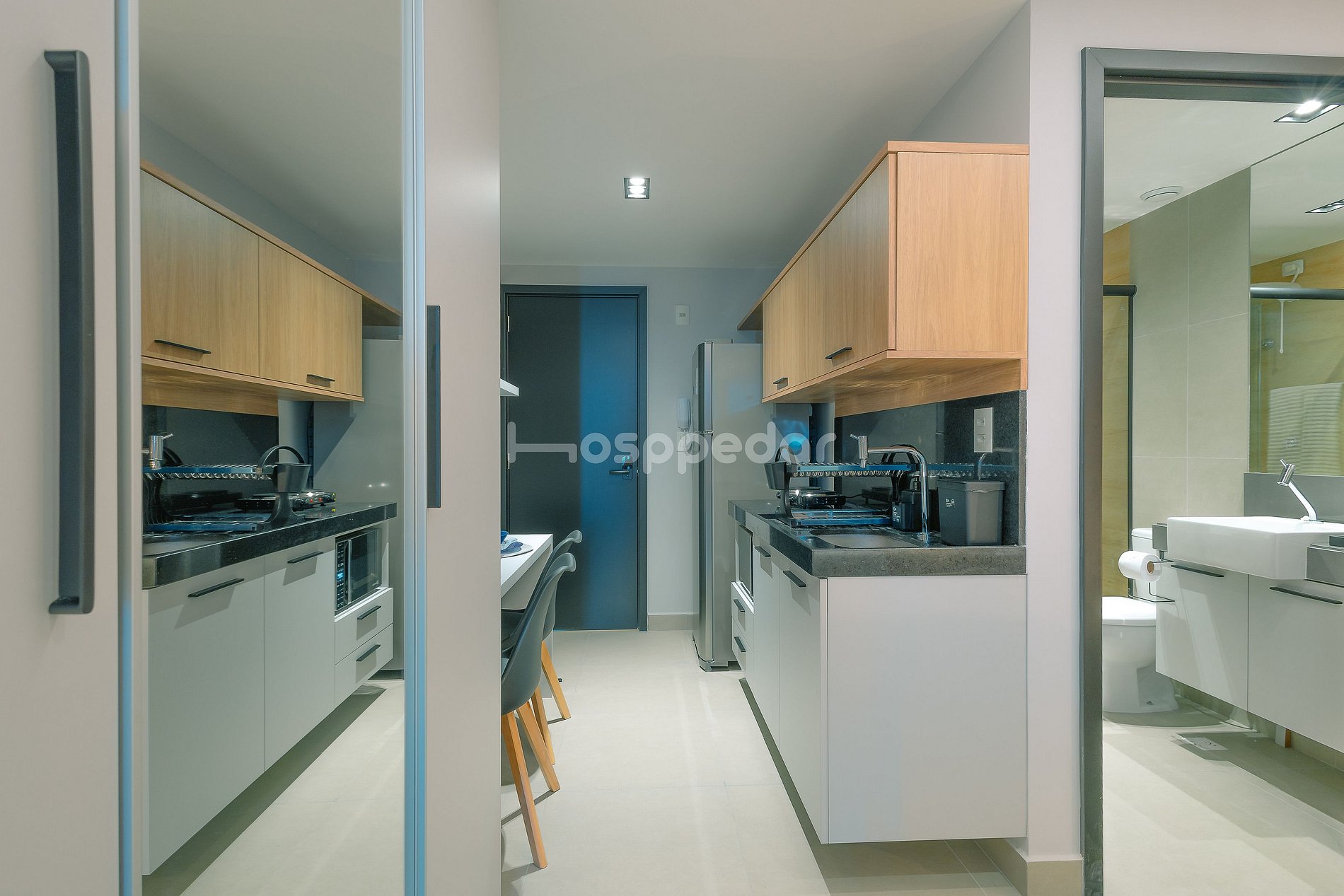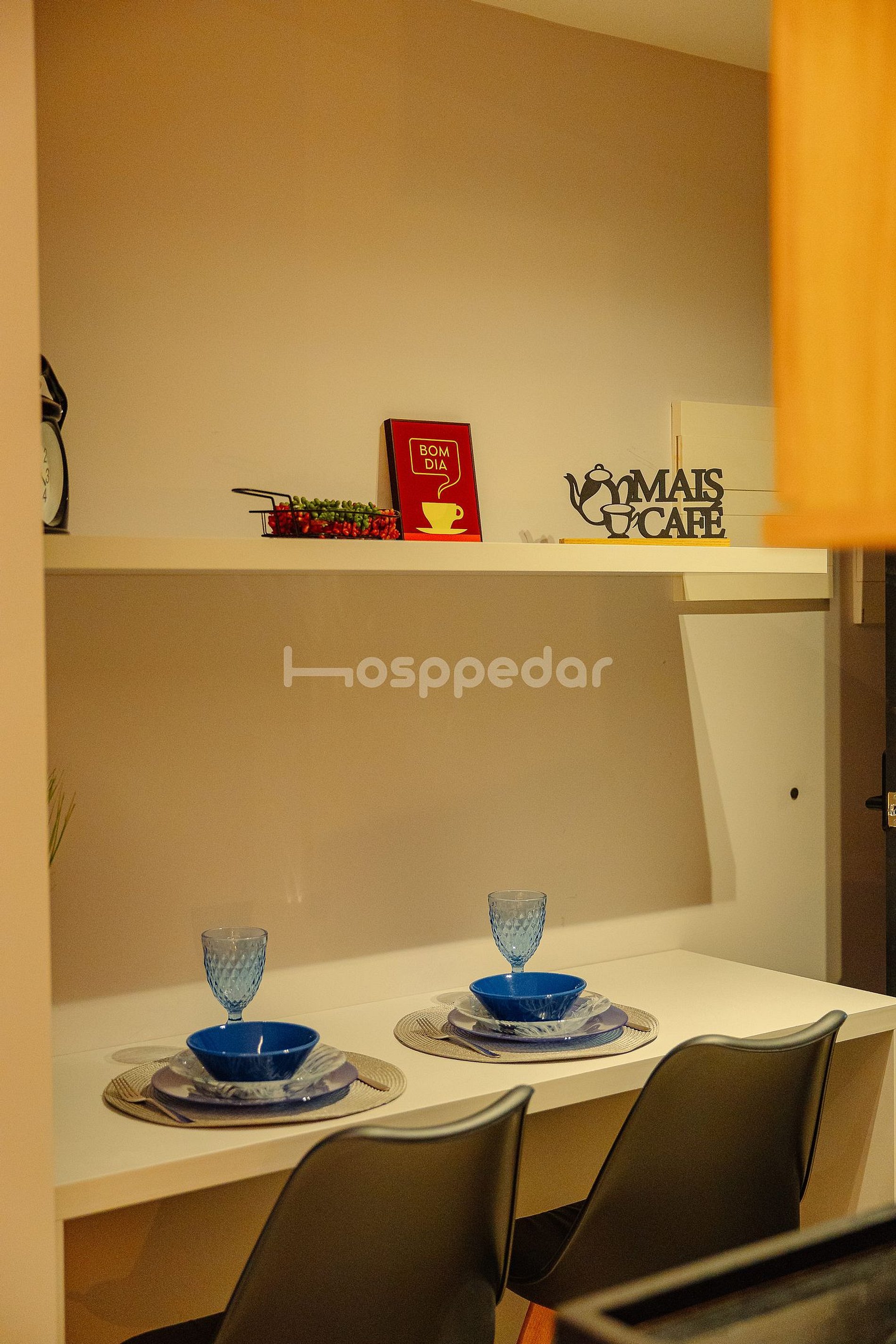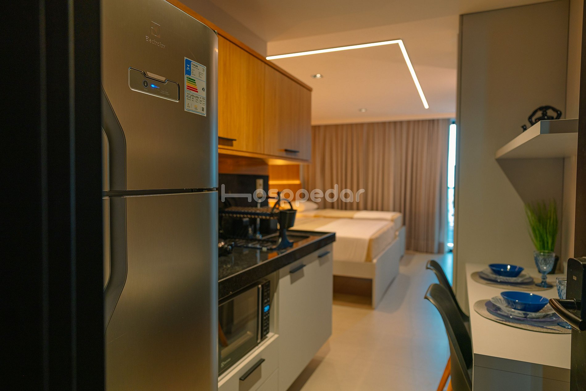 A mini cozinha está totalmente equipada com geladeira, microondas, cafeteira, sanduicheira, liquidificador, pratos, copos e utensílios, permitindo que você prepare refeições rápidas e aproveite ainda mais sua estadia.