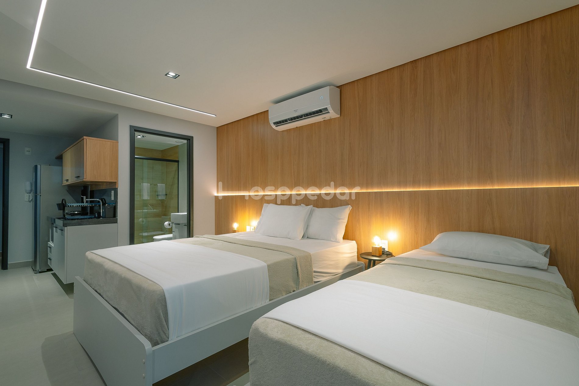 Este studio encantador, com capacidade para até 3 pessoas, oferece uma experiência de hospedagem única. Com uma cama de casal e uma cama de solteiro, o espaço foi cuidadosamente decorado com um estilo moderno e mobília de primeira linha, garantindo o máximo de conforto e praticidade para sua estadia.