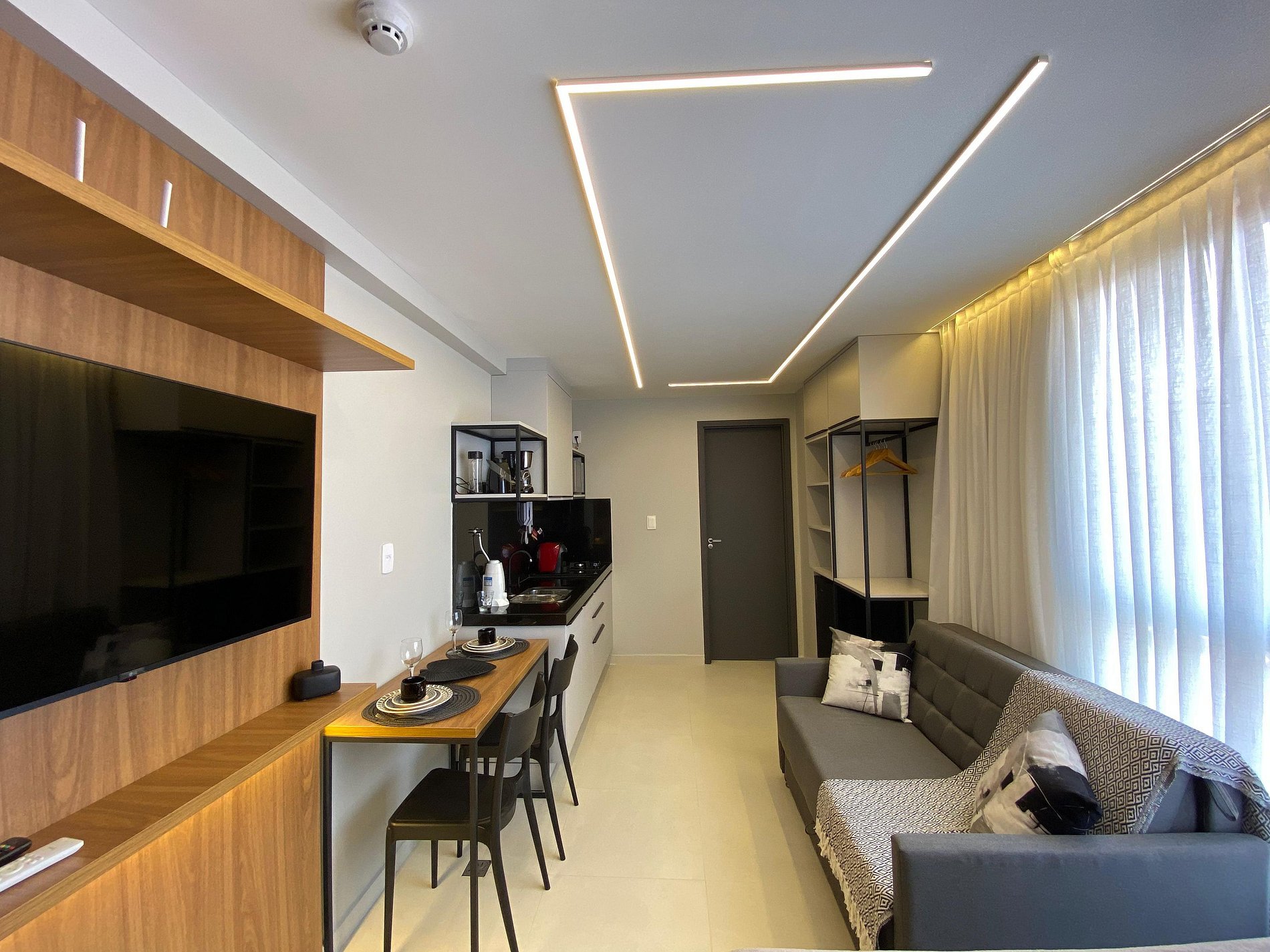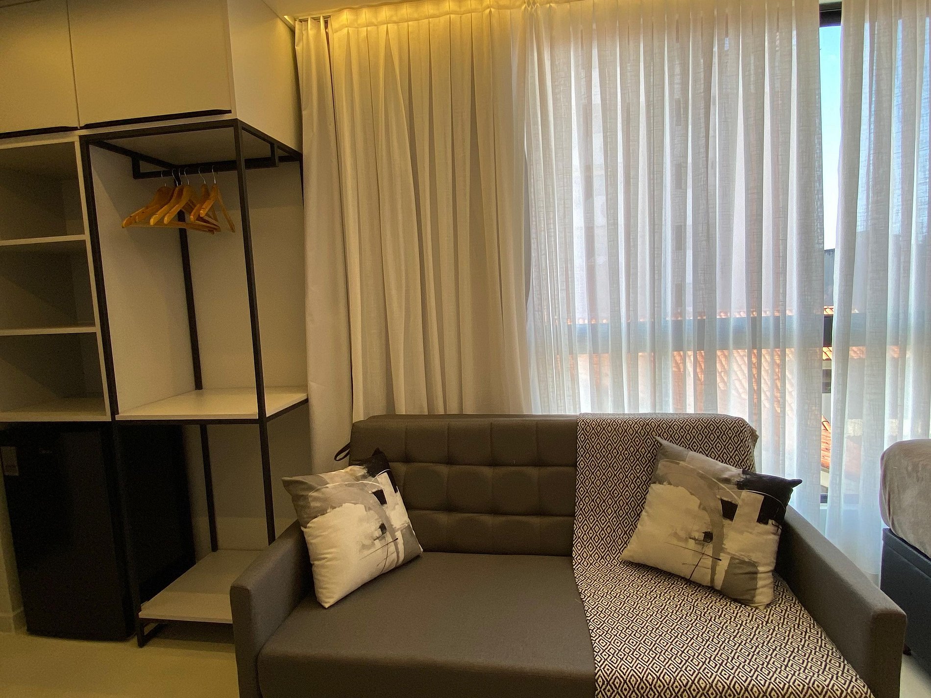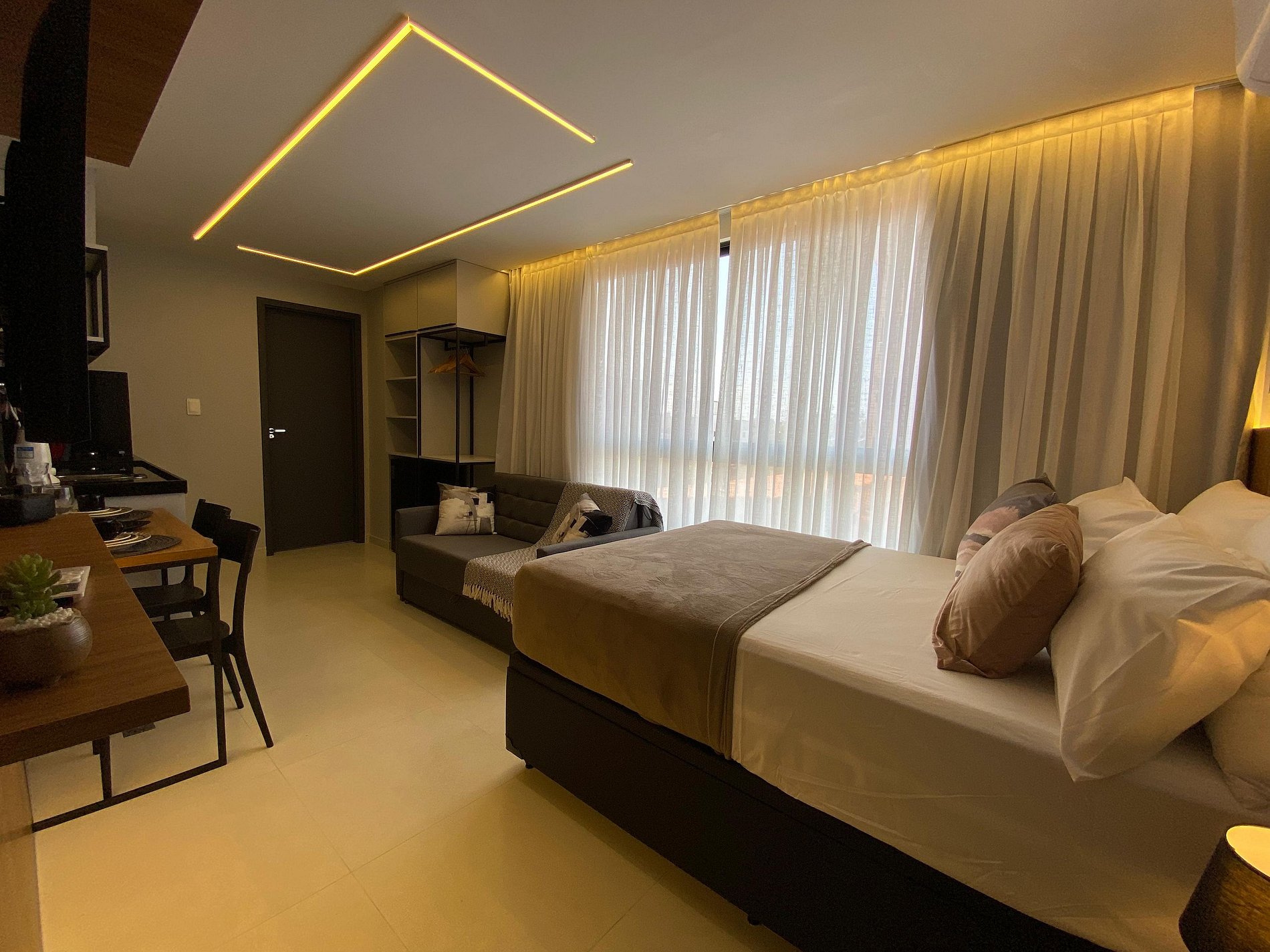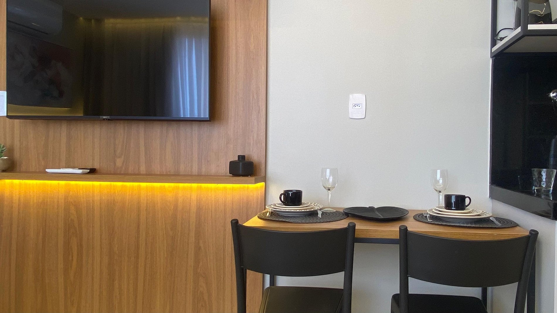 O studio conta com Wi-Fi, roupas de cama e banho fornecidas pela gestão profissional da Hosppedar, além de uma cozinha equipada com frigobar, fogão, microondas, liquidificador, cafeteira, sanduicheira, purificador de água e todos os utensílios necessários para você se sentir em casa.
