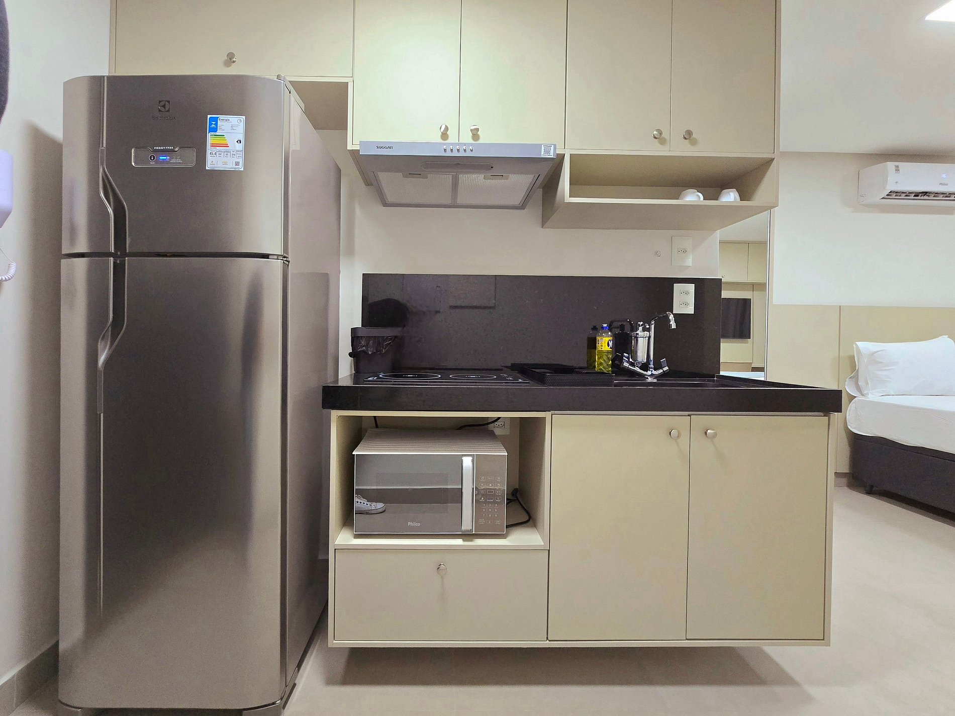 - Cozinha equipada com geladeira, microondas, fogão por indução, panelas, pratos, copos e talheres, liquidificador.