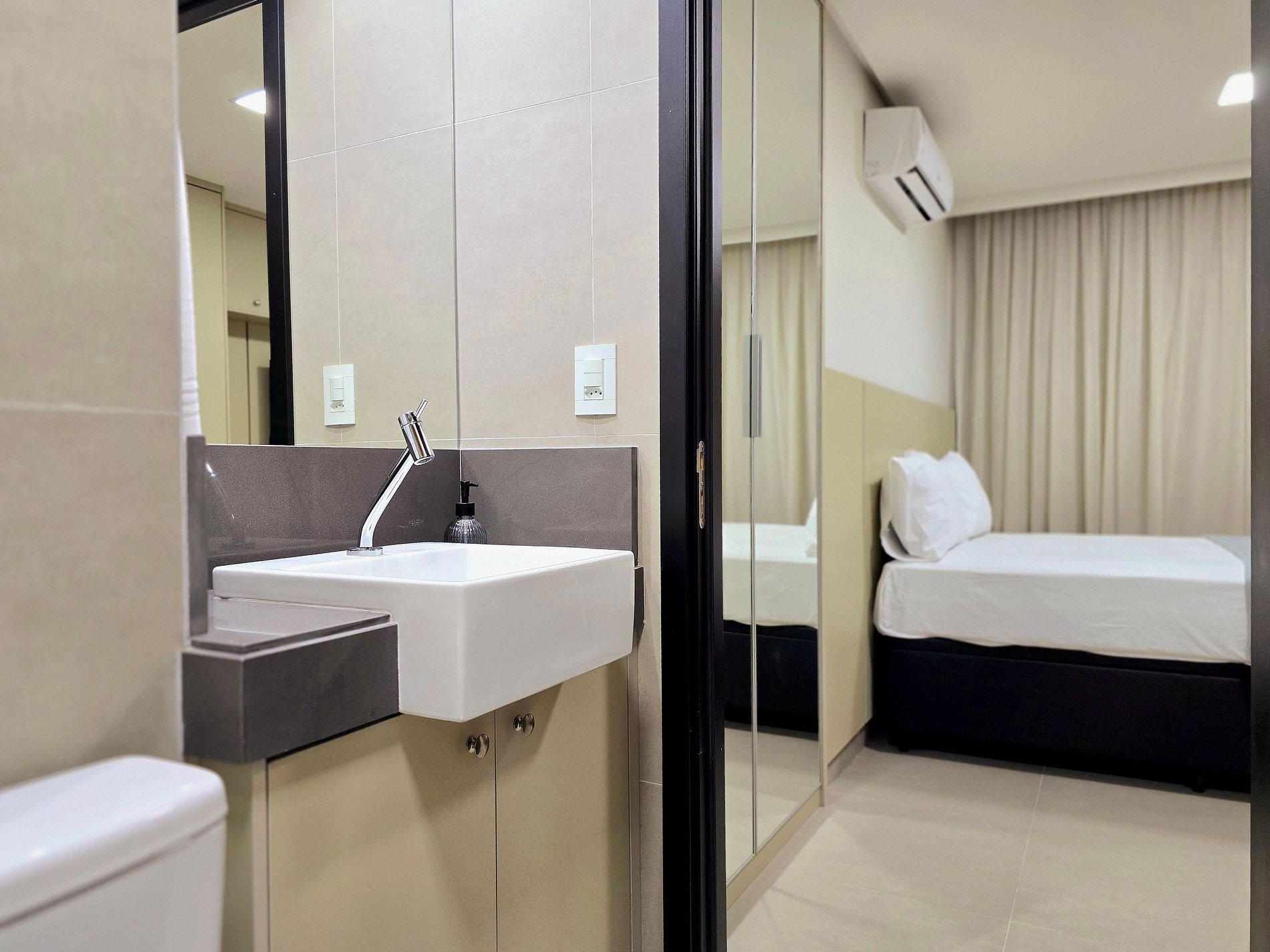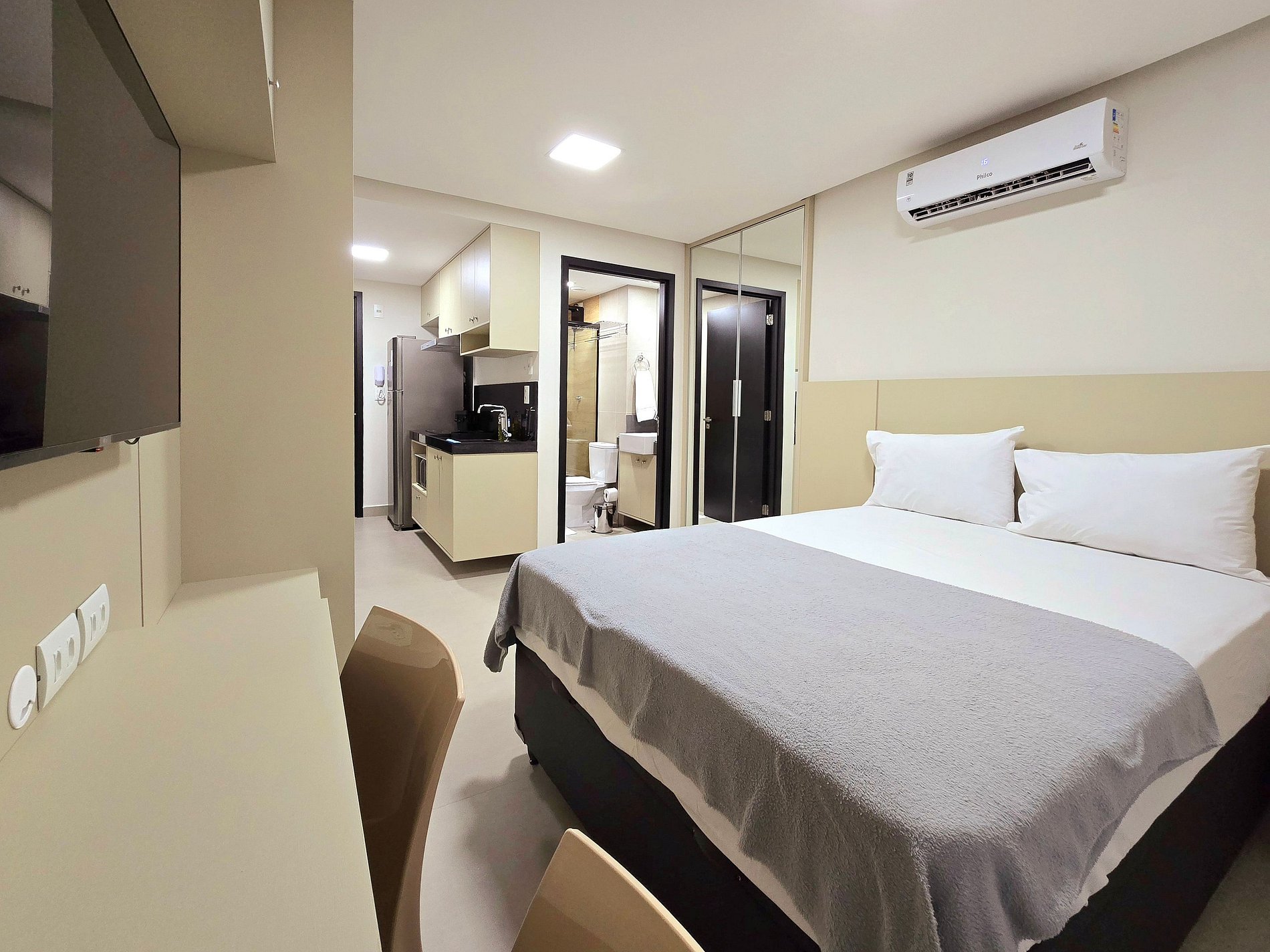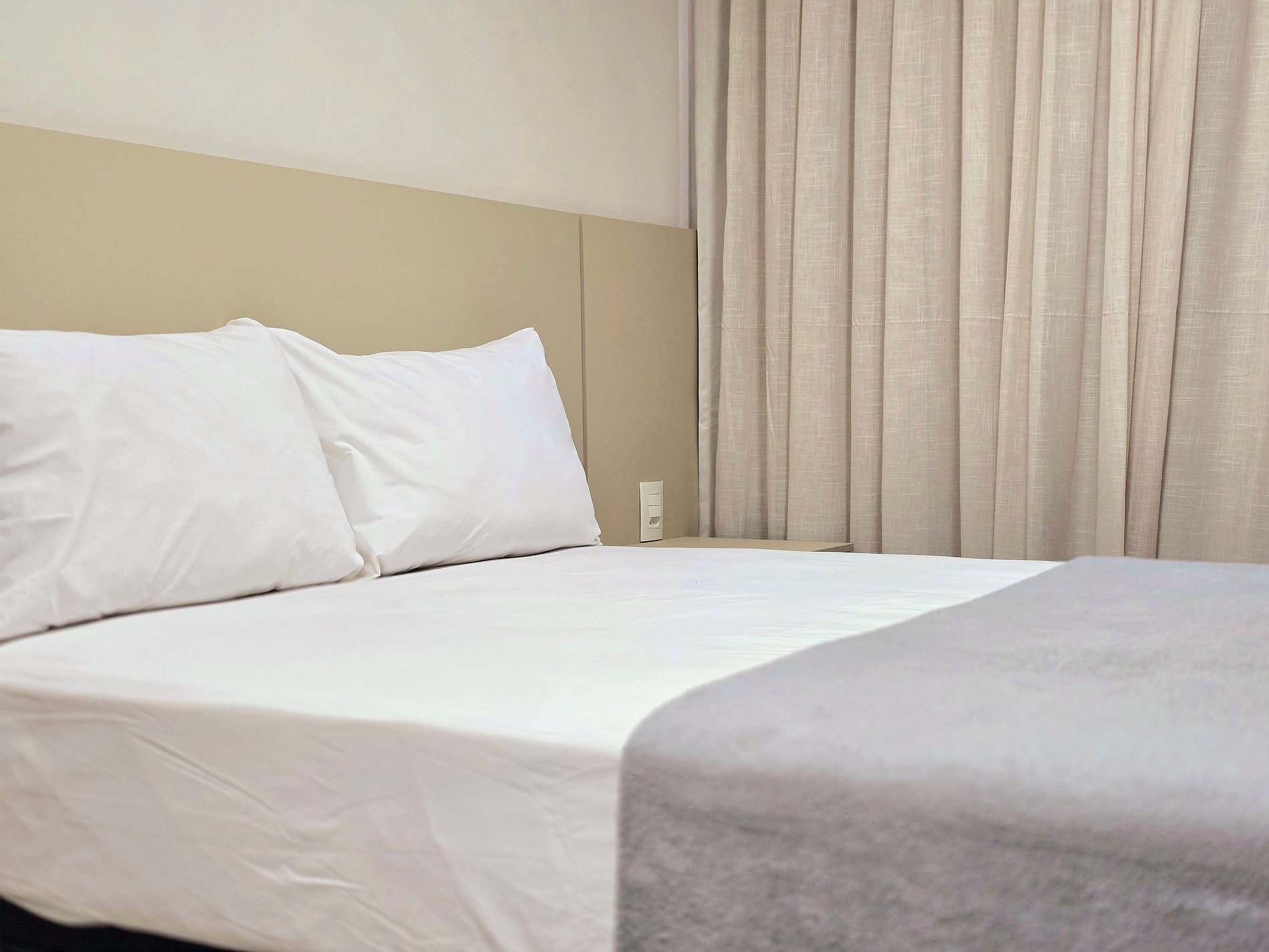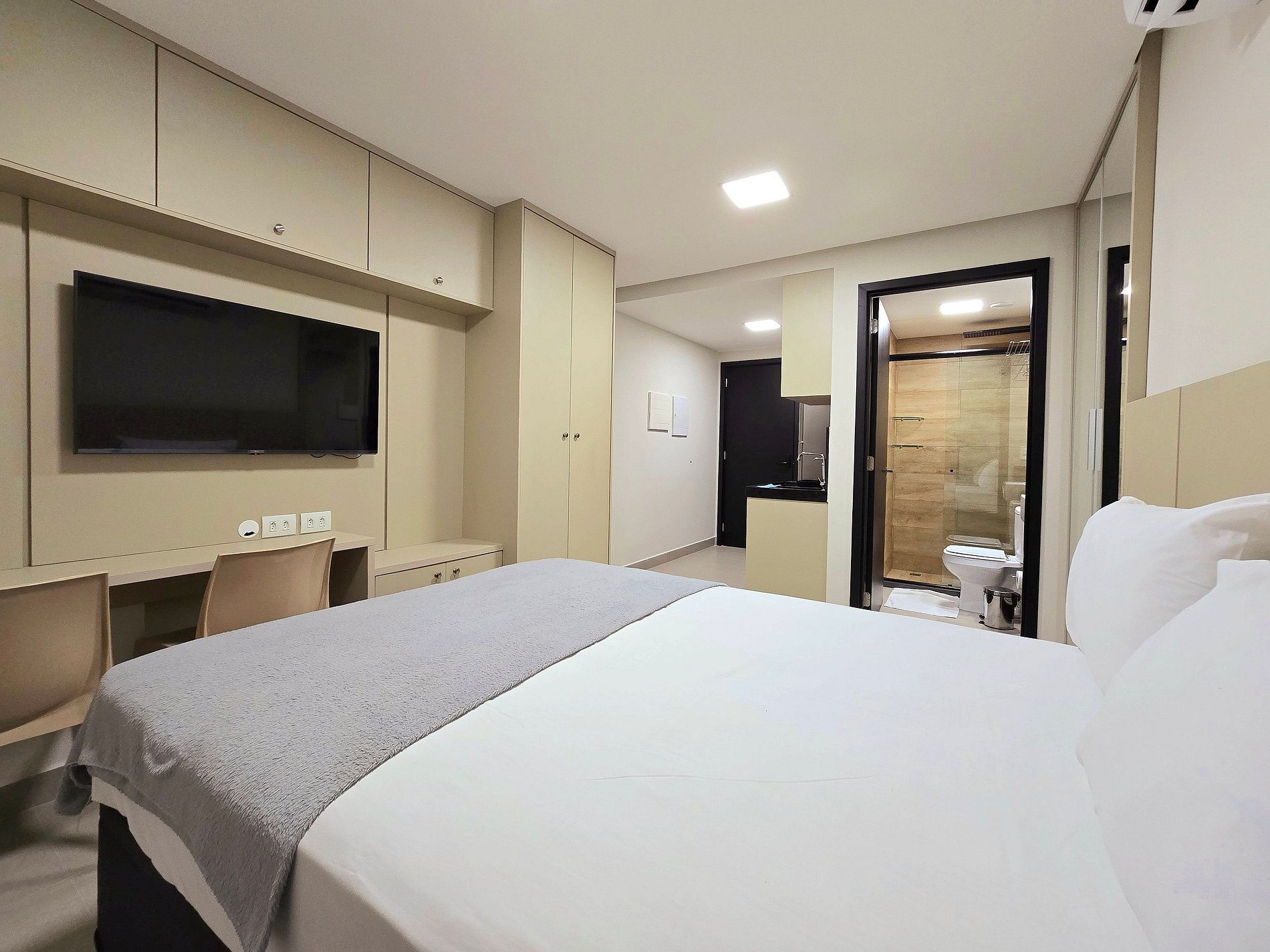 - Cortinas blackout e armários espaçosos, ideais para estadias mais longas.