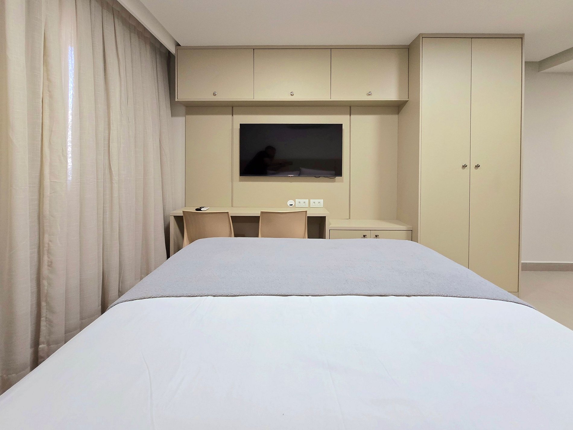 - Cortinas blackout e armários espaçosos, ideais para estadias mais longas.