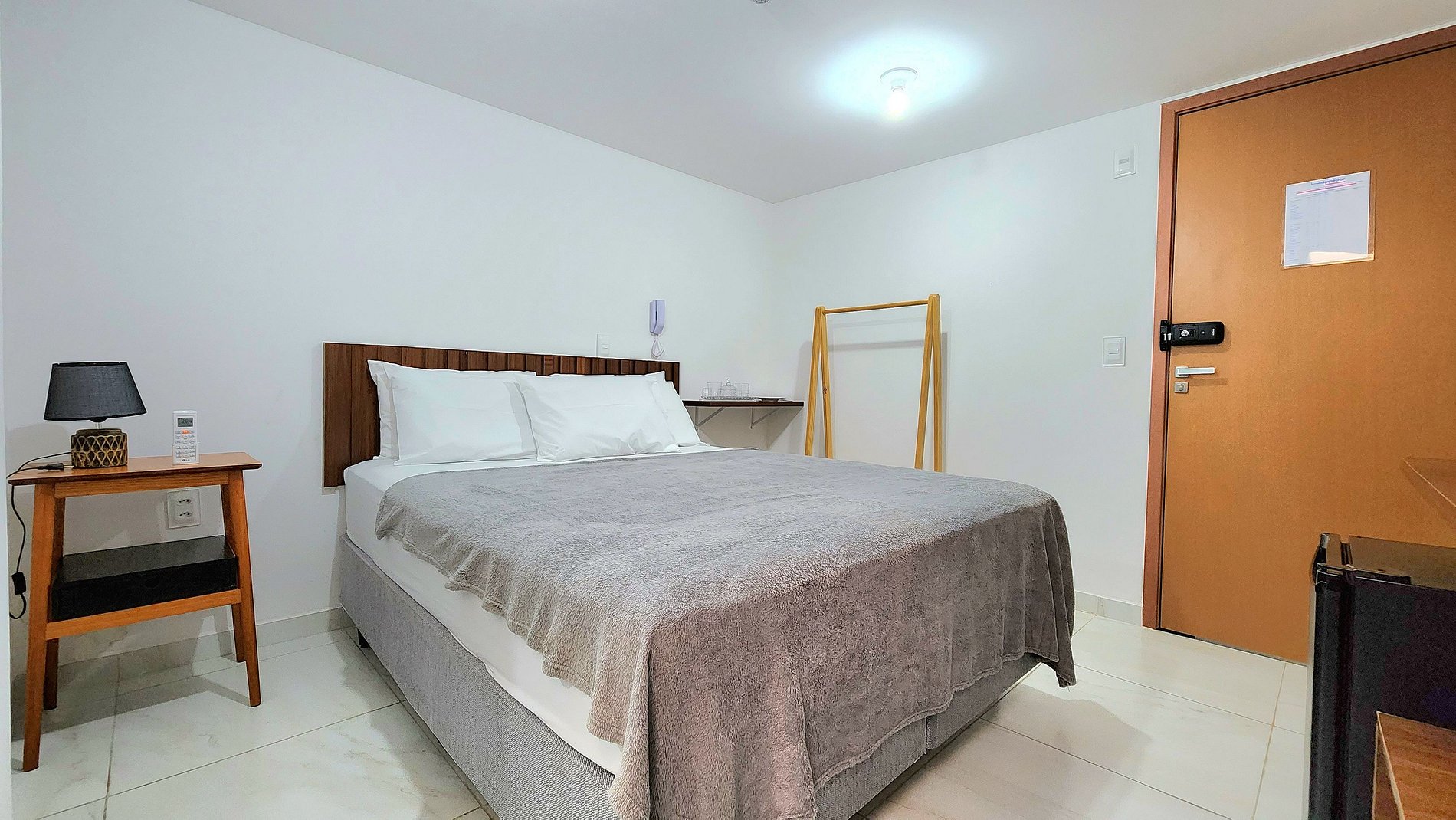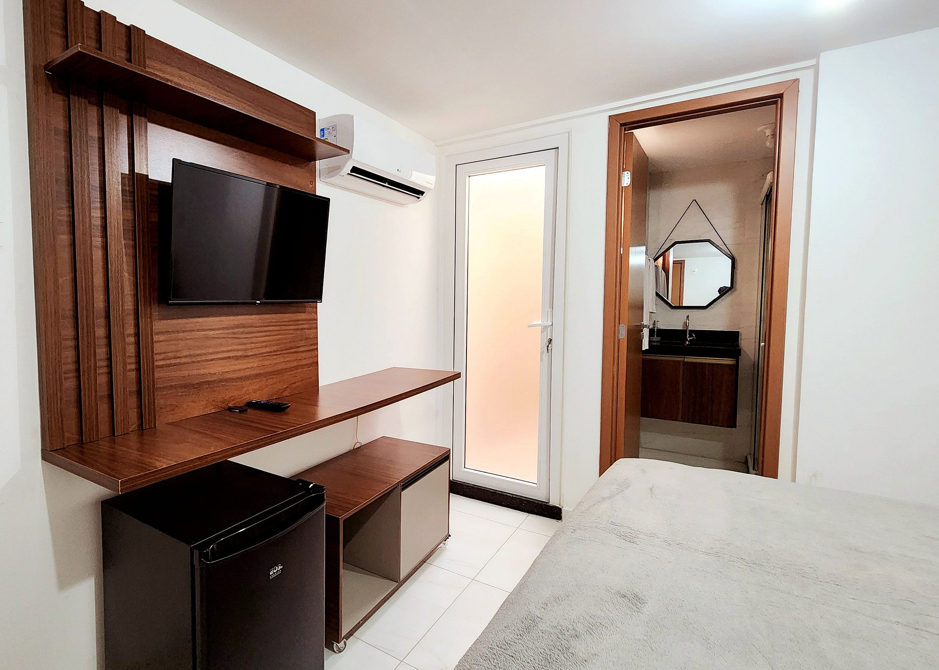 O flat é equipado com comodidades modernas para garantir o seu conforto. Possui ar condicionado para manter a temperatura ideal em qualquer estação do ano. Além disso, uma TV está disponível para você aproveitar os canais locais durante o seu tempo de descanso. Se você precisar armazenar algumas bebidas ou alimentos, um frigobar está à sua disposição.