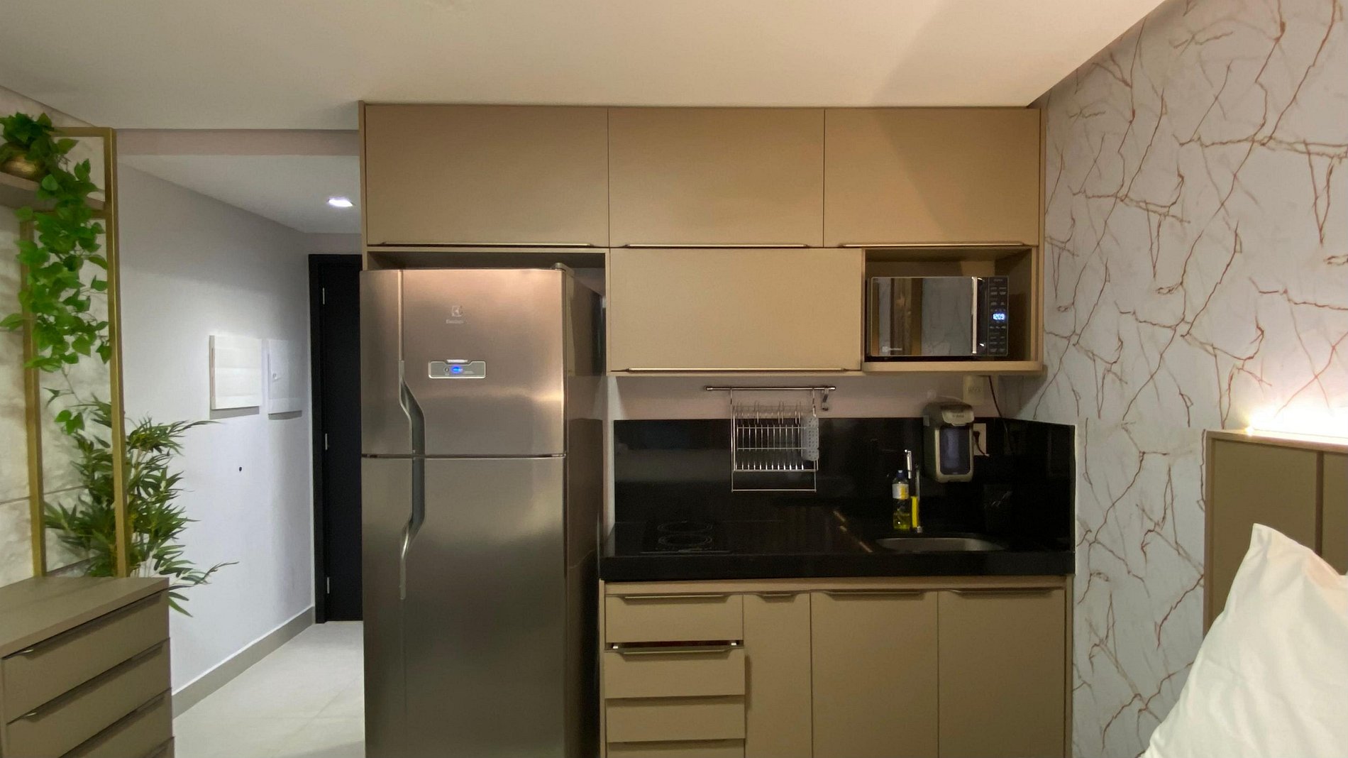A cozinha bem equipada inclui geladeira, microondas, air fryer, cafeteira, sanduicheira e liquidificador, além de copos, pratos e talheres. Tudo isso em um ambiente com design moderno e decoração impecável. Perfeito para quem quer se sentir em casa durante a estadia!