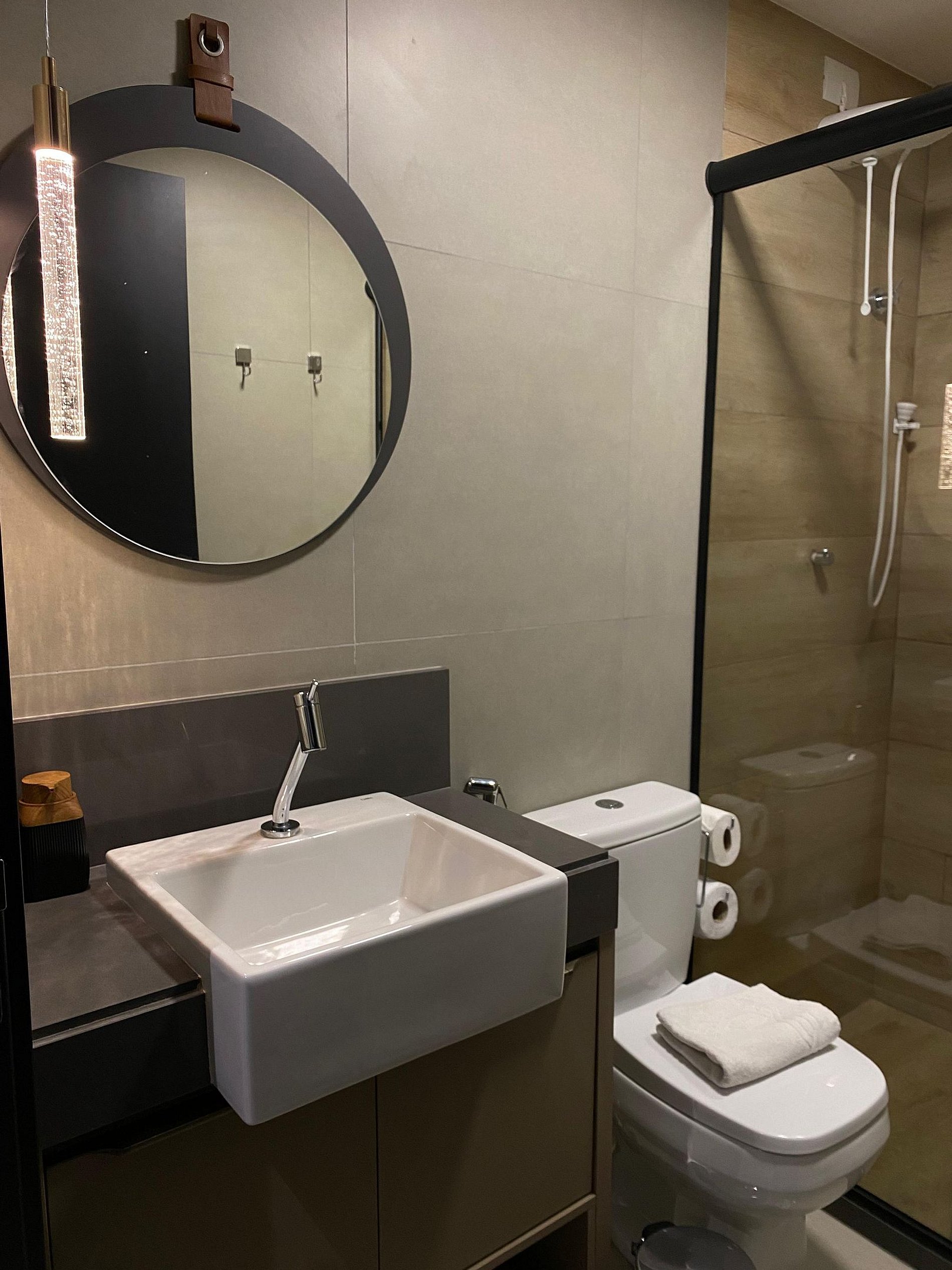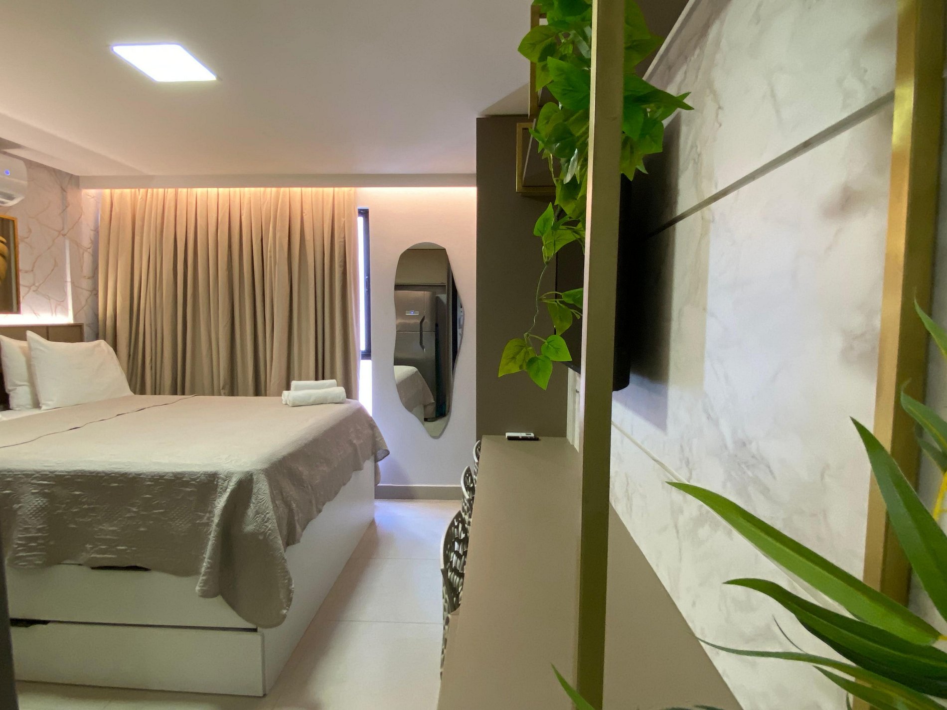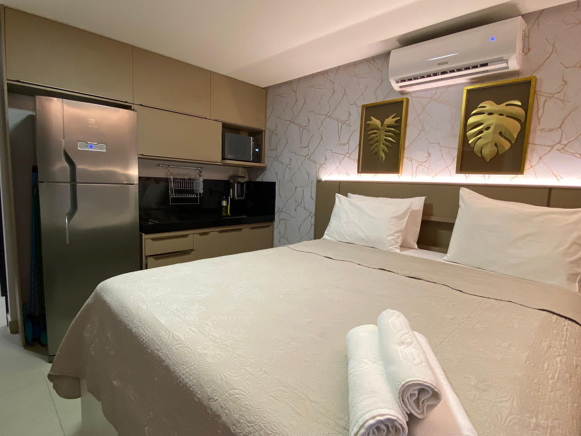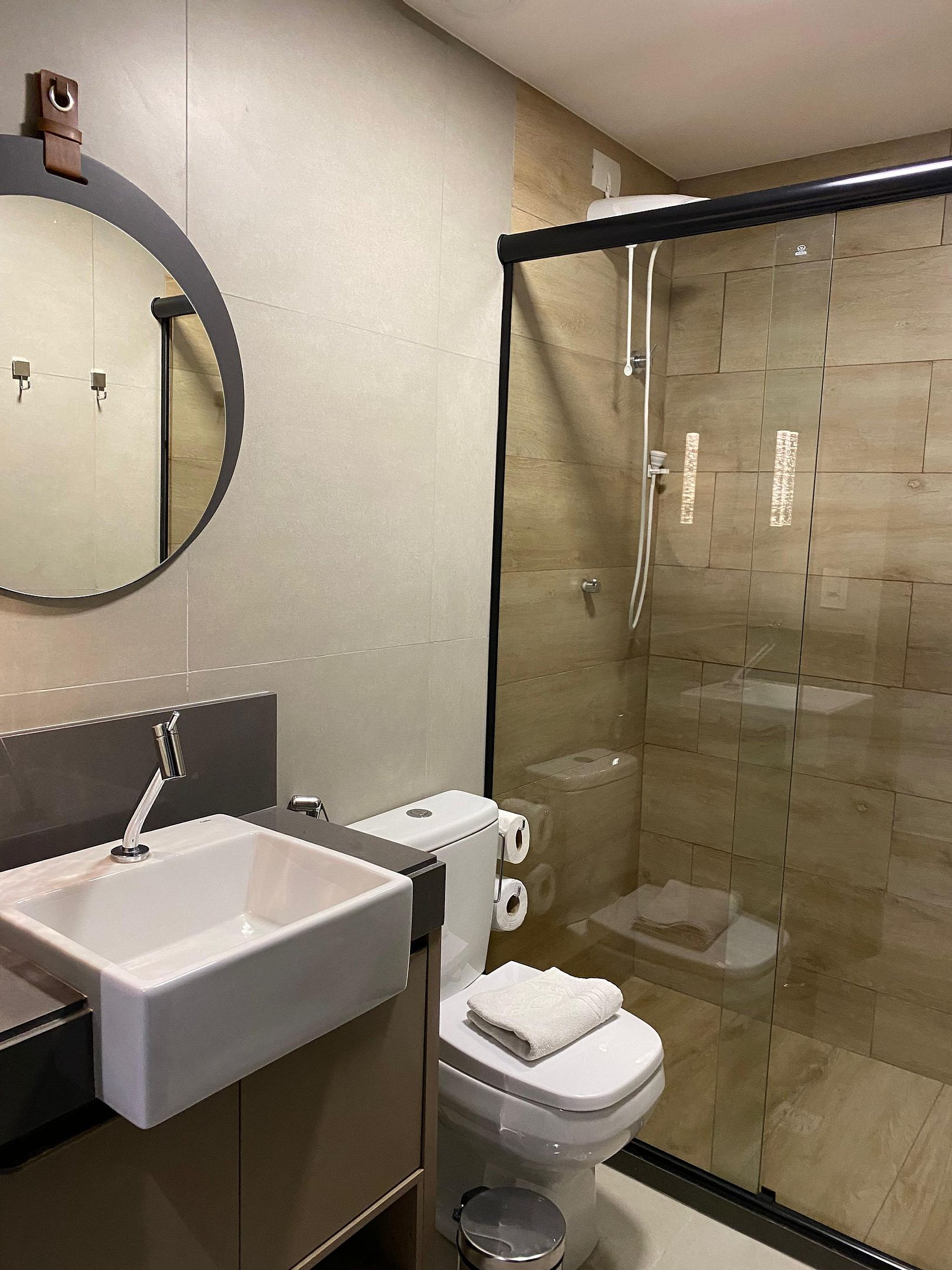 Com uma cama casal e uma cama auxiliar tipo bicama, o espaço foi projetado para oferecer noites tranquilas de sono. O ar condicionado garante o conforto nos dias mais quentes, enquanto as cortinas blackout proporcionam privacidade e tranquilidade.