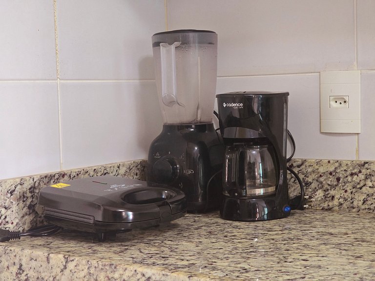 Cozinha Completa: Fogão, forno, coifa, geladeira, micro-ondas, cafeteira, sanduicheira, liquidificador, além de copos, pratos e talheres. O imóvel também conta com secador de cabelo, ferro de passar e varal.