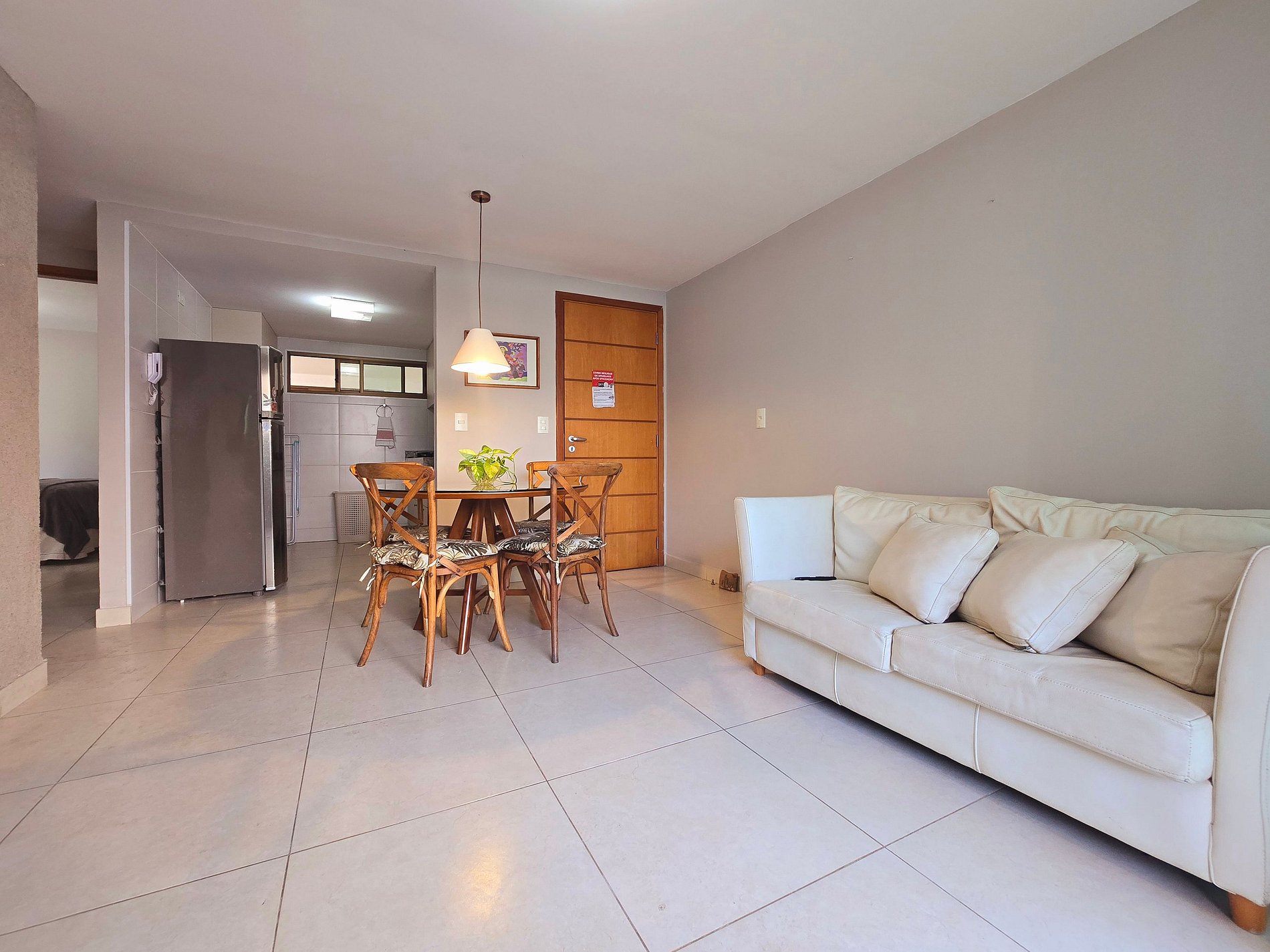 A sala de estar integra-se à sala de jantar e à cozinha, criando um ambiente funcional e convidativo.