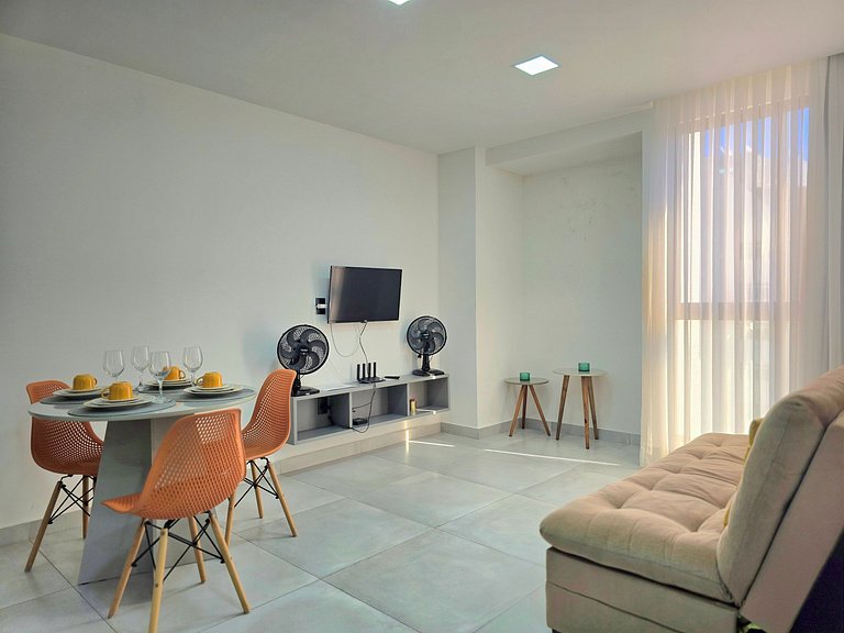 O apartamento acomoda até três pessoas, combinando praticidade e aconchego. No quarto, a cama de casal, o ar-condicionado e a cortina blackout garantem noites de descanso. O armário permite organizar tudo com facilidade. A sala, com sofá-cama e TV, complementa a experiência com funcionalidade e conforto.