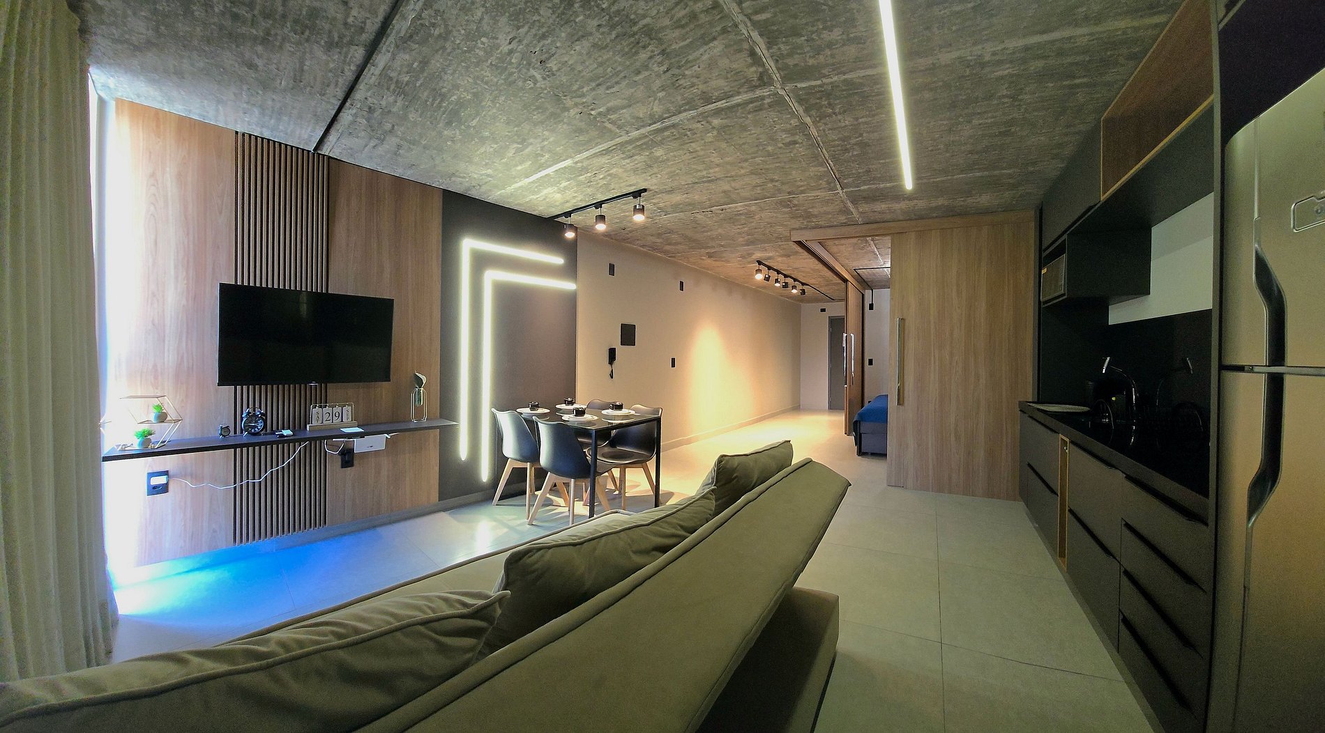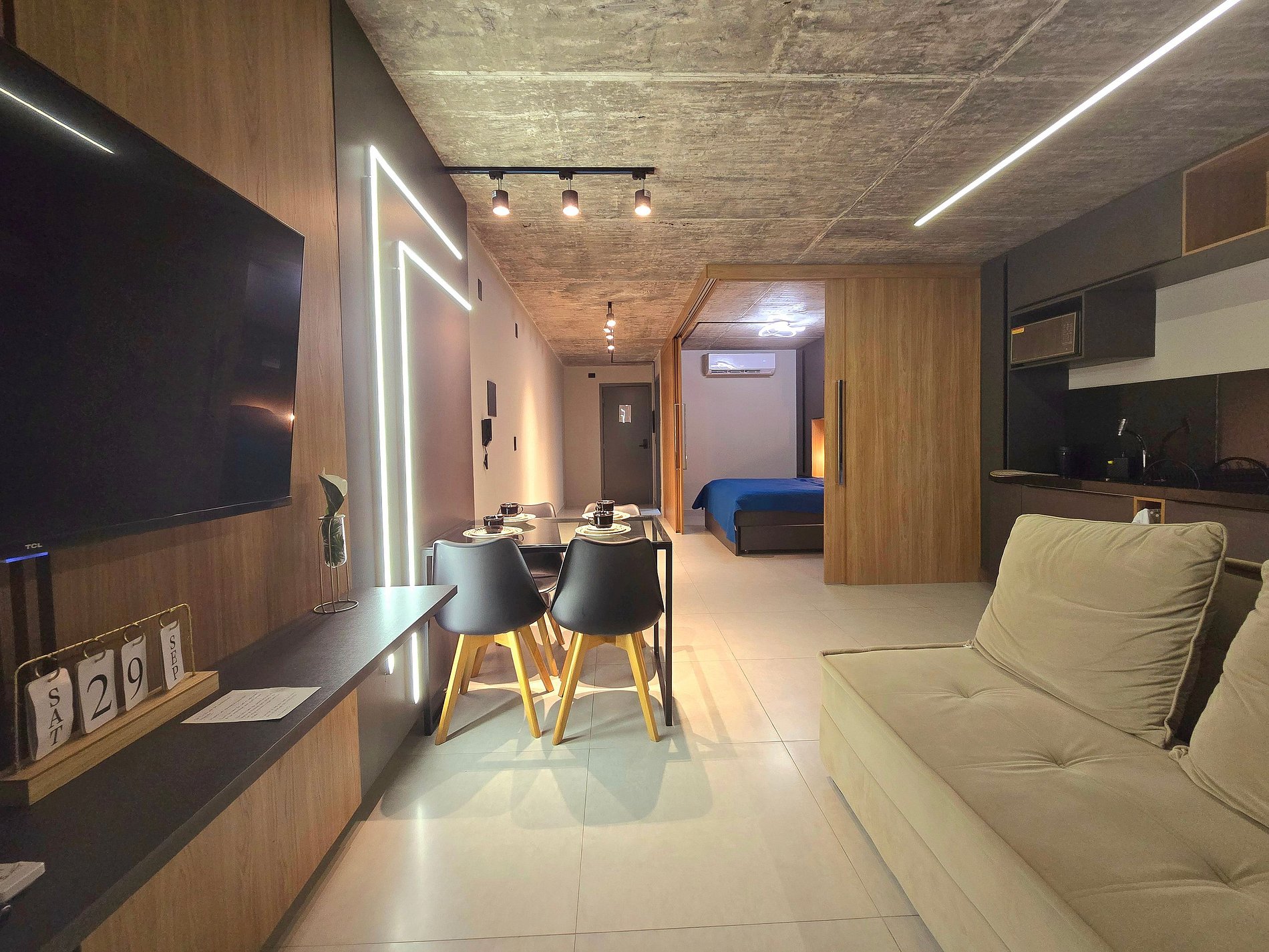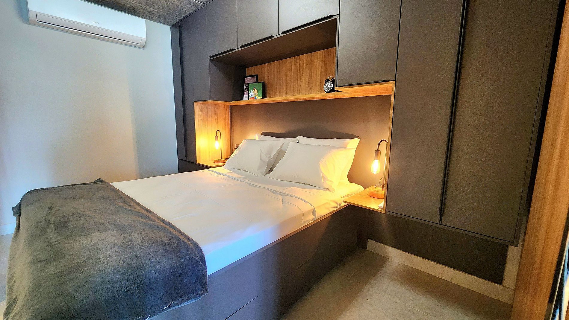 Conforto e Bem-Estar: Relaxe em uma cama queen-size espaçosa, perfeita para noites revigorantes, ou no confortável sofá-cama que garante o bem-estar de todos os 4 hóspedes. As cortinas blackout proporcionam privacidade total e um sono tranquilo a qualquer hora do dia.