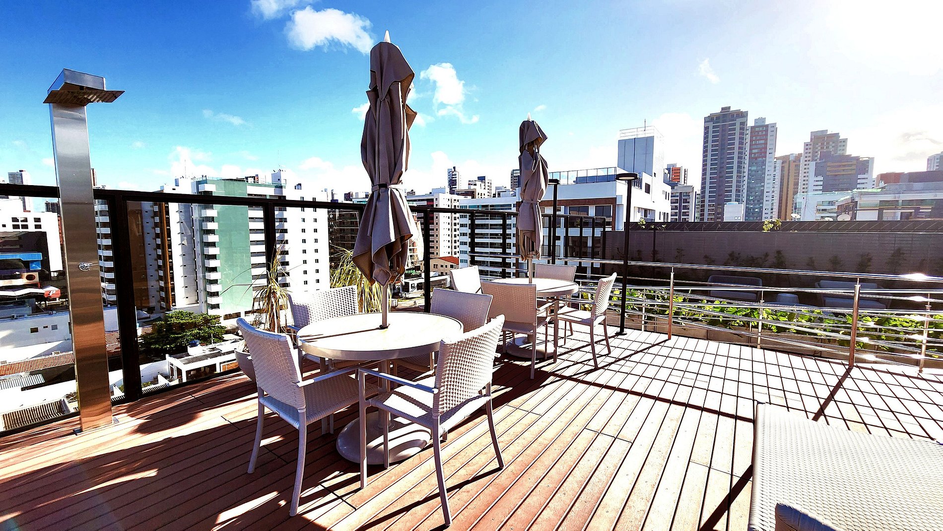 Vista Incrível e Piscina no Rooftop: No topo do prédio, você encontrará uma piscina com uma vista deslumbrante do mar e da cidade, perfeita para relaxar e aproveitar o pôr do sol após um dia de passeios.