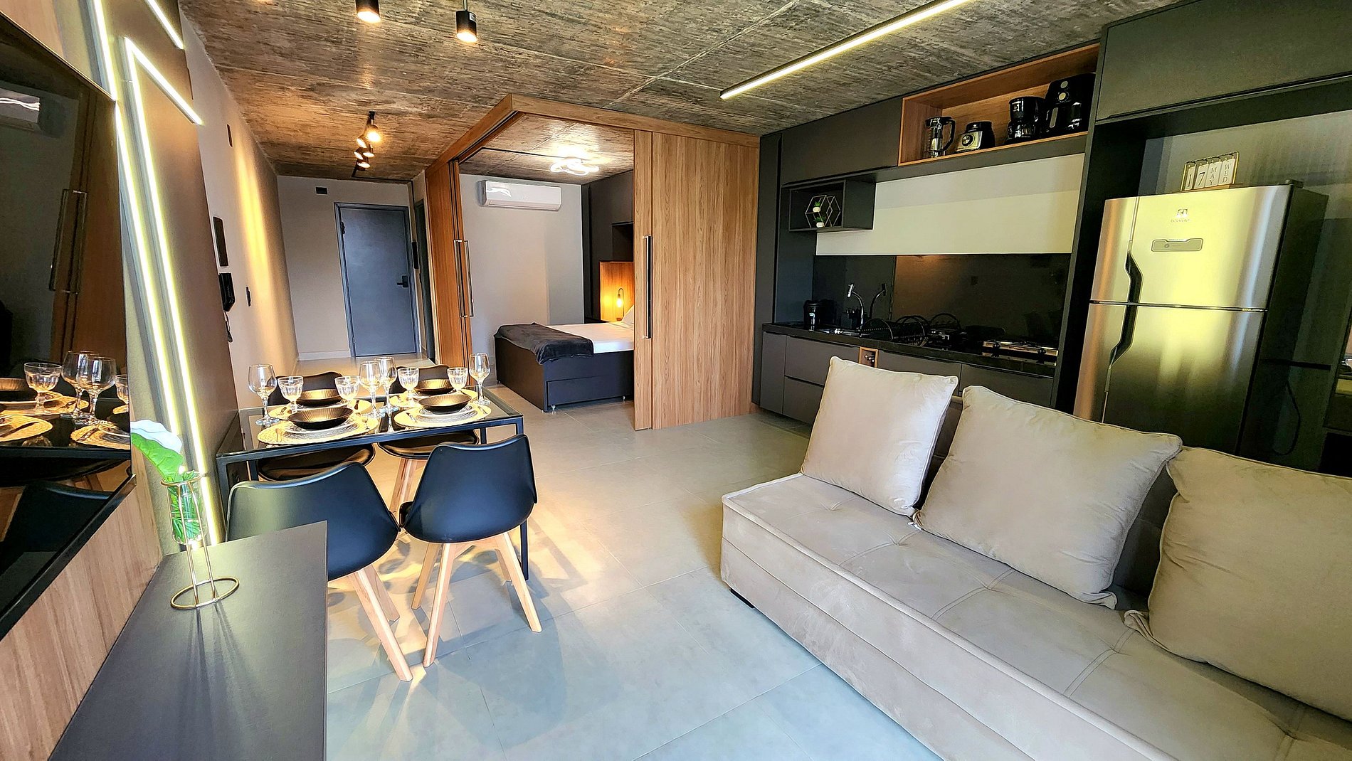 Comodidades Premium: Para garantir que sua estadia seja ainda mais prática e agradável, disponibilizamos uma cozinha completa com fogão, geladeira, micro-ondas, liquidificador e air fryer. Além disso, você poderá apreciar uma boa taça de vinho com nossa adega. Tudo foi pensado para tornar sua estadia o mais confortável possível!