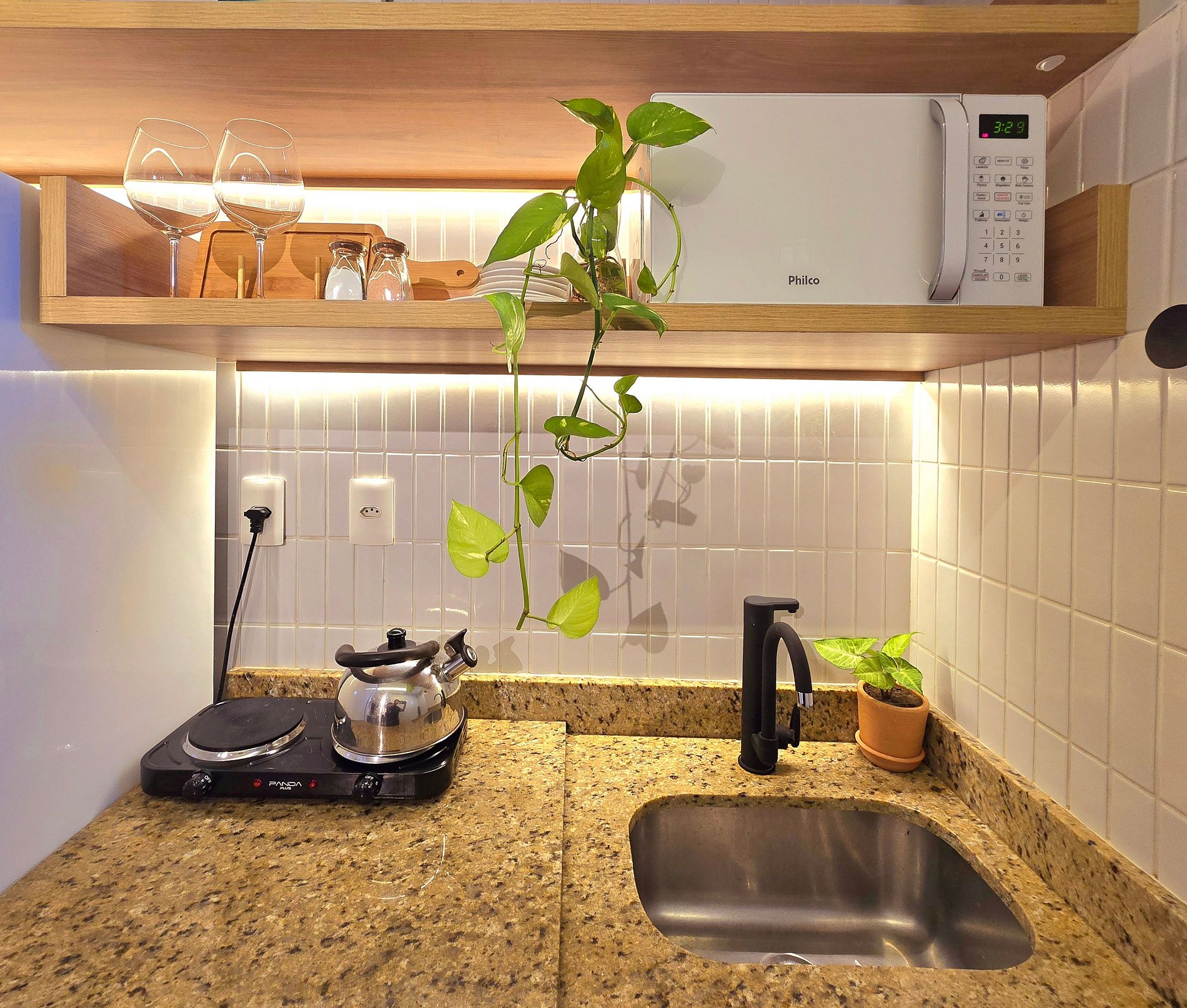 A cozinha, integrada e funcional, tem tudo o que você precisa: fogão, micro-ondas, geladeira, cafeteira, sanduicheira, liquidificador, pratos e utensílios. No quarto, uma cama de casal, TV e mais um ar-condicionado tornam o descanso ainda mais agradável.