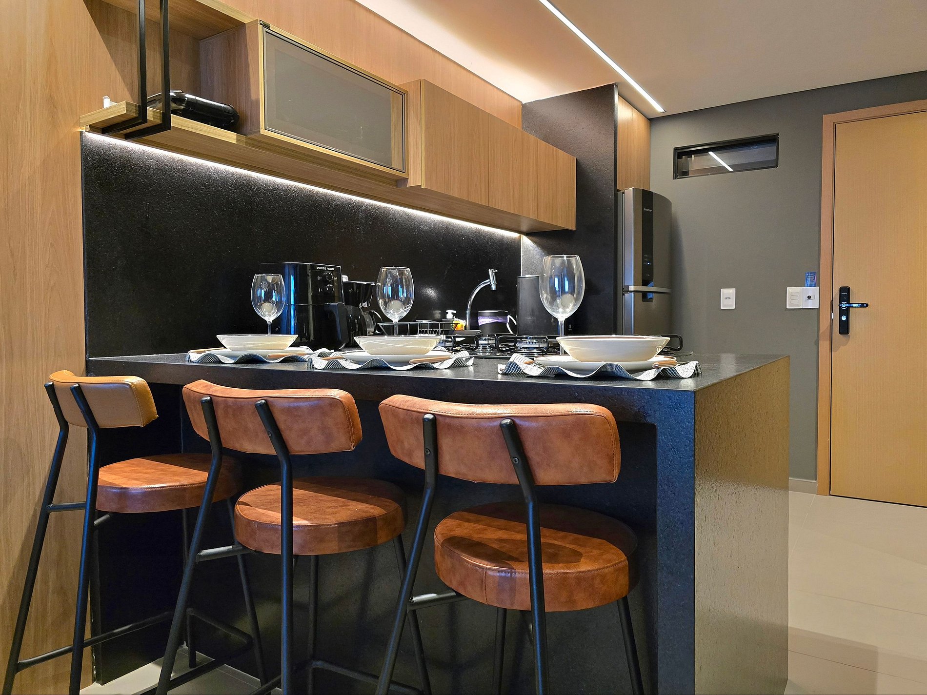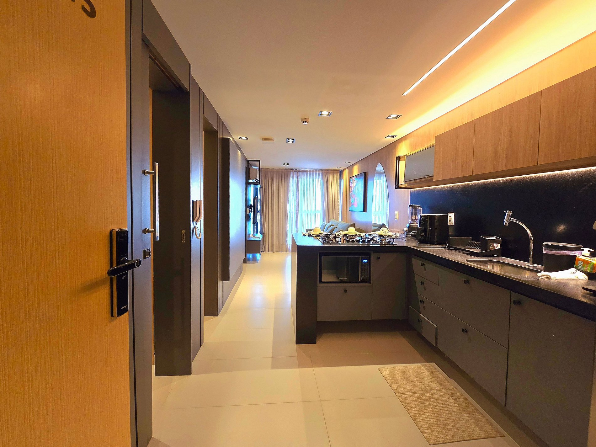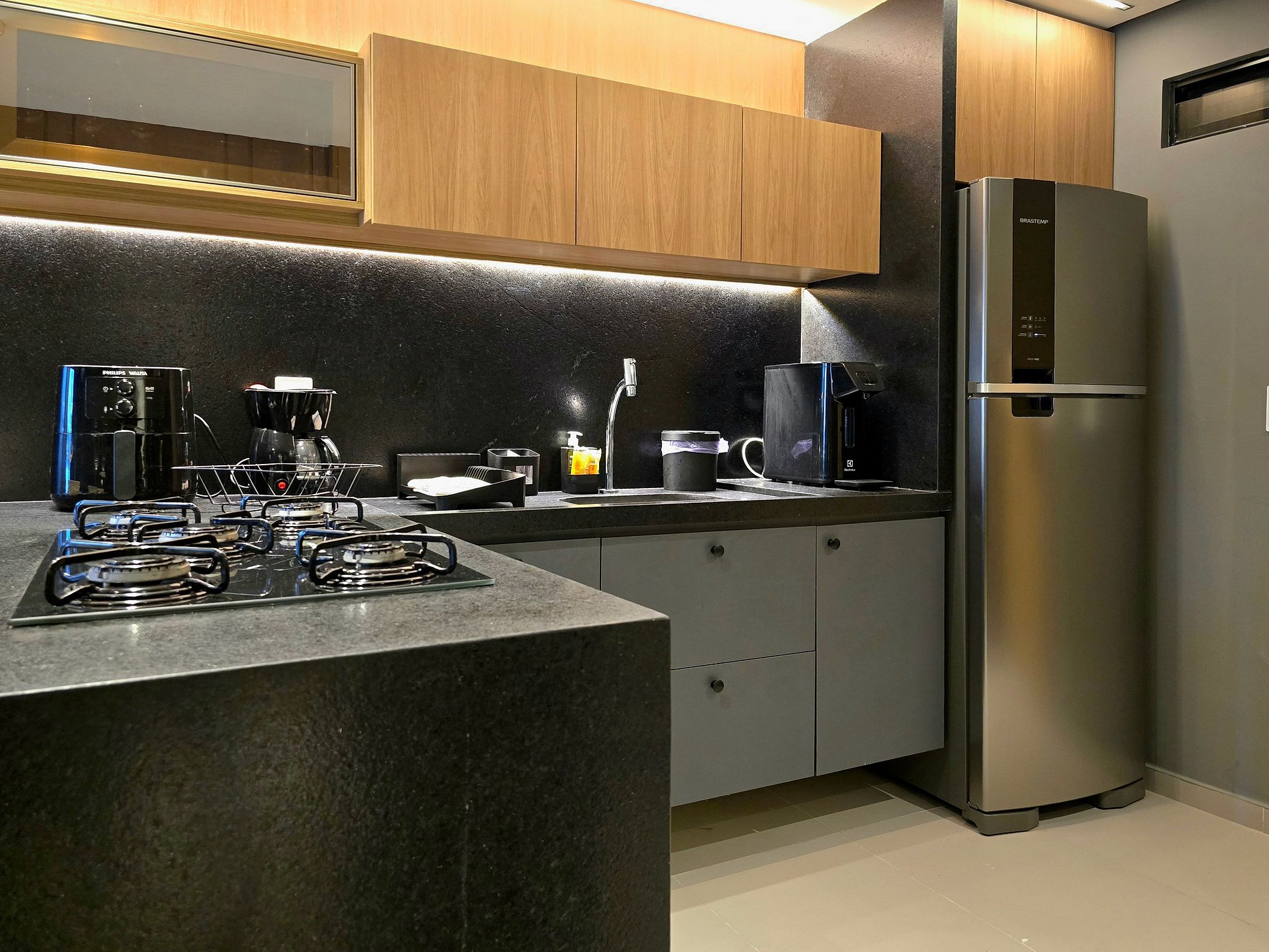 Aqui, tudo funciona com leveza: a sala climatizada com TV convida ao descanso, enquanto a cozinha americana — equipada com air fryer, sanduicheira, liquidificador, fogão, micro-ondas e utensílios completos — inspira cafés da manhã preguiçosos e jantares improvisados.