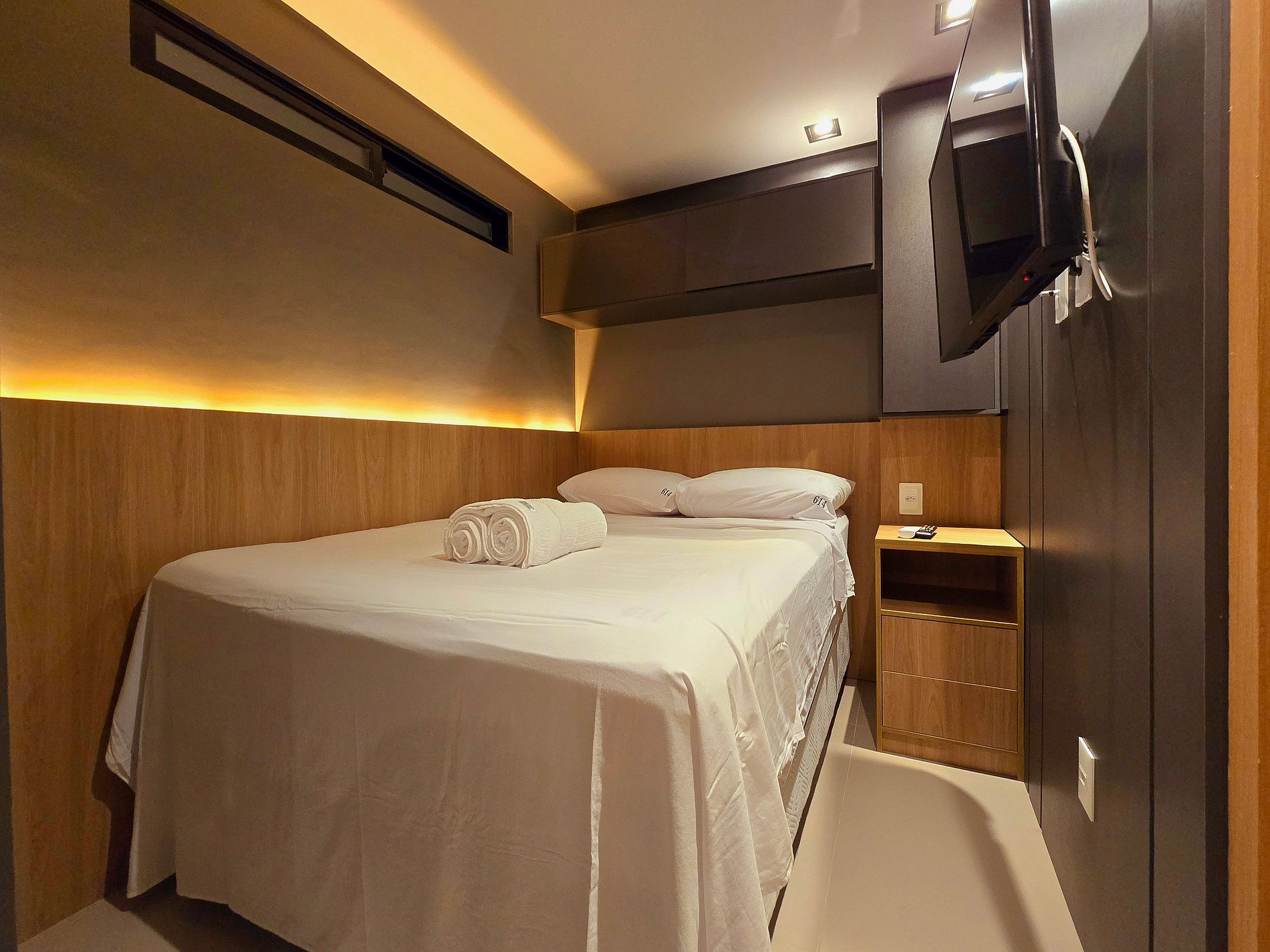 Na suíte principal, a cama de casal, a TV e o ar-condicionado compõem um refúgio acolhedor. A segunda suíte reversível é perfeita para garantir mais privacidade, com armários, climatização e TV também.